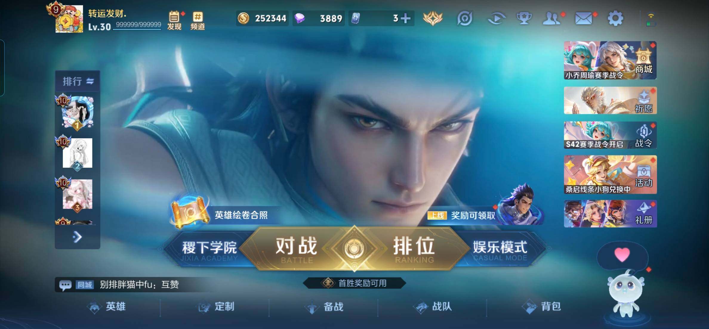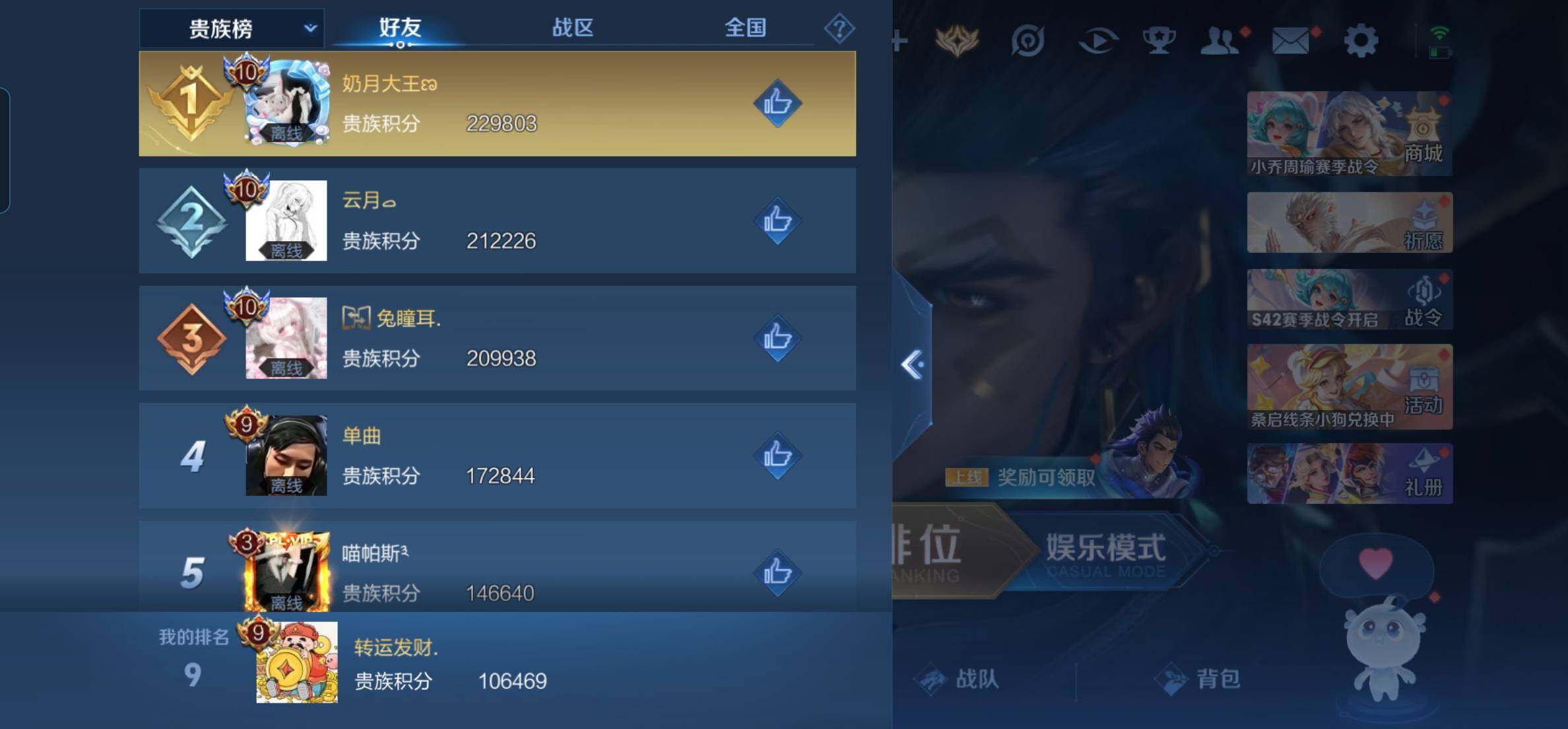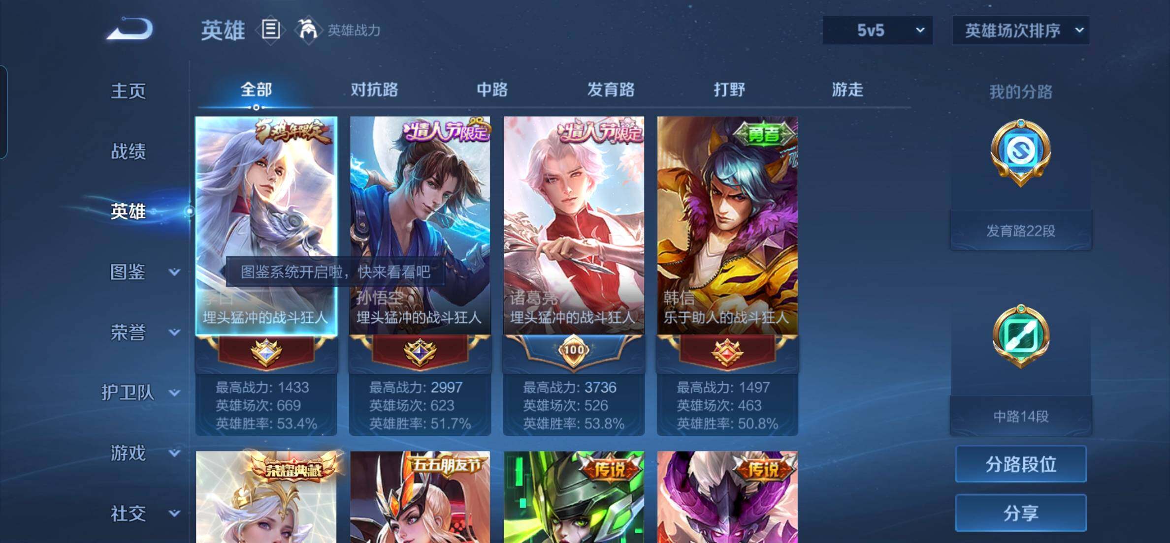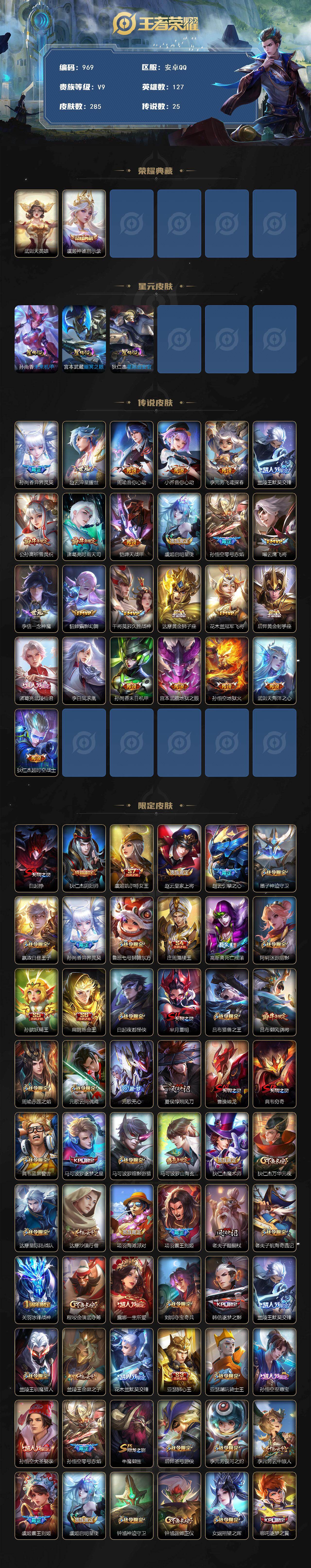 2376063-q-v9-最强王者段位-127英雄-285皮肤-1典藏皮肤-1典藏英雄-25传说-78史诗 【英雄全皮】:孙权全皮 【荣耀典藏】:武则天英雄,虞姬神鉴启示录 【传说皮肤】:孙尚香异界灵契,赵云淬星耀世,周瑜音你心动,小乔音你心动,李元芳飞鸢探春,兰陵王默契交锋,公孙离祈雪灵祝,诸葛亮时雨天司,铠绛天战甲,虞姬启明星使,孙悟空零号赤焰,曜云鹰飞将,李信一念神魔,貂蝉猫影幻舞,干