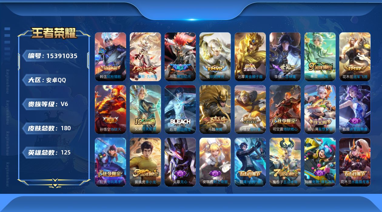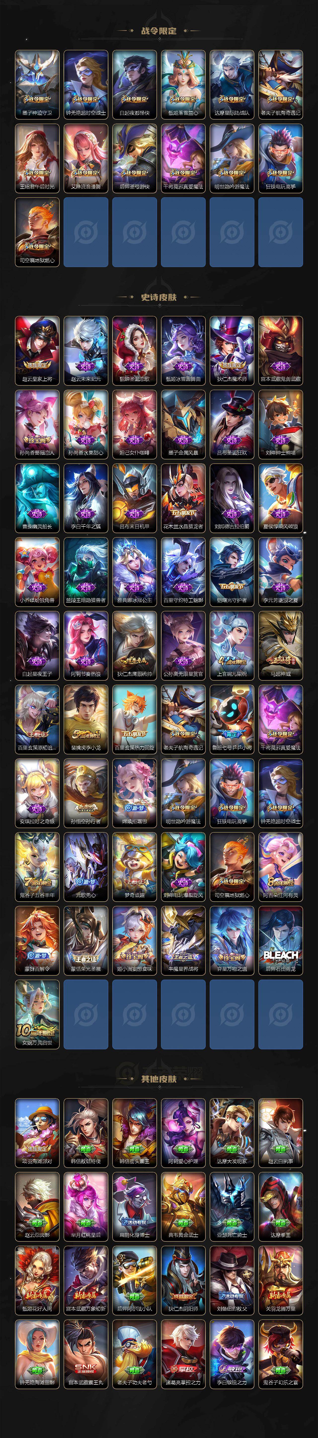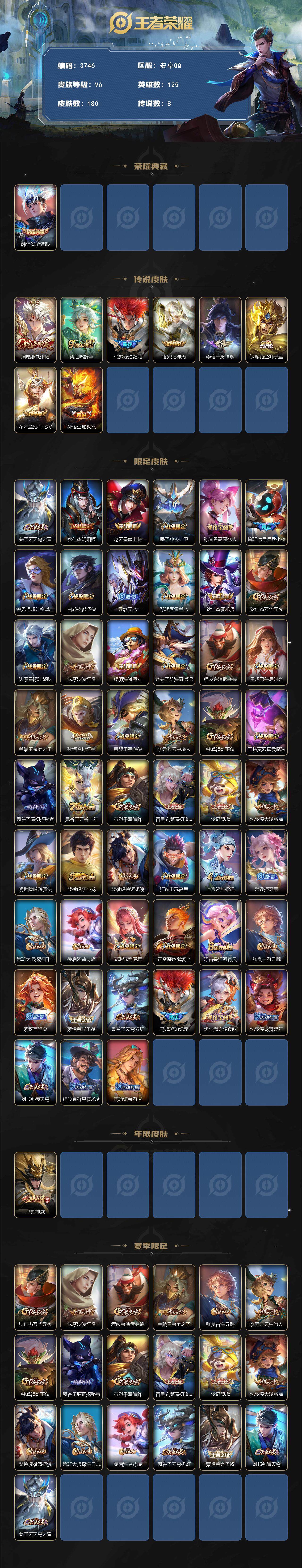[15391035]安卓q-v3-最强王者段位-125英雄-180皮肤-1典藏皮肤-8传说-55史诗 【英雄全皮】:达摩全皮,影全皮 【荣耀典藏】:韩信弑呛猎影 【传说皮肤】:澜愿照九州拓,桑启鸣野蒿,马超琥珀纪元,镜炽阳神光,李信一念神魔,达摩黄金狮子座,花木兰冠军飞将,孙悟空地狱火 【限定皮肤】:姜子牙天穹之誓,狄仁杰阴阳师,赵云皇家上将,墨子神迹守卫,孙尚香蔷薇恋人,鲁班七号乒乒小将,钟无艳超时空战士,白起夜都怪侠,元歌无心,甄姬落雪兰心,狄仁杰魔术师,狄仁杰万华元夜,达摩星际陆战队,达摩沙漠行僧,项羽海滩派对,老夫子航海奇遇记,程咬金演武夺筹,王昭君午后时光,兰陵王金庭之子,孙悟空孙行者,后羿圣弓游侠,李元芳云中旅人,钟馗驱傩正仪,干将莫邪真爱魔法,鬼谷子原初探秘者,鬼谷子五谷丰年,苏烈千军破阵,百里玄策原初追逐者,梦奇顽趣,沈梦溪大漠名商,明世隐吟游魔法,裴擒虎李小龙,裴擒虎擒涛扼浪,狂铁电玩高手,上官婉儿梁祝,嫦娥拒霜思,鲁班大师探海日志,桑启海盐诗旅,艾琳流音漫舞,司空震地狱燃心,阿古朵江河有灵,张良古海寻踪,蒙犽百解令,蒙恬荣光圣徽,鬼谷子天穹祈灯,马超琥珀纪元,姬小满妄想食味,沈梦溪龙舞盛年,刘邦剑破天穹,程咬金群星魔术团,周瑜熔金海岸 【年限皮肤】:马超神威 【赛季限定】:狄仁杰万华元夜,达摩沙漠行僧,程咬金演武夺筹,兰陵王金庭之子,张良古海寻踪,李元芳云中旅人,钟馗驱傩正仪,鬼谷子原初探秘者,苏烈千军破阵,百里玄策原初追逐者,梦奇顽趣,沈梦溪大漠名商,裴擒虎擒涛扼浪,鲁班大师探海日志,桑启海盐诗旅,鬼谷子天穹祈灯,蒙恬荣光圣徽,刘邦剑破天穹,姜子牙天穹之誓 【战令限定】:墨子神迹守卫,钟无艳超时空战士,白起夜都怪侠,甄姬落雪兰心,达摩星际陆战队,老夫子航海奇遇记,王昭君午后时光,艾琳流音漫舞,后羿圣弓游侠,干将莫邪真爱魔法,明世隐吟游魔法,狂铁电玩高手,司空震地狱燃心 【史诗皮肤】:赵云皇家上将,赵云未来纪元,貂蝉圣诞恋歌,甄姬冰雪圆舞曲,狄仁杰魔术师,宫本武藏鬼剑武藏,孙尚香蔷薇恋人,孙尚香水果甜心,妲己女仆咖啡,墨子金属风暴,吕布圣诞狂欢,刘禅绅士熊喵,曹操幽灵船长,李白千年之狐,吕布末日机甲,花木兰水晶猎龙者,刘邦德古拉伯爵,夏侯惇乘风破浪,小乔缤纷独角兽,兰陵王暗隐猎兽者,雅典娜冰冠公主,百里守约特工魅影,铠曙光守护者,李元芳逐浪之夏,白起星夜王子,阿轲