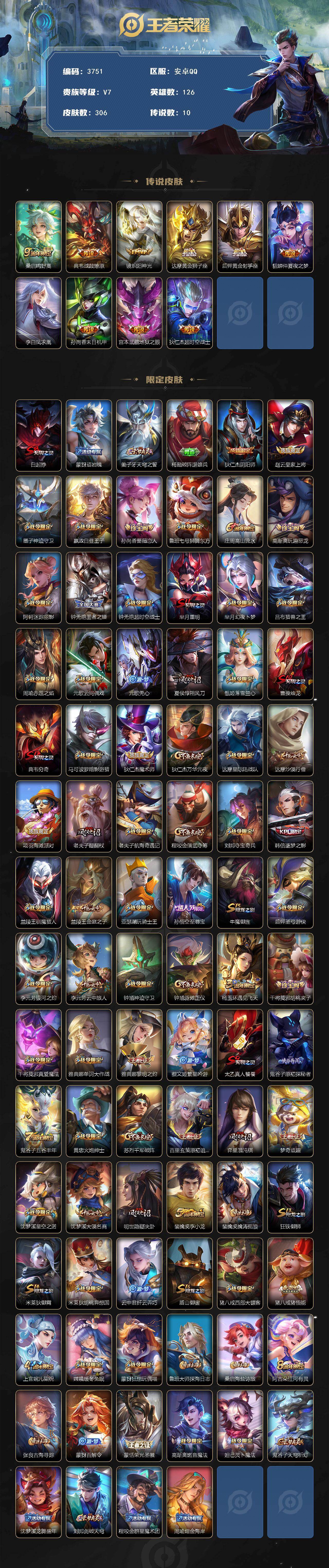 [15391048]安卓q-v7-永恒钻石ii段位-126英雄-306皮肤-10传说-87史诗 【英雄全皮】:钟馗全皮,猪八戒全皮,空空儿全皮 【传说皮肤】:桑启鸣野蒿,典韦战鼓燎原,镜炽阳神光,达摩黄金狮子座,后羿黄金射手座,貂蝉仲夏夜之梦,李白凤求凰,孙尚香末日机甲,宫本武藏地狱之眼,狄仁杰超时空战士 【限定皮肤】:白起狰,蒙犽顽岩魄,姜子牙天穹之誓,杨戬破阵退雄兵,狄仁杰阴阳师,赵云皇家上将,墨子神迹守卫,嬴政白昼王子,孙尚香蔷薇恋人,鲁班七号狮舞东方,庄周高山流水,高渐离玩趣恶龙,阿轲迷踪丽影,钟无艳王者之锤,钟无艳超时空战士,芈月重明,芈月幻夜卜梦,吕布猎兽之王,周瑜赤莲之焰,元歌云间偶戏,元歌无心,夏侯惇朔风刀,甄姬落雪兰心,曹操烛龙,典韦穷奇,马可波罗暗影游猎,狄仁杰魔术师,狄仁杰万华元夜,达摩星际陆战队,达摩沙漠行僧,项羽海滩派对,老夫子醍醐杖,老夫子航海奇遇记,程咬金演武夺筹,刘邦夺宝奇兵,韩信逐梦之影,兰陵王驯魔猎人,兰陵王金庭之子,亚瑟潮玩骑士王,孙悟空至尊宝,牛魔御旌,后羿圣弓游侠,李元芳银河之约,李元芳云中旅人,钟馗神迹守卫,钟馗驱傩正仪,杨玉环遇见飞天,干将莫邪胡桃夹子,干将莫邪真爱魔法,雅典娜单词大作战,雅典娜黎明之约,蔡文姬繁星吟游,太乙真人饕餮,鬼谷子原初探秘者,鬼谷子五谷丰年,黄忠火炮绅士,苏烈千军破阵,百里玄策原初追逐者,弈星混沌棋,梦奇顽趣,沈梦溪星空之诺,沈梦溪大漠名商,明世隐疑决卦,裴擒虎李小龙,裴擒虎擒涛扼浪,狂铁御狮,米莱狄御霄,米莱狄胡桃异想国,云中君纤云弄巧,盾山御銮,猪八戒西部大镖客,猪八戒猪悟能,上官婉儿梁祝,嫦娥暖冬兔眠,蒙犽狂想玩偶喵,鲁班大师探海日志,桑启海盐诗旅,阿古朵江河有灵,张良古海寻踪,蒙犽百解令,蒙恬荣光圣徽,高渐离燃音魔法,妲己灵卜魔法,鬼谷子天穹祈灯,沈梦溪龙舞盛年,刘邦剑破天穹,程咬金群星魔术团,周瑜熔金海岸 【年限皮肤】:李白凤求凰 【赛季限定】:白起狰,芈月重明,夏侯惇朔风刀,曹操烛龙,典韦穷奇,狄仁杰万华元夜,达摩沙漠行僧,老夫子醍醐杖,程咬金演武夺筹,兰陵王金庭之子,张良古海寻踪,牛魔御旌,李元芳云中旅人,钟馗驱傩正仪,雅典娜黎明之约,太乙真人饕餮,鬼谷子原初探秘者,苏烈千军破阵,百里玄策原初追逐者,弈星混沌棋,梦奇顽趣,沈梦溪大漠名商,明世隐疑决卦,裴擒虎擒涛扼浪,狂铁御狮,米莱狄御霄,盾山御銮,