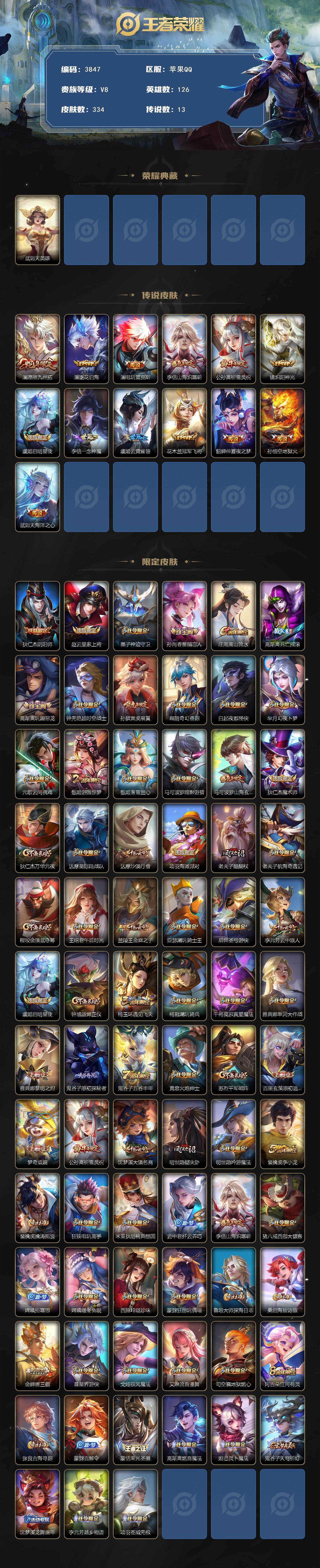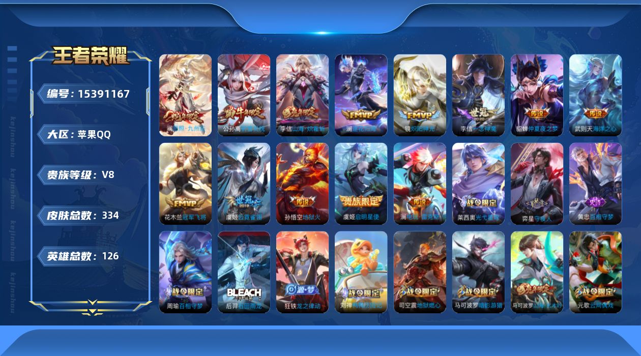 [15391167]苹果q-v8-最强王者段位-126英雄-334皮肤-1典藏英雄-13传说-83史诗 【英雄全皮】:李信全皮,蒙恬全皮,澜全皮,金蝉全皮,莱西奥全皮,空空儿全皮,影全皮 【荣耀典藏】:武则天英雄 【传说皮肤】:澜愿照九州拓,澜逐花归海,澜电玩雷克斯,李信山海炽霜斩,公孙离祈雪灵祝,镜炽阳神光,虞姬启明星使,李信一念神魔,虞姬云霓雀翎,花木兰冠军飞将,貂蝉仲夏夜之梦,孙悟空地狱火,武则天海洋之心 【限定皮肤】:狄仁杰阴阳师,赵云皇家上将,墨子神迹守卫,孙尚香蔷薇恋人,庄周高山流水,高渐离死亡摇滚,高渐离玩趣恶龙,钟无艳超时空战士,孙膑寅虎展翼,扁鹊奇幻香踪,白起夜都怪侠,芈月幻夜卜梦,元歌云间偶戏,甄姬游园惊梦,甄姬落雪兰心,马可波罗暗影游猎,马可波罗山海玄木吟,狄仁杰魔术师,狄仁杰万华元夜,达摩星际陆战队,达摩沙漠行僧,项羽海滩派对,老夫子醍醐杖,老夫子航海奇遇记,程咬金演武夺筹,王昭君午后时光,兰陵王金庭之子,亚瑟潮玩骑士王,后羿圣弓游侠,李元芳云中旅人,虞姬启明星使,钟馗驱傩正仪,杨玉环遇见飞天,杨戬潮玩骑兵,干将莫邪真爱魔法,雅典娜单词大作战,雅典娜黎明之约,鬼谷子原初探秘者,鬼谷子五谷丰年,黄忠火炮绅士,苏烈千军破阵,百里玄策原初追逐者,梦奇顽趣,公孙离祈雪灵祝,沈梦溪大漠名商,明世隐疑决卦,明世隐吟游魔法,裴擒虎李小龙,裴擒虎擒涛扼浪,狂铁电玩高手,米莱狄胡桃异想国,云中君纤云弄巧,李信山海炽霜斩,猪八戒西部大镖客,嫦娥拒霜思,嫦娥暖冬兔眠,西施玲珑珍味,蒙犽狂想玩偶喵,鲁班大师探海日志,桑启海盐诗旅,金蝉唐三藏,暃星界游侠,戈娅驭风魔法,艾琳流音漫舞,司空震地狱燃心,阿古朵江河有灵,张良古海寻踪,蒙犽百解令,蒙恬荣光圣徽,高渐离燃音魔法,妲己灵卜魔法,鬼谷子天穹祈灯,沈梦溪龙舞盛年,李元芳蔬乡物语,项羽苍威无极 【年限皮肤】:孙膑寅虎展翼,公孙离祈雪灵祝,马可波罗山海玄木吟,李信山海炽霜斩 【赛季限定】:狄仁杰万华元夜,达摩沙漠行僧,老夫子醍醐杖,程咬金演武夺筹,兰陵王金庭之子,张良古海寻踪,李元芳云中旅人,钟馗驱傩正仪,雅典娜黎明之约,鬼谷子原初探秘者,苏烈千军破阵,百里玄策原初追逐者,梦奇顽趣,沈梦溪大漠名商,明世隐疑决卦,裴擒虎擒涛扼浪,鲁班大师探海日志,桑启海盐诗旅,鬼谷子天穹祈灯,蒙恬荣光圣徽 【战令限定】:墨子神迹守卫,钟无艳超时空战士,扁鹊