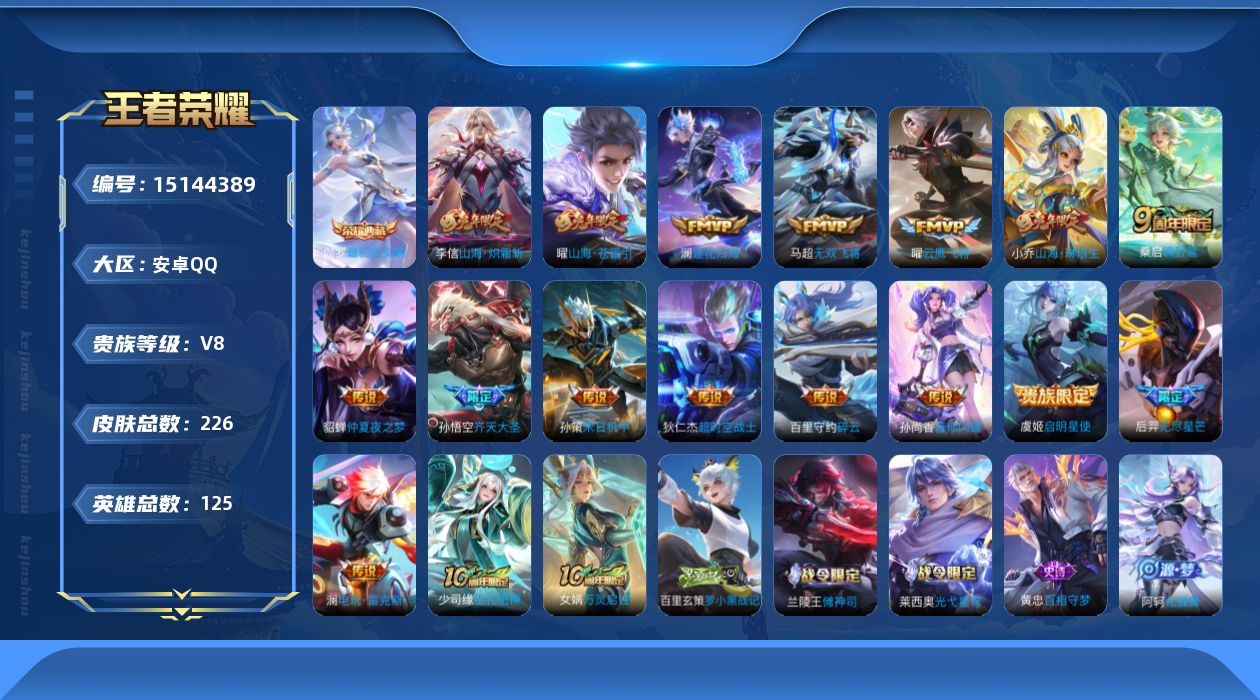 [15144389]安卓q-v8-最强王者段位-125英雄-226皮肤-1典藏皮肤-16传说-64史诗 【英雄全皮】:孙权全皮,空空儿全皮 【荣耀典藏】:伽罗最初的交响 【传说皮肤】:桑启鸣野蒿,澜逐花归海,澜电玩雷克斯,孙悟空齐天大圣,小乔山海琳琅生,曜山海苍雷引,李信山海炽霜斩,百里守约碎云,孙尚香音你闪耀,后羿无尽星芒,马超无双飞将,孙策末日机甲,虞姬启明星使,曜云鹰飞将,貂蝉仲夏夜之梦,狄仁杰超时空战士 【限定皮肤】:蒙犽顽岩魄,虞姬夏日便利店,姜子牙天穹之誓,狄仁杰阴阳师,小乔山海琳琅生,赵云皇家上将,高渐离玩趣恶龙,扁鹊奇幻香踪,马可波罗山海玄木吟,狄仁杰魔术师,达摩沙漠行僧,项羽海滩派对,王昭君午后时光,兰陵王金庭之子,孙悟空齐天大圣,后羿无尽星芒,李元芳云中旅人,虞姬启明星使,杨戬潮玩骑兵,鬼谷子五谷丰年,沈梦溪大漠名商,裴擒虎擒涛扼浪,狂铁电玩高手,瑶山海碧波行,云中君时之祈愿,李信山海炽霜斩,上官婉儿梁祝,嫦娥暖冬兔眠,曜山海苍雷引,西施玲珑珍味,鲁班大师探海日志,桑启海盐诗旅,暃星界游侠,戈娅驭风魔法,阿古朵江河有灵,张良古海寻踪,蒙犽百解令,蒙恬荣光圣徽,鬼谷子天穹祈灯,姬小满妄想食味,沈梦溪龙舞盛年,刘邦剑破天穹,上官婉儿群星魔术团,程咬金群星魔术团,周瑜熔金海岸 【年限皮肤】:瑶山海碧波行,马可波罗山海玄木吟,李信山海炽霜斩,小乔山海琳琅生,曜山海苍雷引 【赛季限定】:达摩沙漠行僧,兰陵王金庭之子,张良古海寻踪,李元芳云中旅人,沈梦溪大漠名商,裴擒虎擒涛扼浪,鲁班大师探海日志,桑启海盐诗旅,鬼谷子天穹祈灯,蒙恬荣光圣徽,刘邦剑破天穹,姜子牙天穹之誓 【战令限定】:虞姬夏日便利店,扁鹊奇幻香踪,王昭君午后时光,杨戬潮玩骑兵,狂铁电玩高手,嫦娥暖冬兔眠,西施玲珑珍味,暃星界游侠,戈娅驭风魔法 【史诗皮肤】:露娜紫霞仙子,赵云皇家上将,赵云未来纪元,貂蝉圣诞恋歌,甄姬冰雪圆舞曲,王昭君偶像歌手,狄仁杰魔术师,宫本武藏鬼剑武藏,孙尚香水果甜心,嬴政摇滚巨星,妲己魅力维加斯,妲己女仆咖啡,墨子金属风暴,李白千年之狐,张飞乱世虎臣,夏侯惇乘风破浪,小乔缤纷独角兽,兰陵王暗隐猎兽者,诸葛亮黄金分割率,亚瑟心灵战警,雅典娜冰冠公主,安琪拉心灵骇客,铠曙光守护者,蔡文姬舞动绿茵,李元芳逐浪之夏,白起星夜王子,阿轲节奏热浪,孙策猫狗日记,狄仁杰鹰眼统帅,上官婉儿梁祝,不知火舞