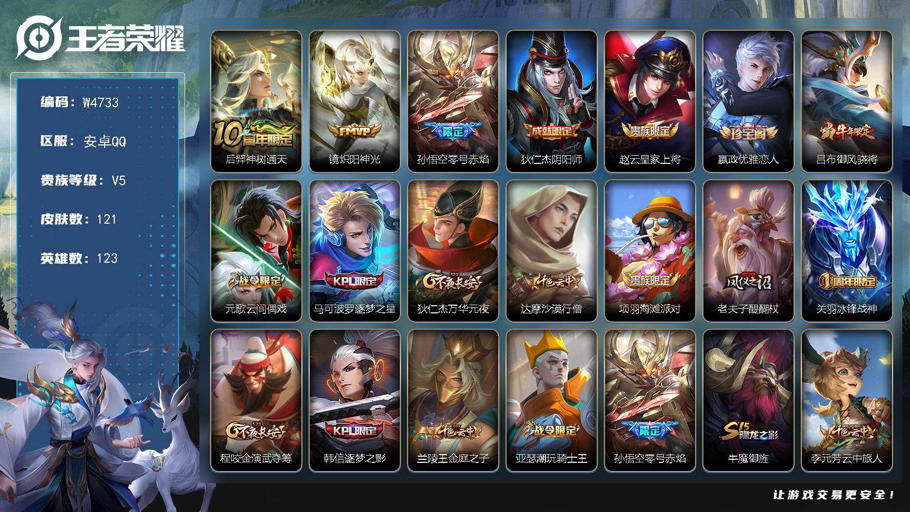 【w4733】极品低场次开局号-(热门皮肤)零号赤焰.炽阳神光.逐梦之影.冰锋战神.安卓q-不可二次-贵5-123英雄-121皮肤-3传说-43限定-4个性按键.贵族积分8742-营地id:1894556247