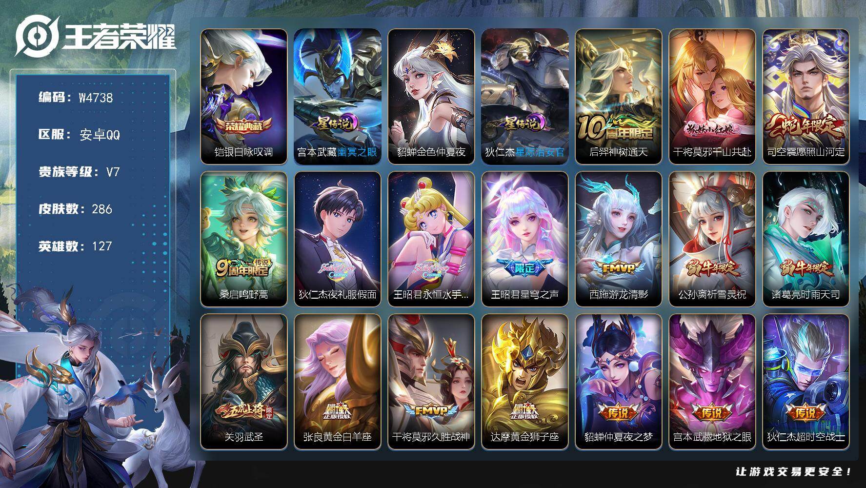 【w4738】安卓q区-可二次-贵7-127英雄-286皮肤-1典藏-17传说-3星元-6按键-银白咏叹调/原照·山河定/千山共赴/夜礼服假面/永恒水手月亮/时雨天司/游龙清影/祈雪灵祝/武圣/地狱之眼/涂山红红/器灵·浮梦炉/山海·玄木吟-贵族积分3.8w-营地id:1741836861 【星元皮肤】:宫本武藏幽冥之眼,狄仁杰星际治安官,貂蝉金色仲夏夜