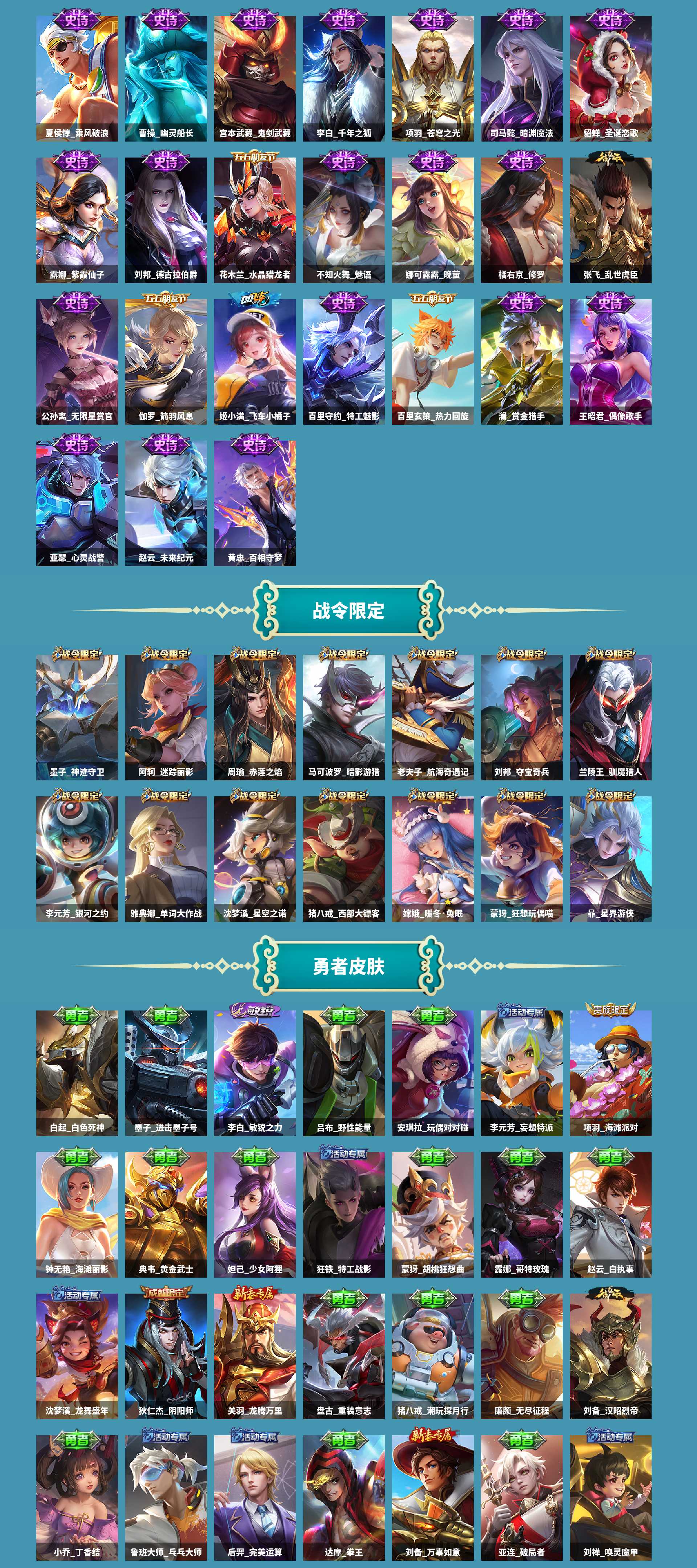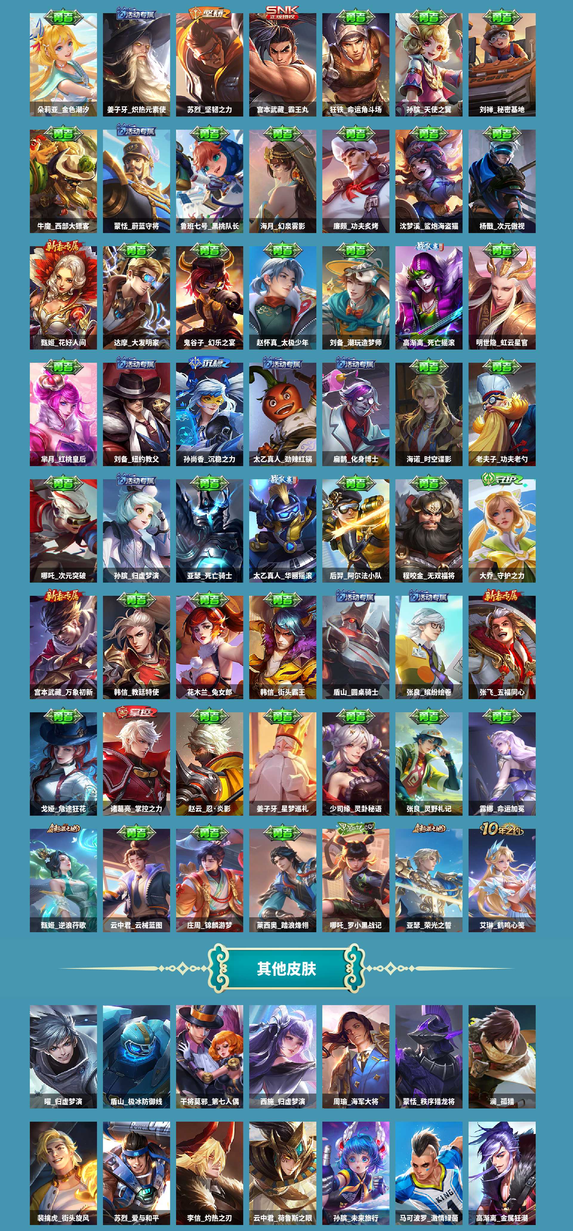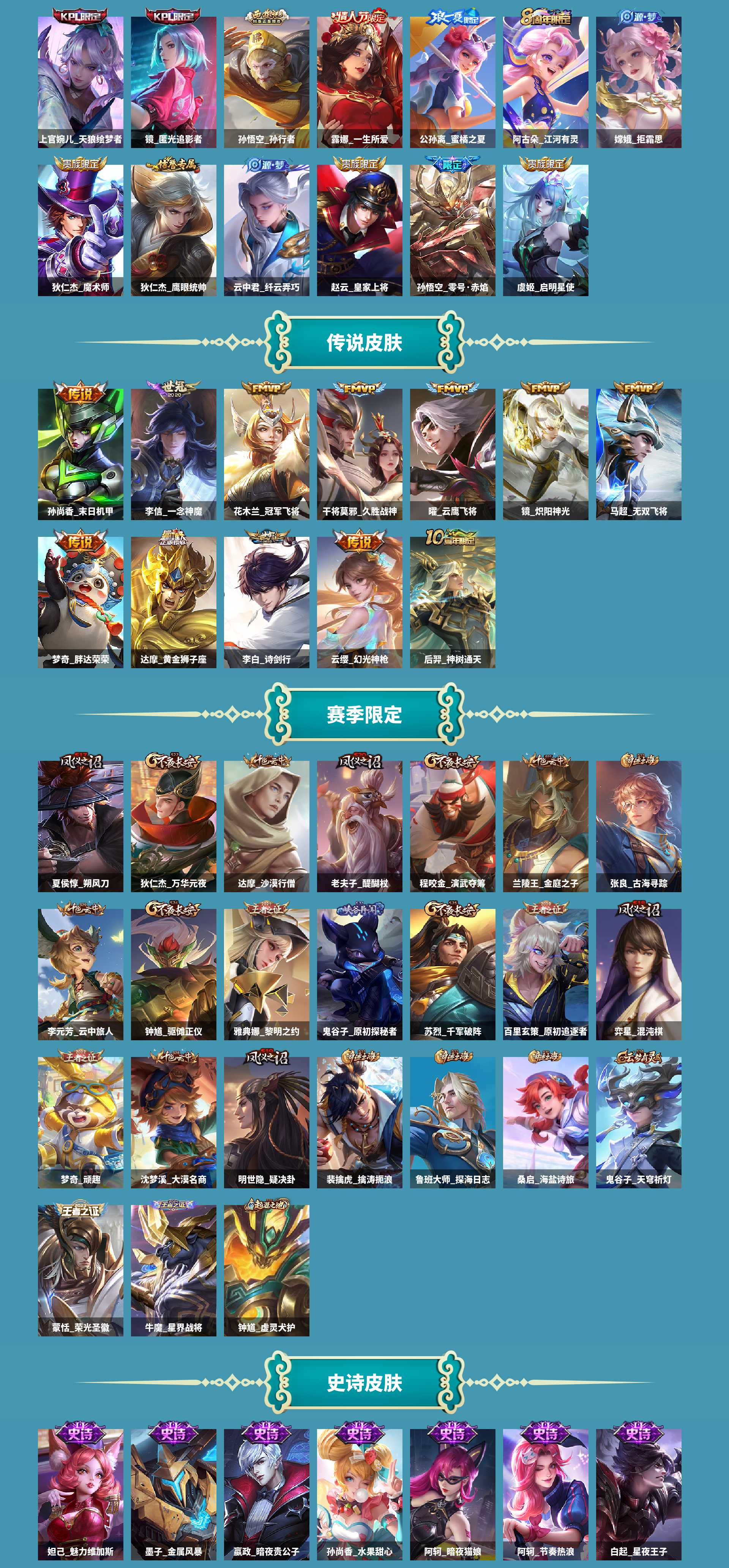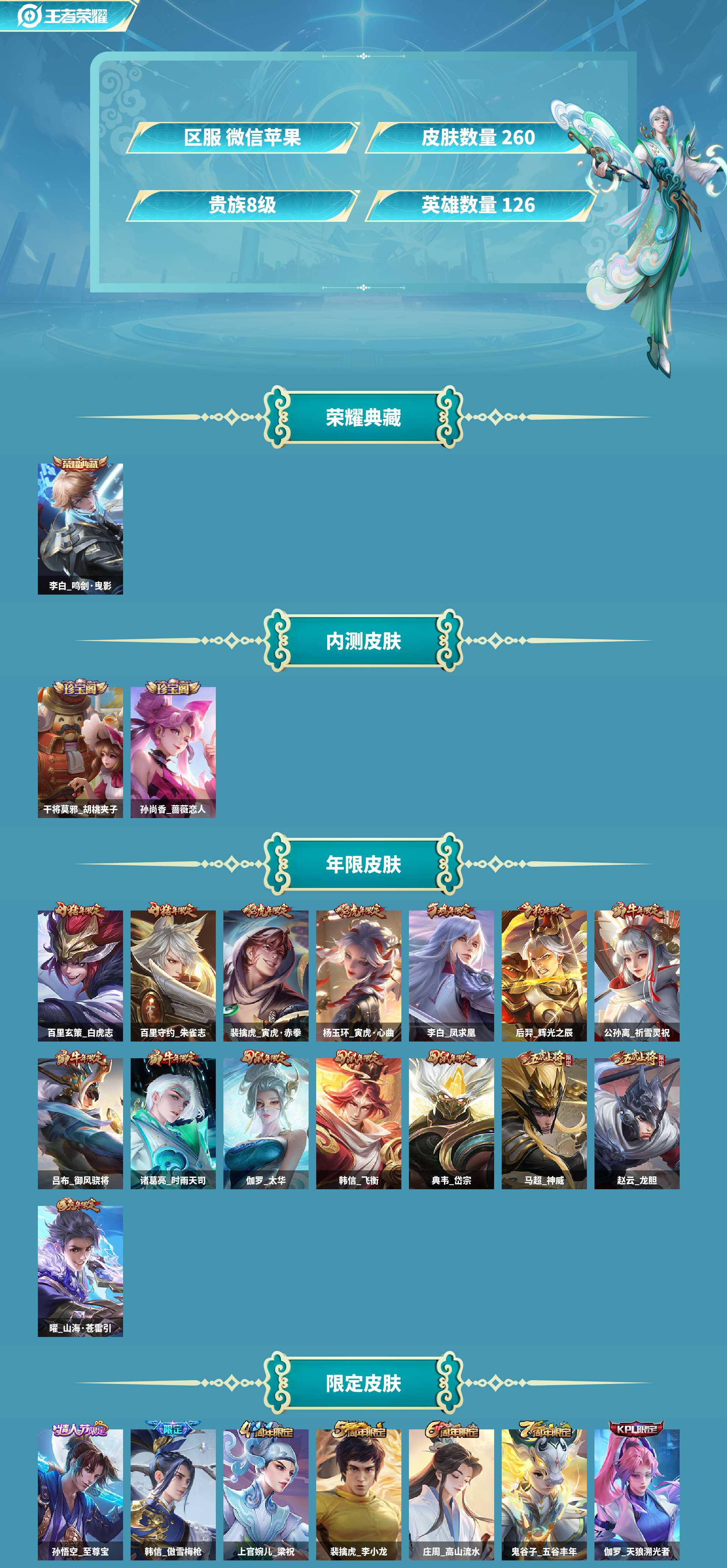 al652756 【特价打野野王号 小国标玄策 小魔方 1水21传说打野号】 皮肤数260 无双皮肤数0 传说皮肤数21 珍品传说皮数0 史诗皮肤数71 英雄数126 营地id96778349 贵族等级【文本】贵族8级 【贵族8级】 荣耀典藏1 内测皮肤2 年限皮肤15 限定皮肤80 赛季限定26 史诗皮肤70 战令限定14 勇者皮肤111 其他皮肤56 荣耀典藏:李白鸣剑曳影; 内测皮肤:干将莫邪胡桃夹子,孙尚香蔷薇恋人; 年限皮肤:赵云龙胆,曜山海苍雷引,裴擒虎寅虎赤拳,杨玉环寅虎心曲,诸葛亮时雨天司,吕布御风骁将,公孙离祈雪灵祝,百里守约朱雀志,百里玄策白虎志,马超神威,典韦岱宗,后羿辉光之辰,韩信飞衡,伽罗太华,李白凤求凰; 限定皮肤:沈梦溪龙舞盛年,牛魔星界战将,鬼谷子天穹祈灯,蒙恬荣光圣徽,阿古朵江河有灵,张良古海寻踪,鲁班大师探海日志,裴擒虎擒涛扼浪,赵云龙胆,暃星界游侠,干将莫邪胡桃夹子,桑启海盐诗旅,曜山海苍雷引,嫦娥暖冬兔眠,梦奇顽趣,虞姬启明星使,孙悟空孙行者,鬼谷子五谷丰年,李元芳云中旅人,沈梦溪大漠名商,兰陵王金庭之子,韩信傲雪梅呛,露娜一生所爱,裴擒虎寅虎赤拳,杨玉环寅虎心曲,镜匿光追影者,达摩沙漠行僧,雅典娜黎明之约,嫦娥拒霜思,庄周高山流水,上官婉儿梁祝,苏烈千军破阵,老夫子航海奇遇记,墨子神迹守卫,公孙离蜜橘之夏,孙尚香蔷薇恋人,钟馗驱傩正仪,伽罗天狼溯光者,程咬金演武夺筹,高渐离死亡摇滚,诸葛亮时雨天司,吕布御风骁将,公孙离祈雪灵祝,狄仁杰万华元夜,孙悟空零号赤焰,云中君纤云弄巧,蒙犽狂想玩偶喵,百里守约朱雀志,裴擒虎李小龙,百里玄策白虎志,鬼谷子原初探秘者,雅典娜单词大作战,百里玄策原初追逐者,马可波罗暗影游猎,太乙真人华丽摇滚,猪八戒西部大镖客,老夫子醍醐杖,马超神威,上官婉儿天狼绘梦者,阿轲迷踪丽影,孙悟空至尊宝,明世隐疑决卦,刘邦夺宝奇兵,李元芳银河之约,狄仁杰魔术师,典韦岱宗,后羿辉光之辰,韩信飞衡,狄仁杰阴阳师,赵云皇家上将,伽罗太华,李白凤求凰,弈星混沌棋,项羽海滩派对,沈梦溪星空之诺,狄仁杰鹰眼统帅,兰陵王驯魔猎人,周瑜赤莲之焰,夏侯惇朔风刀,钟馗虚灵犬护; 赛季限定:牛魔星界战将,亚瑟荣光之誓,甄姬逆浪荇歌,鬼谷子天穹祈灯,蒙恬荣光圣徽,张良古海寻踪,鲁班大师探海日志,裴擒虎擒涛扼浪,桑启海盐诗旅,梦奇顽趣,李元芳云中旅人,沈梦溪大漠名商,兰陵王金庭之子,达摩沙漠行僧,雅典娜黎明之约,苏烈千军破阵,钟馗驱傩正仪,程咬金演武夺筹,狄仁杰万华元夜,鬼谷子原初探秘者,百里玄策原初追逐者,老夫子醍醐杖,明世隐疑决卦,弈星混沌棋,夏侯惇朔风刀,钟馗虚灵犬护; 史诗皮肤:牛魔星界战将,黄忠百相守梦,张飞乱世虎臣,公孙离无限星赏官,蒙恬荣光圣徽,阿古朵江河有灵,赵云龙胆,暃星界游侠,阿轲节奏热浪,曹操幽灵船长,阿轲暗夜猫娘,王昭君偶像歌手,梦奇顽趣,孙悟空孙行者,鬼谷子五谷丰年,夏侯惇乘风破浪,宫本武藏鬼剑武藏,澜赏金猎手,韩信傲雪梅呛,露娜一生所爱,杨玉环寅虎心曲,镜匿光追影者,项羽苍穹之光,雅典娜黎明之约,娜可露露晚萤,司马懿暗渊魔法,嫦娥拒霜思,墨子金属风暴,庄周高山流水,上官婉儿梁祝,刘邦德古拉伯爵,老夫子航海奇遇记,公孙离蜜橘之夏,孙尚香蔷薇恋人,伽罗天狼溯光者,百里玄策热力回旋,亚瑟心灵战警,孙尚香水果甜心,李白千年之狐,赵云未来纪元,吕布御风骁将,不知火舞魅语,貂蝉圣诞恋歌,云中君纤云弄巧,蒙犽狂想玩偶喵,白起星夜王子,百里守约朱雀志,裴擒虎李小龙,露娜紫霞仙子,百里玄策原初追逐者,马可波罗暗影游