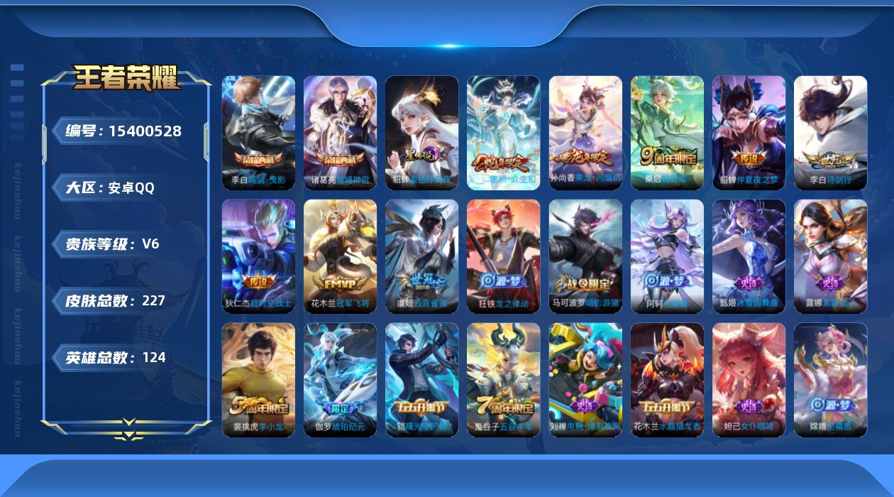 [15400528],v6-227皮肤-2典藏-8传说-55史诗,xl2028 【荣耀典藏】:李白鸣剑曳影,诸葛亮星域神启 【内测皮肤】:嬴政优雅恋人,艾琳女武神,狂铁特工战影 【传说皮肤】:狄仁杰超时空战士,貂蝉仲夏夜之梦,花木兰冠军飞将,虞姬云霓雀翎,李白诗剑行,孙尚香乘龙问璇玑,桑启鸣野蒿,妲己愿照众生和 【限定皮肤】:白起狰,蒙犽顽岩魄,蔡文姬夏日便利店,虞姬夏日便利店,姜子牙天穹之誓,狄仁杰阴阳师,赵云皇家上将,嬴政优雅恋人,庄周高山流水,高渐离死亡摇滚,钟无艳王者之锤,芈月重明,夏侯惇朔风刀,甄姬游园惊梦,曹操烛龙,典韦穷奇,马可波罗暗影游猎,狄仁杰魔术师,狄仁杰万华元夜,达摩沙漠行僧,项羽海滩派对,老夫子醍醐杖,程咬金演武夺筹,兰陵王金庭之子,牛魔御旌,李元芳云中旅人,钟馗驱傩正仪,杨玉环遇见飞天,雅典娜黎明之约,蔡文姬繁星吟游,太乙真人饕餮,鬼谷子原初探秘者,鬼谷子五谷丰年,苏烈千军破阵,百里玄策原初追逐者,弈星混沌棋,梦奇顽趣,明世隐疑决卦,裴擒虎李小龙,裴擒虎擒涛扼浪,狂铁御狮,米莱狄御霄,云中君纤云弄巧,盾山御銮,上官婉儿梁祝,嫦娥拒霜思,鲁班大师探海日志,桑启海盐诗旅,艾琳女武神,阿古朵江河有灵,张良古海寻踪,蒙犽百解令,蒙恬荣光圣徽,鬼谷子天穹祈灯,伽罗琥珀纪元,孙尚香乘龙问璇玑,沈梦溪龙舞盛年,刘邦剑破天穹,程咬金群星魔术团,镜青焰无极,项羽苍威无极,周瑜熔金海岸 【年限皮肤】:孙尚香乘龙问璇玑 【赛季限定】:白起狰,芈月重明,夏侯惇朔风刀,曹操烛龙,典韦穷奇,狄仁杰万华元夜,达摩沙漠行僧,老夫子醍醐杖,程咬金演武夺筹,兰陵王金庭之子,张良古海寻踪,牛魔御旌,李元芳云中旅人,钟馗驱傩正仪,雅典娜黎明之约,太乙真人饕餮,鬼谷子原初探秘者,苏烈千军破阵,百里玄策原初追逐者,弈星混沌棋,梦奇顽趣,明世隐疑决卦,裴擒虎擒涛扼浪,狂铁御狮,米莱狄御霄,盾山御銮,鲁班大师探海日志,桑启海盐诗旅,鬼谷子天穹祈灯,蒙恬荣光圣徽,刘邦剑破天穹,姜子牙天穹之誓 【战令限定】:蔡文姬夏日便利店,虞姬夏日便利店,马可波罗暗影游猎,镜青焰无极,项羽苍威无极 【史诗皮肤】:项羽苍穹之光,露娜紫霞仙子,钟无艳王者之锤,赵云皇家上将,貂蝉圣诞恋歌,甄姬冰雪圆舞曲,狄仁杰魔术师,廉颇地狱岩魂,宫本武藏鬼剑武藏,孙尚香水果甜心,嬴政优雅恋人,妲己魅力维加斯,妲己女仆咖啡,墨子金属风暴,吕布圣
