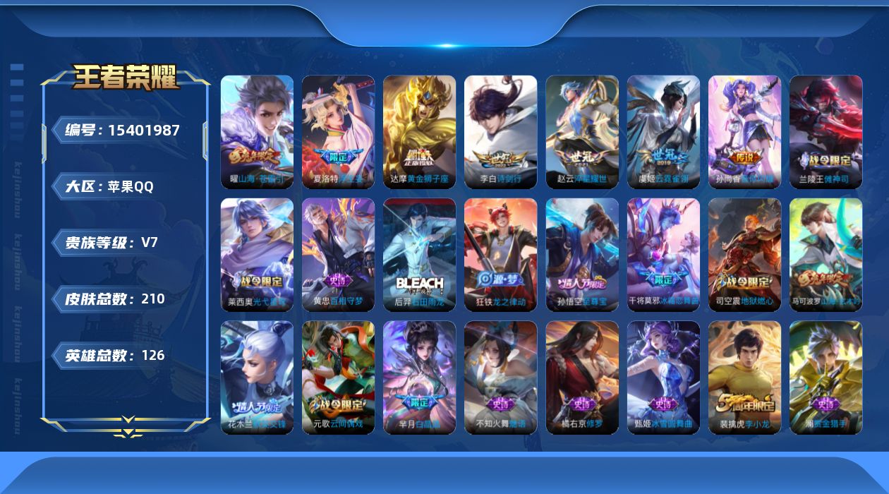 [15401987]v7 8传说 126英雄 210皮肤 可修改实名 【英雄全皮】:敖隐全皮 【稀有英雄】:敖隐小龙人大司命韩信韩跳跳夏洛特夏师傅艾琳橘右京橘子娜可露露鸟人不知火舞赵云金蝉唐僧戈娅 【传说皮】:神树通天黄金狮子座云霓雀翎淬星耀世音你闪耀rap皮山海·苍雷引电光曜子浮生妄 【珍宝阁皮】:玩趣恶龙 【赛季/战令皮】:古海寻踪s33星界游侠海盐诗旅s30擒涛扼浪s31探海日志s32流音漫舞地狱燃心剑破天穹s35天穹祈灯s34青焰无极苍威无极天穹之誓s36暖冬·兔眠御狮s13御霄s14御旌s15御銮s16混沌棋s18疑决卦s19醍醐杖s20原初探秘者s21万华元夜s22演武夺筹s23赤莲之焰驯魔猎人单词大作战狂想玩偶喵潮玩骑士王云间偶戏胡桃异想国 【史诗皮】:龙之律动石田雨龙百相守梦-黄忠光弋星穹傩神司黄金分割率特工魅影千年之狐江河有灵真我赫兹百里守约蒙恬荣光圣徽冰冠公主无限星赏官魅语电玩·爆裂旋风末日机甲-吕布时之恋人-孙尚香乱世虎臣修罗水果甜心天才门将时之奇旅-安琪拉功夫厨神鬼剑武藏心灵战警纤云弄巧乘风破浪逐浪之夏月团寄思曙光守护者箭羽风息金属风暴圣诞狂欢圣诞恋歌鹰眼统帅魅力维加斯赏金猎手 【限定皮】:至尊宝白晶晶诗剑行游园惊梦梁祝李小龙默契交锋-花木兰冰霜恋舞曲山海·玄木吟马可年限 【普通皮】:熔金海岸苍林狼骑铁骨偃魂劲辣红锅暗都幽影程咬金群星魔术团经纬探寻者春野之旅龙舞盛年朵莉亚金色潮汐亚瑟鸿运当头功夫炙烤街头霸王雪境奇遇-西施星梦巡礼逐霄之志鹤鸣心笺往忆晖光荣光之誓景韶洛都虚灵犬护聚星闪耀太极少年西部游侠妄想特派王牌新星暖冬絮语程咬金破局者幻夜行动威尼斯狂欢尼罗河女神完美运算鬼谷子天穹祈灯s34时空谍影胡桃狂想曲蔚蓝守将万事如意五福同心龙腾万里花好人间归虚梦演-鲁班大师归虚梦演-曜海滩丽影海滩派对皇家上将魔术师沉稳之力掌控之力守护之力坚韧之力敏锐之力化身博士炽热元素使缤纷绘