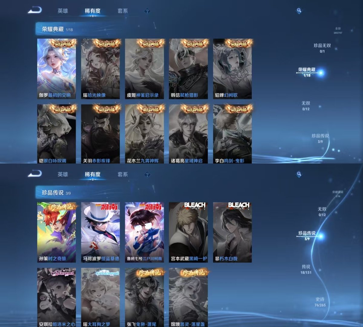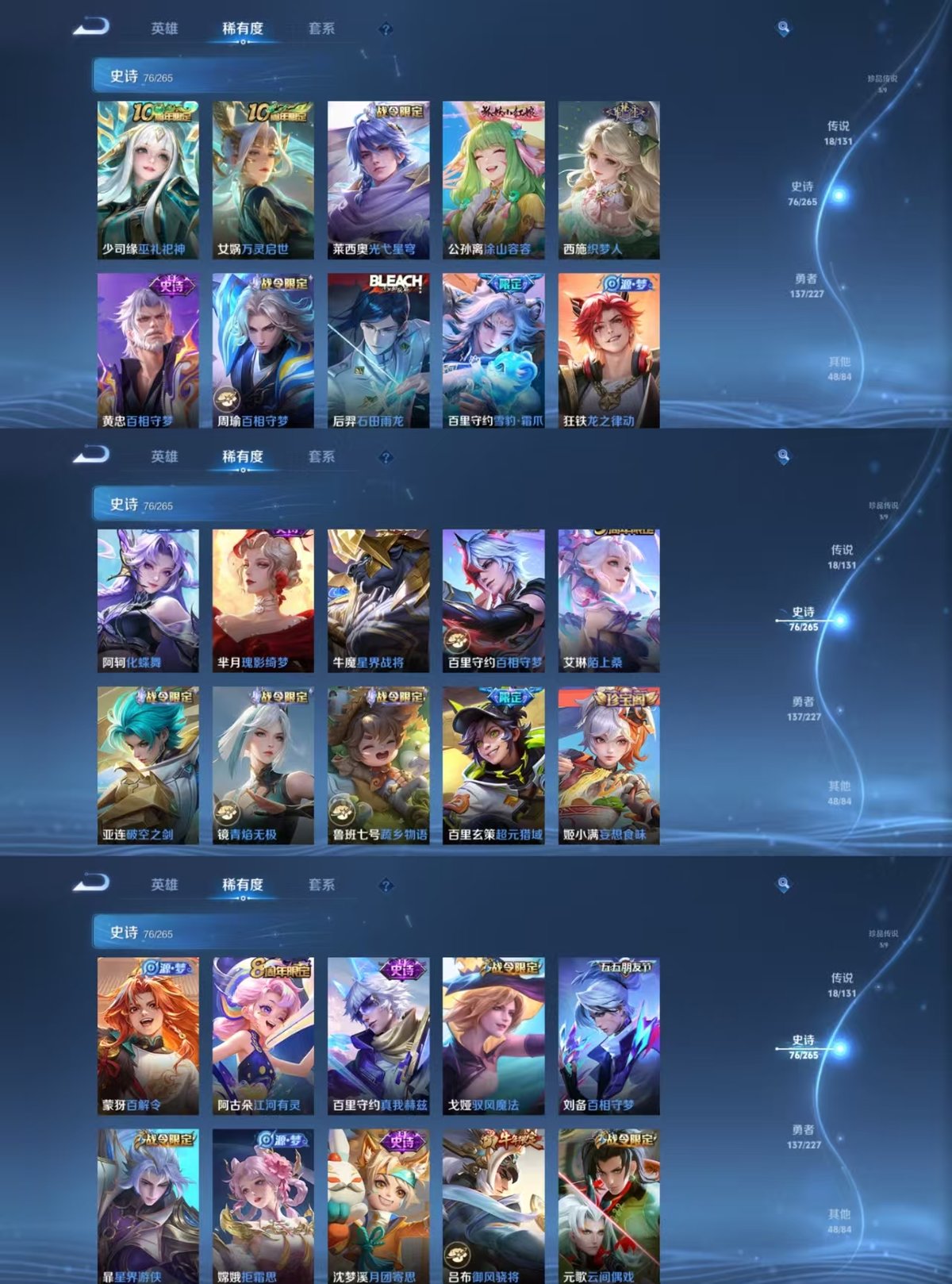 127英雄-283皮肤-实名: 可修改 贵族等级: v8 英雄数: 127 皮肤数: 283 荣耀水晶: 最初的交响 珍品传说: 江户川柯南怪盗基德时之奇旅-孙策 传说皮: 黄金射手座冠军飞将云鹰飞将炽阳神光一念神魔地狱之眼妄想实况妄想奇谈霜月吟澜逐花归海玄雷天君云诺千山诡秘之主 限定皮: 遇见飞天李小龙梁祝御风骁将青龙志玄武志至尊宝鸣野蒿陌上桑逐霄战戟愿照·众生和愿照·