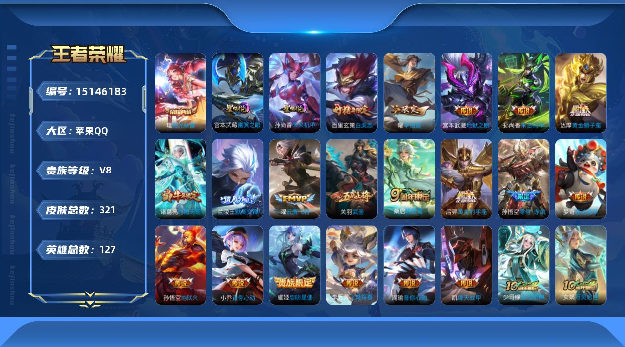 [15146183]【店主推荐捡漏号!可直接换绑/1市标/4236星币可兑换星元皮肤】:苹果q-v8-最强王者段位-127英雄-321皮肤-1典藏皮肤-2星元-20传说-74史诗 【荣耀典藏】:瑶拾光映像 【传说皮肤】:后羿神树通天,桑启鸣野蒿,曜李 ,周瑜音你心动,小乔音你心动,李元芳飞鸢探春,兰陵王默契交锋,诸葛亮时雨天司,铠绛天战甲,虞姬启明星使,孙悟空零号赤焰,关羽武圣,曜云鹰飞将,达摩黄金狮子座,百里玄策白虎志,梦奇胖达荣荣,后羿黄金射手座,孙尚香末日机甲,宫本武藏地狱之眼,孙悟空地狱火 【限定皮肤】:蒙犽顽岩魄,大乔绒语心约,姜子牙天穹之誓,杨戬破阵退雄兵,狄仁杰阴阳师,赵云皇家上将,嬴政白昼王子,孙尚香蔷薇恋人,鲁班七号狮舞东方,庄周高山流水,阿轲迷踪丽影,芈月重明,吕布猎兽之王,吕布御风骁将,周瑜赤莲之焰,元歌云间偶戏,元歌无心,夏侯惇朔风刀,甄姬游园惊梦,典韦穷奇,典韦蓝屏警告,狄仁杰魔术师,狄仁杰万华元夜,达摩星际陆战队,达摩沙漠行僧,项羽海滩派对,老夫子醍醐杖,关羽冰锋战神,关羽武圣,程咬金演武夺筹,露娜一生所爱,刘邦夺宝奇兵,兰陵王默契交锋,兰陵王驯魔猎人,兰陵王金庭之子,亚瑟潮玩骑士王,孙悟空至尊宝,孙悟空大圣娶亲,孙悟空零号赤焰,牛魔御旌,李元芳银河之约,李元芳云中旅人,虞姬启明星使,钟馗神迹守卫,钟馗驱傩正仪,杨玉环遇见飞天,女娲朔望之晖,干将莫邪胡桃夹子,雅典娜单词大作战,蔡文姬繁星吟游,太乙真人华丽摇滚,鬼谷子原初探秘者,鬼谷子五谷丰年,诸葛亮时雨天司,苏烈千军破阵,百里玄策白虎志,百里玄策原初追逐者,弈星混沌棋,沈梦溪星空之诺,沈梦溪大漠名商,明世隐疑决卦,裴擒虎天狼狩猎者,裴擒虎李小龙,裴擒虎擒涛扼浪,狂铁御狮,米莱狄御霄,米莱狄胡桃异想国,云中君纤云弄巧,盾山御銮,上官婉儿梁祝,嫦娥拒霜思,曜李 ,蒙犽狂想玩偶喵,鲁班大师探海日志,桑启海盐诗旅,艾琳女武神,阿古朵江河有灵,张良古海寻踪,蒙犽百解令,高渐离燃音魔法,妲己灵卜魔法,鬼谷子天穹祈灯,伽罗琥珀纪元,沈梦溪龙舞盛年,刘邦剑破天穹,程咬金群星魔术团,周瑜熔金海岸 【年限皮肤】:百里玄策白虎志,吕布御风骁将,诸葛亮时雨天司,关羽武圣 【赛季限定】:芈月重明,夏侯惇朔风刀,典韦穷奇,狄仁杰万华元夜,达摩沙漠行僧,老夫子醍醐杖,程咬金演武夺筹,兰陵王金庭之子,张良古海寻踪,牛魔御旌,李元