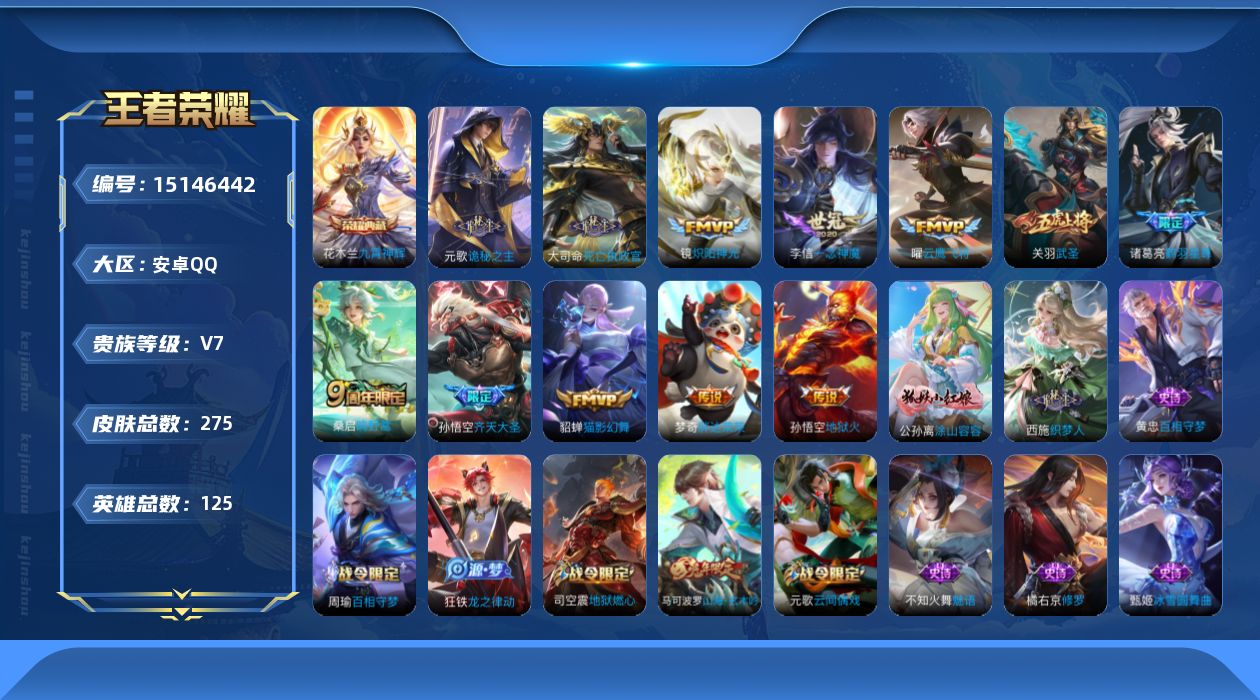 [15146442]可二次【店主推荐捡漏号!可直接换绑】安卓q-v7-至尊星耀v段位-125英雄-275皮肤-1典藏皮肤-13传说-65史诗-1星元 【英雄全皮】:元歌全皮,蒙恬全皮 【荣耀典藏】:花木兰九霄神辉 【传说皮肤】:后羿神树通天,元歌诡秘之主,大司命死亡执政官,桑启鸣野蒿,诸葛亮鹤羽星尊,孙悟空齐天大圣,镜炽阳神光,关羽武圣,曜云鹰飞将,李信一念神魔,貂蝉猫影幻舞,梦奇胖达荣荣,孙悟空地狱火 【限定皮肤】:姜子牙天穹之誓,杨戬破阵退雄兵,狄仁杰阴阳师,赵云皇家上将,高渐离玩趣恶龙,钟无艳超时空战士,扁鹊奇幻香踪,白起夜都怪侠,吕布猎兽之王,元歌云间偶戏,元歌无心,甄姬落雪兰心,马可波罗山海玄木吟,狄仁杰魔术师,达摩沙漠行僧,项羽海滩派对,关羽武圣,王昭君午后时光,兰陵王金庭之子,花木兰瑞麟志,孙悟空齐天大圣,李元芳云中旅人,杨戬潮玩骑兵,鬼谷子五谷丰年,诸葛亮鹤羽星尊,沈梦溪大漠名商,明世隐吟游魔法,裴擒虎李小龙,裴擒虎擒涛扼浪,狂铁电玩高手,云中君纤云弄巧,盾山御銮,嫦娥拒霜思,嫦娥暖冬兔眠,鲁班大师探海日志,桑启海盐诗旅,暃星界游侠,艾琳流音漫舞,司空震地狱燃心,阿古朵江河有灵,张良古海寻踪,蒙犽百解令,蒙恬荣光圣徽,高渐离燃音魔法,妲己灵卜魔法,鬼谷子天穹祈灯,伽罗琥珀纪元,沈梦溪龙舞盛年,李元芳蔬乡物语,刘邦剑破天穹,镜青焰无极,周瑜熔金海岸 【年限皮肤】:花木兰瑞麟志,关羽武圣,马可波罗山海玄木吟 【赛季限定】:达摩沙漠行僧,兰陵王金庭之子,张良古海寻踪,李元芳云中旅人,沈梦溪大漠名商,裴擒虎擒涛扼浪,盾山御銮,鲁班大师探海日志,桑启海盐诗旅,鬼谷子天穹祈灯,蒙恬荣光圣徽,刘邦剑破天穹,姜子牙天穹之誓 【战令限定】:钟无艳超时空战士,扁鹊奇幻香踪,白起夜都怪侠,吕布猎兽之王,元歌云间偶戏,甄姬落雪兰心,王昭君午后时光,艾琳流音漫舞,杨戬潮玩骑兵,明世隐吟游魔法,狂铁电玩高手,嫦娥暖冬兔眠,司空震地狱燃心,暃星界游侠,高渐离燃音魔法,妲己灵卜魔法,李元芳蔬乡物语,镜青焰无极 【史诗皮肤】:露娜紫霞仙子,赵云皇家上将,赵云未来纪元,貂蝉圣诞恋歌,甄姬冰雪圆舞曲,狄仁杰魔术师,廉颇地狱岩魂,宫本武藏鬼剑武藏,孙尚香水果甜心,嬴政摇滚巨星,妲己魅力维加斯,妲己女仆咖啡,墨子金属风暴,吕布圣诞狂欢,刘禅绅士熊喵,曹操幽灵船长,吕布末日机甲,张飞乱世虎臣,花木兰水晶猎龙者,