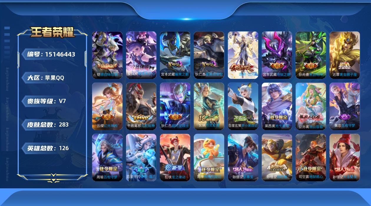 [15146443]【店主推荐捡漏号!可直接换绑】苹果q-v7-最强王者段位-126英雄-283皮肤-1典藏皮肤-1珍品传说-8传说-68史诗 【英雄全皮】:孙权全皮,司空震全皮 【荣耀典藏】:铠银白咏叹调 【珍品传说】:安琪拉酷洛米之心 【传说皮肤】:后羿神树通天,司空震愿照山河定,云缨幻光神呛,干将莫邪久胜战神,达摩黄金狮子座,孙尚香末日机甲,宫本武藏地狱之眼,狄仁杰超时空战士 【限定皮肤】:大乔绒语心约,虞姬夏日便利店,姜子牙天穹之誓,李白谪仙醉月,狄仁杰阴阳师,赵云皇家上将,嬴政白昼王子,高渐离死亡摇滚,钟无艳王者之锤,芈月重明,吕布猎兽之王,夏侯惇朔风刀,甄姬游园惊梦,典韦穷奇,狄仁杰魔术师,狄仁杰万华元夜,项羽海滩派对,老夫子醍醐杖,程咬金演武夺筹,韩信飞衡,兰陵王金庭之子,孙悟空至尊宝,孙悟空大圣娶亲,孙悟空孙行者,牛魔御旌,李元芳匿光侦查者,钟馗驱傩正仪,干将莫邪胡桃夹子,雅典娜黎明之约,鬼谷子原初探秘者,黄忠烈魂,苏烈千军破阵,百里玄策原初追逐者,弈星混沌棋,明世隐疑决卦,裴擒虎李小龙,狂铁御狮,米莱狄御霄,云中君纤云弄巧,盾山御銮,上官婉儿梁祝,鲁班大师探海日志,艾琳流音漫舞,司空震地狱燃心,阿古朵江河有灵,张良古海寻踪,蒙恬荣光圣徽,高渐离燃音魔法,妲己灵卜魔法,鬼谷子天穹祈灯,姬小满妄想食味,刘邦剑破天穹,周瑜熔金海岸 【年限皮肤】:韩信飞衡,黄忠烈魂 【赛季限定】:芈月重明,夏侯惇朔风刀,典韦穷奇,狄仁杰万华元夜,老夫子醍醐杖,程咬金演武夺筹,兰陵王金庭之子,张良古海寻踪,牛魔御旌,钟馗驱傩正仪,雅典娜黎明之约,鬼谷子原初探秘者,苏烈千军破阵,百里玄策原初追逐者,弈星混沌棋,明世隐疑决卦,狂铁御狮,米莱狄御霄,盾山御銮,鲁班大师探海日志,鬼谷子天穹祈灯,蒙恬荣光圣徽,刘邦剑破天穹,姜子牙天穹之誓 【战令限定】:虞姬夏日便利店,嬴政白昼王子,吕布猎兽之王,艾琳流音漫舞,司空震地狱燃心,高渐离燃音魔法,妲己灵卜魔法 【史诗皮肤】:露娜紫霞仙子,钟无艳王者之锤,赵云皇家上将,貂蝉圣诞恋歌,甄姬冰雪圆舞曲,狄仁杰魔术师,宫本武藏鬼剑武藏,孙尚香水果甜心,嬴政暗夜贵公子,嬴政摇滚巨星,妲己魅力维加斯,墨子金属风暴,刘禅绅士熊喵,曹操幽灵船长,李白千年之狐,吕布末日机甲,张飞乱世虎臣,韩信白龙吟,孙悟空至尊宝,花木兰水晶猎龙者,刘邦德古拉伯爵,兰陵王暗隐猎兽者,诸葛亮黄