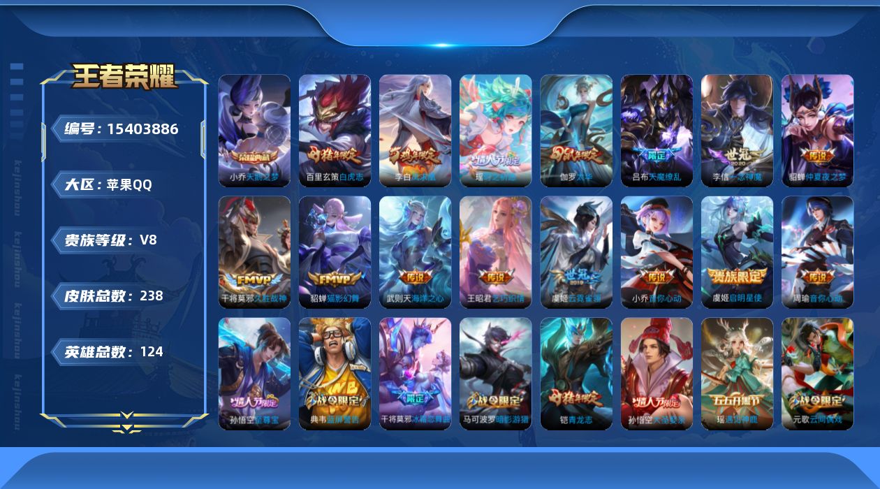 [15403886]v8 1典藏 15传说 124英雄 238皮肤 典藏英雄武则天 可修改实名 【稀有英雄】大司命嬴政始皇帝韩信韩跳跳夏洛特夏师傅艾琳橘右京橘子娜可露露鸟人不知火舞赵云金蝉唐僧戈娅 【荣耀水晶】天鹅之梦小乔典藏 【传说皮】仲夏夜之梦大飞蛾海洋之心云霓雀翎一念神魔久胜战神猫影幻舞音你心动-小乔音你心动-周瑜乞巧织情 【珍宝阁皮】蔷薇恋人 【赛季/战令皮】擒涛扼浪s31天穹祈灯s34饕餮s9烛龙s10重明s11穷奇s12御狮s13御霄s14御旌s15御銮s16朔风刀s17混沌棋s18疑决卦s19醍醐杖s20原初探秘者s21万华元夜s22演武夺筹s23驱傩正仪s24千军破阵s25猎兽之王白昼王子朔望之晖蓝屏警告神迹守卫-钟馗狮舞东方赤莲之焰驯魔猎人星空之诺银河之约夺宝奇兵迷踪丽影西部大镖客-猪八戒暗影游猎游乐娃子单词大作战狂想玩偶喵潮玩骑士王云间偶戏星际陆战队-达摩胡桃异想国神迹守卫-墨子航海奇遇记沙漠行僧s26金庭之子s27大漠名商s28 【史诗皮】遇见神鹿黄金分割率冰冠公主青蛇偶像歌手晚萤无限星赏官魅语白蛇猫狗日记-孙策猫狗日记-大乔时之恋人-孙尚香乱世虎臣女仆咖啡水果甜心绅士熊喵心灵骇客时之奇旅-安琪拉功夫厨神德古拉伯爵心灵战警舞动绿茵地狱岩魂纤云弄巧繁星吟游呼啦呼啦拒霜思缤纷独角兽乘风破浪逐浪之夏金属风暴原初追逐者圣诞狂欢圣诞恋歌鹰眼统帅魅力维加斯黎明之约未来纪元-赵云 【限定皮】至尊宝白虎志电光耗子凤求凰白切鸡凤凰于飞太华伽罗年限时之彼端白鹤梁神女魔法小厨娘玄嵩庄周年限遇见飞天高山流水青龙志铠年限天狼运算者游园惊梦梁祝天狼狩猎者天狼溯光者虎魄逐梦之音奔雷神使牛魔年限李小龙逐梦之光如梦令-嫦娥霸王别姬-虞姬奇迹圣诞一生所爱大圣娶亲天魔缭乱冰霜恋舞曲云端筑梦师时之祈愿-瑶瑶传限 【普通皮】雪境奇遇-西施谧流熔炉神迹守卫鬼谷子天穹祈灯s34五福同心花好人