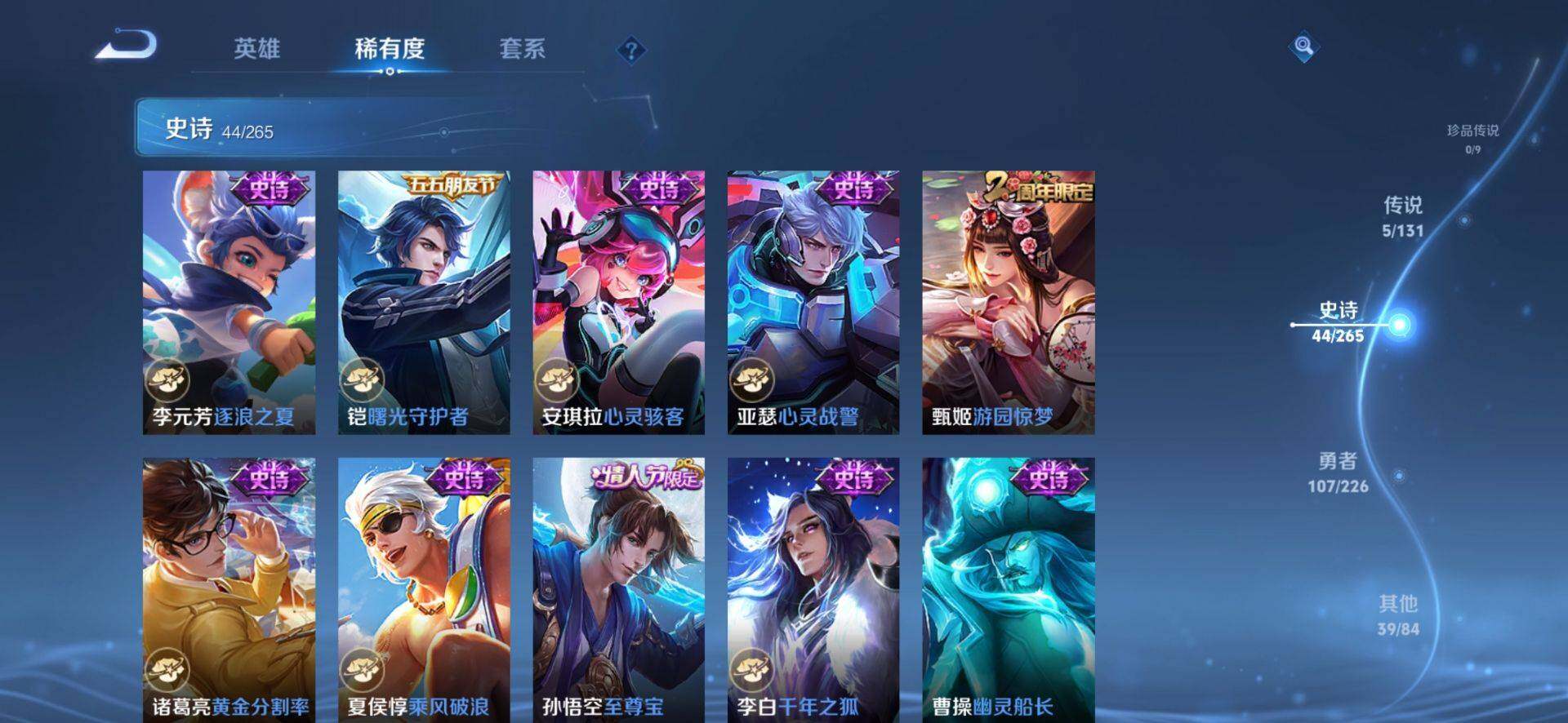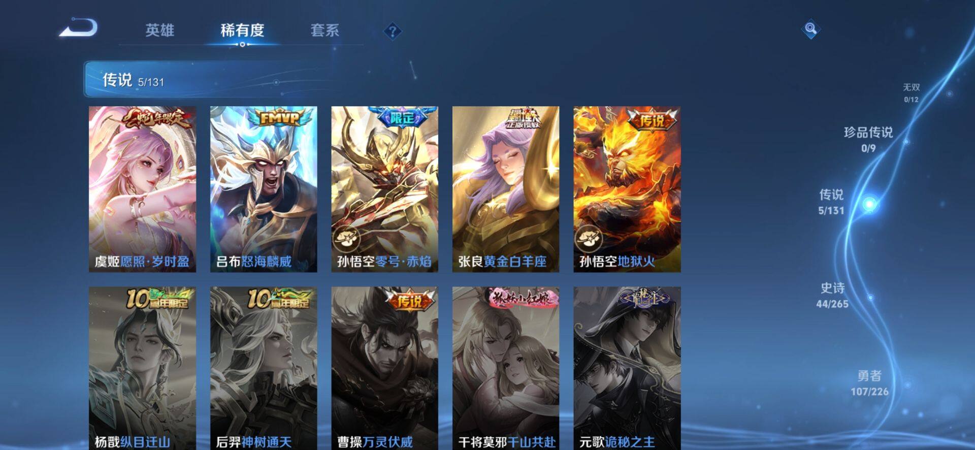 2272015-【猴子多皮至尊宝 零号赤焰 地狱火 吕布怒海麟威】安卓q-v6-最强王者段位-126英雄-195皮肤-0典藏-0珍品无双-0无双-0珍品传说-5传说-44史诗 【英雄全皮】:影全皮 【传说皮肤】:虞姬愿照岁时盈,吕布怒海麟威,孙悟空零号赤焰,张良黄金白羊座,孙悟空地狱火 【限定皮肤】:白起狰,狄仁杰阴阳师,虞姬凯尔特女王,赵云皇家上将,孙尚香蔷薇恋人,鲁班七号乒乒小将,庄周蜃