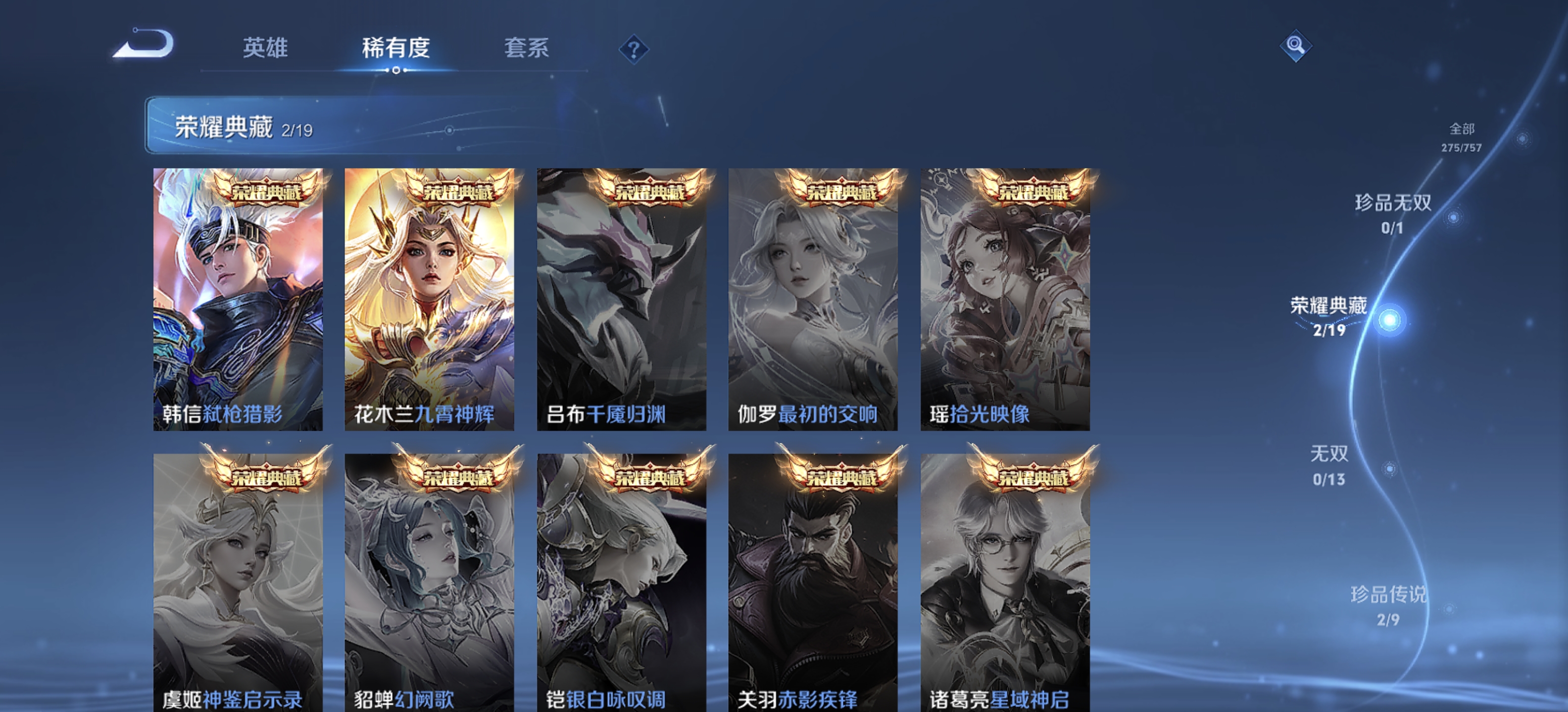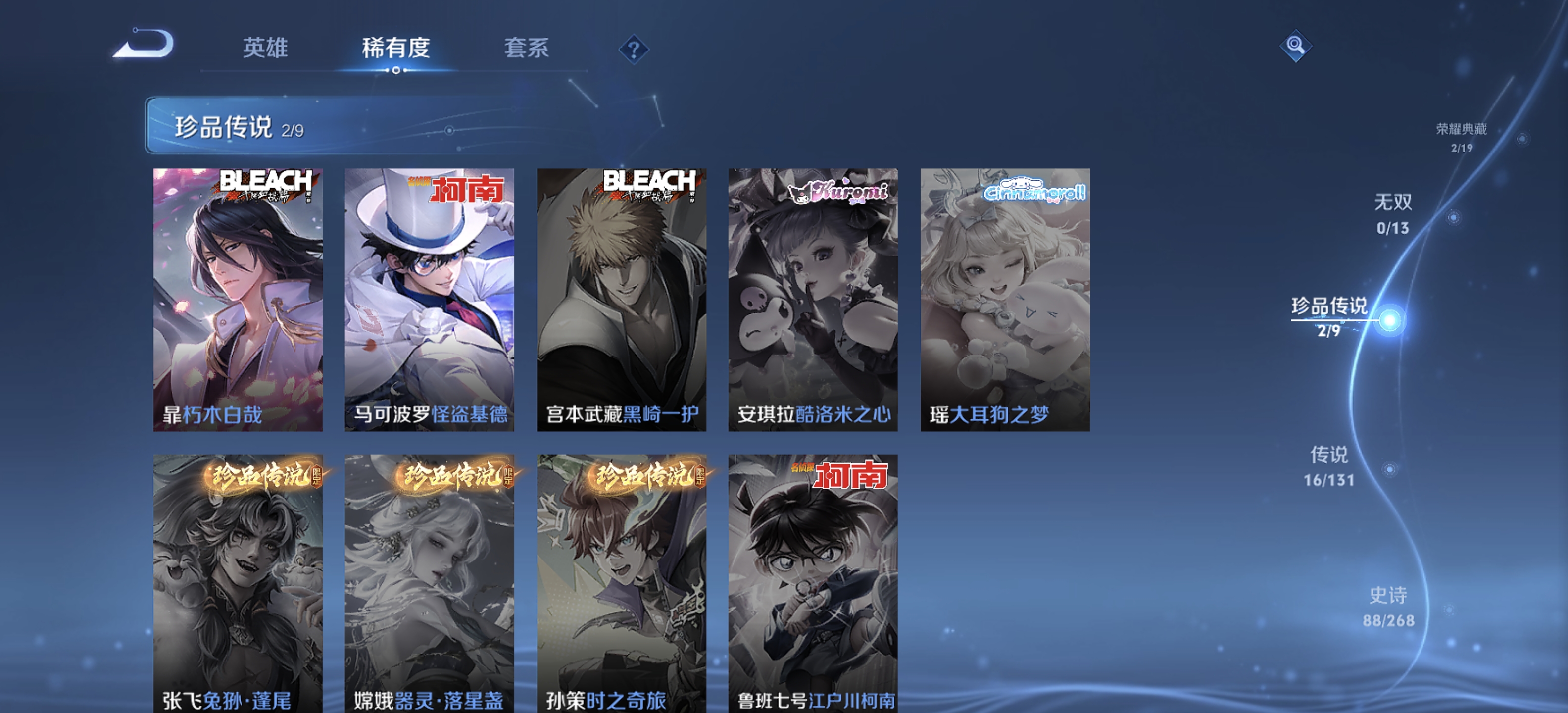 txwz27569-v7-275皮 2典藏 九霄神辉,弑呛猎影 2珍品 朽木白哉,怪盗基德 16传说 地狱之眼,神树通天,千山共赴,黄金射手座,愿照·九州拓,幻光神呛,愿照·千秋盛,鸣野蒿,时之恋人,心动手记,云鹰飞将,炽阳神光,琥珀纪元,逐花归海,凤求凰,末日机甲 88史诗