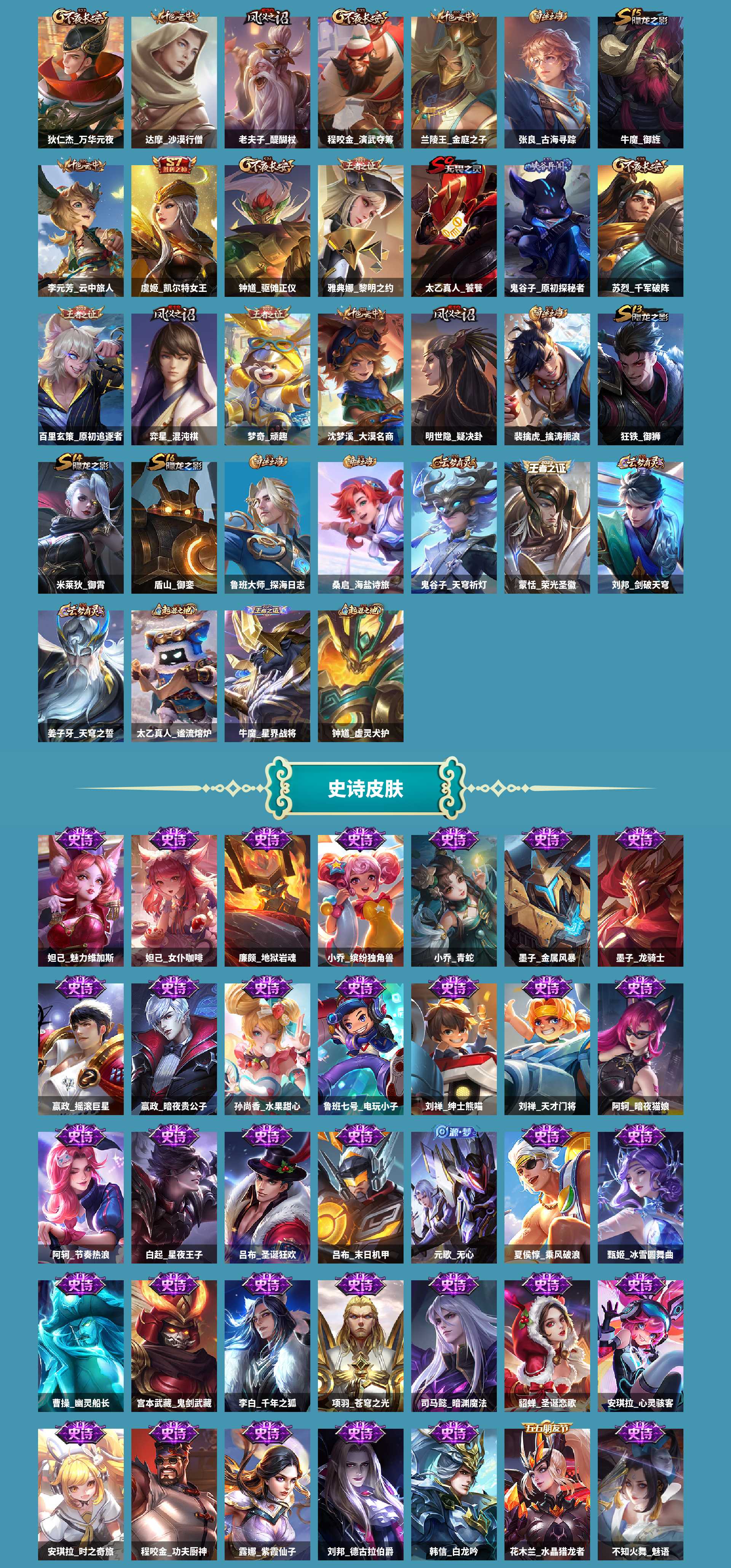 al660595 【v10-打野55段韩信全皮-历史3个万战,10金标带妹数据号-8典藏-瑶拾光映像,李白鸣剑曳影,韩信弑呛猎影,夏侯惇无限飓风号,孙悟空全息碎影,鲁班七号星空梦想,小乔天鹅之梦,孙尚香杀手不太冷-韩信群星魔术团,后裔神树通天,赵云乘龙铭钟鼎,澜逐花归海,狄仁杰夜礼服假面,孙策挚爱之约,孙策末日机甲,诸葛亮武陵仙君,赵云淬星耀世,孙尚香异界灵契,干将莫邪久胜战神,曜云鹰飞将,百里玄策白虎志】 皮肤数406 无双皮肤数1 传说皮肤数23 史诗皮肤数117 英雄数127 营地id425070217 贵族等级【文本】贵族10级 【贵族10级】 荣耀典藏8 无双皮肤1 内测皮肤3 年限皮肤8 限定皮肤130 赛季限定41 史诗皮肤117 战令限定22 勇者皮肤171 其他皮肤84 荣耀典藏:瑶拾光映像,李白鸣剑曳影,韩信弑呛猎影,夏侯惇无限飓风号,孙悟空全息碎影,鲁班七号星空梦想,小乔天鹅之梦,孙尚香杀手不太冷; 无双皮肤:韩信群星魔术团; 内测皮肤:干将莫邪胡桃夹子,嬴政优雅恋人,孙尚香蔷薇恋人; 年限皮肤:赵云乘龙铭钟鼎,马可波罗山海玄木吟,韩信飞衡,百里玄策白虎志,铠青龙志,百里守约朱雀志,后羿辉光之辰,杨戬永曜之星; 限定皮肤:曹操逐霄之志,梦奇天降福星,西施织梦人,鬼谷子克喵,白起死霸装,后羿石田雨龙,扁鹊灵蛊蚀心,钟馗虚灵犬护,苏烈春野闲踪,猪八戒西部大镖客,太乙真人谧流熔炉,阿轲化蝶舞,马超访茗客,孙膑茶境仙,牛魔星界战将,吕布逐霄战戟,桑启鸣野蒿,干将莫邪胡桃夹子,东皇太一噬灭天穹,盘古敬我三分,姜子牙天穹之誓,刘邦剑破天穹,沈梦溪龙舞盛年,赵云乘龙铭钟鼎,嫦娥漠中幻影,高渐离燃音魔法,妲己灵卜魔法,鬼谷子天穹祈灯,蒙恬荣光圣徽,艾琳觅芳踪,蒙犽百解令,狄仁杰夜礼服假面,阿古朵江河有灵,张良古海寻踪,鲁班大师探海日志,裴擒虎擒涛扼浪,嫦娥暖冬兔眠,暃星界游侠,马可波罗山海玄木吟,桑启海盐诗旅,梦奇顽趣,元歌无心,钟无艳超时空战士,甄姬落雪兰心,嬴政优雅恋人,鬼谷子五谷丰年,李元芳云中旅人,沈梦溪大漠名商,孙策挚爱之约,诸葛亮武陵仙君,兰陵王金庭之子,韩信傲雪梅呛,达摩沙漠行僧,雅典娜黎明之约,嫦娥拒霜思,蒙犽狂想玩偶喵,后羿圣弓游侠,干将莫邪真爱魔法,孙尚香异界灵契,庄周高山流水,猪八戒猪悟能,孙悟空孙行者,苏烈千军破阵,老夫子航海奇遇记,孙尚香蔷薇恋人,钟馗驱傩正仪,墨子神迹守卫,程咬金演武夺筹,云中君纤云弄巧,裴擒虎李小龙,鬼谷子原初探秘者,百里玄策原初追逐者,蔡文姬繁星吟游,老夫子醍醐杖,明世隐疑决卦,韩信飞衡,弈星混沌棋,兰陵王驯魔猎人,周瑜赤莲之焰,上官婉儿梁祝,夏侯惇朔风刀,太乙真人华丽摇滚,鲁班七号狮舞东方,钟馗神迹守卫,盾山御銮,狄仁杰鹰眼统帅,裴擒虎天狼狩猎者,典韦蓝屏警告,女娲朔望之晖,钟无艳王者之锤,牛魔御旌,孙悟空大圣娶亲,露娜一生所爱,干将莫邪冰霜恋舞曲,赵云引擎之心,百里玄策白虎志,铠青龙志,百里守约朱雀志,嬴政白昼王子,米莱狄御霄,吕布猎兽之王,东皇太一逐梦之光,蔡文姬奇迹圣诞,杨玉环遇见飞天,狂铁御狮,妲己热情桑巴,典韦穷奇,花木兰青春决赛季,庄周云端筑梦师,项羽霸王别姬,虞姬霸王别姬,后羿辉光之辰,杨戬永曜之星,曹操烛龙,马可波罗逐梦之星,太乙真人饕餮,甄姬游园惊梦,白起狰,韩信逐梦之影,小乔纯白花嫁,狄仁杰阴阳师,高渐离死亡摇滚,虞姬凯尔特女王,扁鹊炼金王,狄仁杰魔术师,赵云皇家上将,项羽海滩派对,孙膑妖精王,狄仁杰万华元夜,虞姬启明星使; 赛季限定:亚瑟荣光之誓,甄姬逆浪荇歌,钟馗虚灵犬护