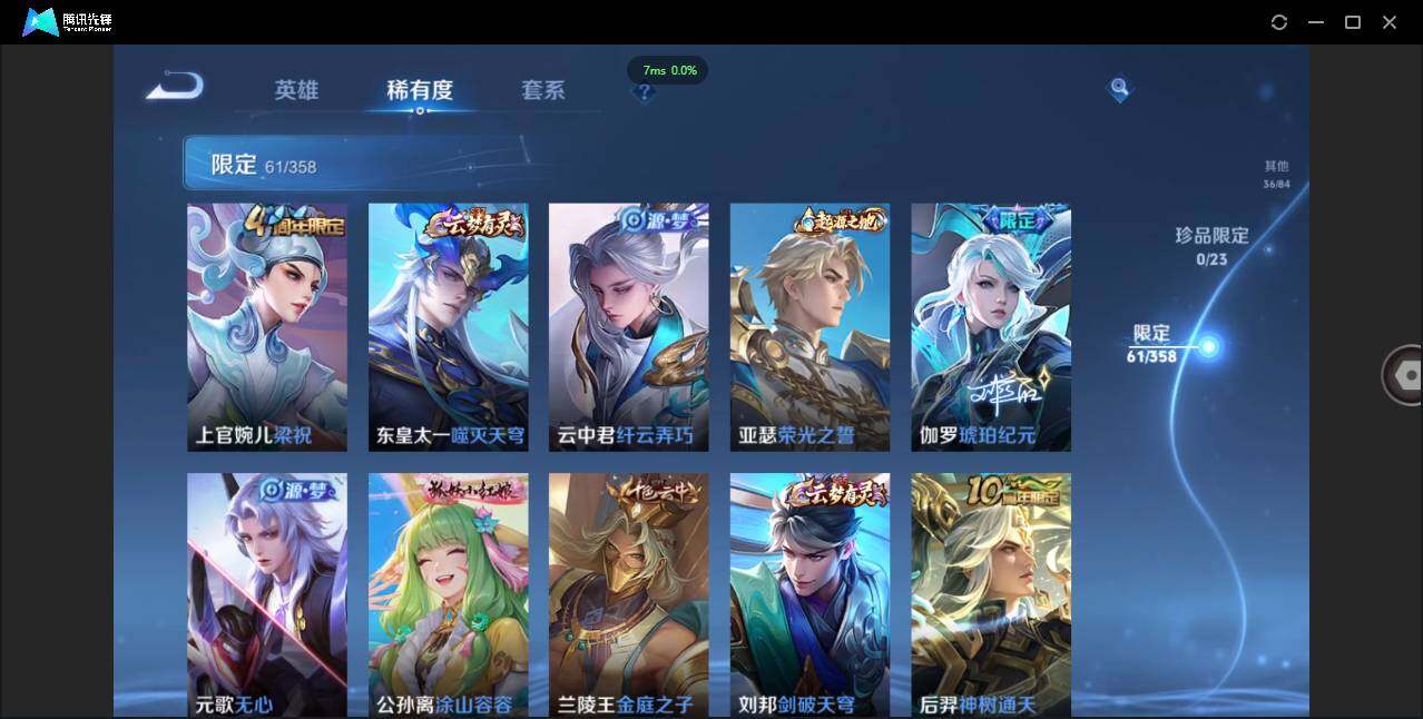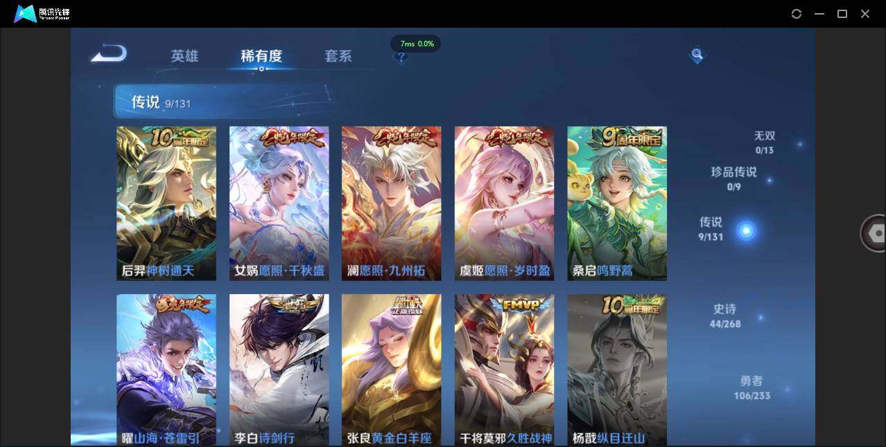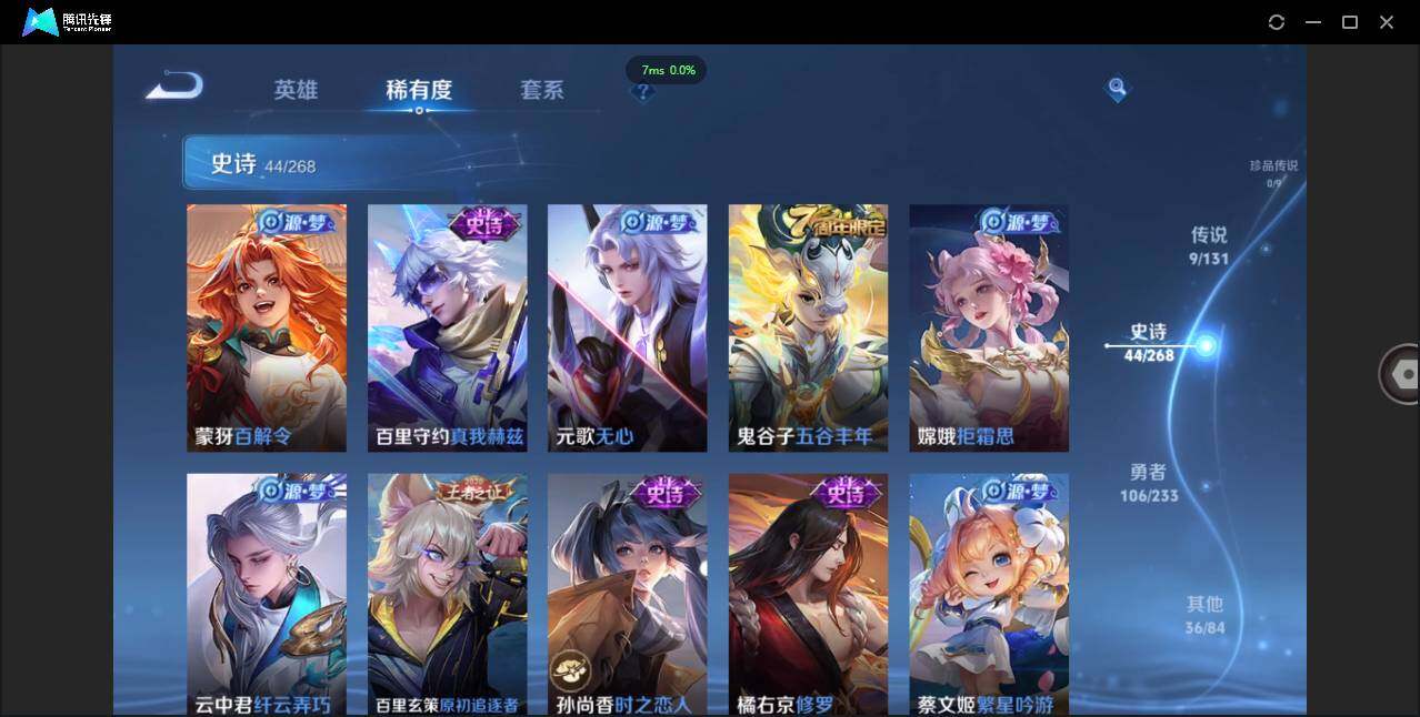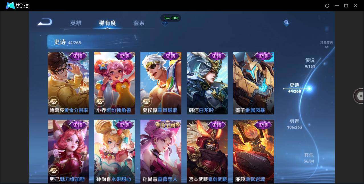 贵族4/皮肤195/传说9/史诗44/英雄127/后羿神树通天/女娲愿照千秋盛/澜愿照九州拓/虞姬愿照岁时盈/桑启鸣野蒿/曜山海苍雷引/李白诗剑行/张良黄金白羊座/干将莫邪久胜战神/大乔绒语心约/姜子牙天穹之誓/狄仁杰阴阳师/赵云皇家上将/孙尚香蔷薇恋人/元歌无心/狄仁杰魔术师/狄仁杰万华元夜/达摩沙漠行僧/项羽海滩派对/老夫子醍醐杖/程咬金演武夺筹/兰陵王金庭之子/李元芳云中旅人/钟馗驱傩正仪/蔡文姬繁星吟游/鬼谷子原初探秘者/鬼谷子五谷丰年/苏烈千军破阵/百里玄策原初追逐者/沈梦溪大漠名商/明世隐疑决卦/裴擒虎擒涛扼浪/云中君纤云弄巧/上官婉儿梁祝/嫦娥拒霜思/鲁班大师探海日志/桑启海盐诗旅/艾琳女武神/张良古海寻踪/蒙犽百解令/鬼谷子天穹祈灯/伽罗琥珀纪元/刘邦剑破天穹/程咬金群星魔术团/刘备异域游侠/周瑜熔金海岸/赵云未来纪元/甄姬冰雪圆舞曲/廉颇地狱岩魂/宫本武藏鬼剑武藏/孙尚香水果甜心/妲己魅力维加斯/墨子金属风暴/韩信白龙吟/夏侯惇乘风破浪/小乔缤纷独角兽/诸葛亮黄金分割率/百里守约特工魅影/铠曙光守护者/蔡文姬舞动绿茵/程咬金功夫厨神/阿轲节奏热浪/孙策猫狗日记/伽罗箭羽风息/狄仁杰鹰眼统帅/公孙离无限星赏官/橘右京修罗/孙尚香时之恋人/百里守约真我赫兹/牛魔星界战将/赵怀真器灵浮梦炉/后羿石田雨龙/周瑜百相守梦/黄忠百相守梦/公孙离涂山容容/女娲万灵启世/少司缘巫礼祀神/项羽九幽镇关/韩信教廷特使/韩信街头霸王/露娜哥特玫瑰/赵云忍炎影/白起白色死神/扁鹊救世之瞳/庄周鲤鱼之梦/宫本武藏未来纪元/孙膑天使之翼/姜子牙时尚教父/妲己少女阿狸/典韦黄金武士/亚瑟死亡骑士/花木兰兔女郎/张飞五福同心/甄姬花好人间/后羿阿尔法小队/刘备纽约教父/刘备汉昭烈帝/关羽龙腾万里/钟无艳海滩丽影/狂铁命运角斗场/老夫子功夫老勺/孙尚香沉稳之力/诸葛亮掌控之力/李白敏锐之力/鬼谷子幻乐之宴/苏烈坚韧之力/大乔守护之力/明世隐虹云星官/庄周奇妙博物学/小乔丁香结/吕布野性能量/沈梦溪鲨炮海盗猫/哪吒次元突破/狂铁特工战影/刘禅秘密基地/露娜瓷语鉴心/张良缤纷绘卷/鲁班大师乓乓大师/程咬金无双福将/刘邦虎啸剑宗/蒙恬蔚蓝守将/刘备潮玩造梦师/海月幻泉雾影/猪八戒潮玩探月行/赵怀真太极少年/太乙真人劲辣红锅/莱西奥西部游侠/李元芳妄想特派/钟无艳聚星闪耀/程咬金暖冬絮语/海诺时空谍影/嫦娥漠中幻影/廉颇功夫炙烤/亚瑟鸿运当头/盘古经纬探寻者/大司命暗都幽影/貂蝉长夏之忆/盘古敬我三分/东皇太一噬灭天穹/干将莫邪雾都夜雨/吕布逐霄战戟/太乙真人谧流熔炉/西施雪境奇遇/姜子牙星梦巡礼/明世隐景韶洛都/戈娅玫蓝誓约/刘备浪漫序章/钟馗虚灵犬护/露娜命运加冕/白起死霸装/甄姬逆浪荇歌/孙策百相守梦/莱西奥踏浪烽翎/鬼谷子克喵/哪吒罗小黑战记/亚瑟荣光之誓/张良罗小黑战记/艾琳鹤鸣心笺/虞姬溯影追猎/鲁班七号福禄兄弟/高渐离金属狂潮/貂蝉异域舞娘/王昭君精灵公主/小乔万圣前夜/孙膑未来旅行/孙悟空西部大镖客/孙尚香火炮千金/李白范海辛/雅典娜战争女神/马可波罗激情绿茵/干将莫邪第七人偶/百里守约绝影神呛/梦奇美梦成真/女娲尼罗河女神/公孙离花间舞/弈星踏雪寻梅/元歌午夜歌剧院/司马懿魇语军师/沈梦溪棒球奇才/李信灼热之刃/上官婉儿修竹墨客/嫦娥露花倒影/盘古创世神祝/云中君荷鲁斯之眼/曜归虚梦演/马超幸存者/西施归虚梦演/镜冰刃幻境/蒙恬秩序猎龙将/澜孤猎/司空震启蛰/云缨赤焰之缨/金蝉前尘/暃碧珀绯影/桑启画中游