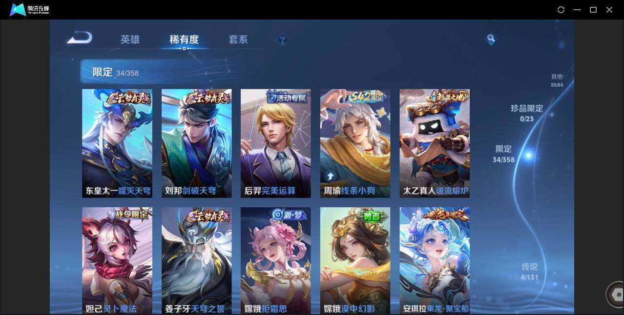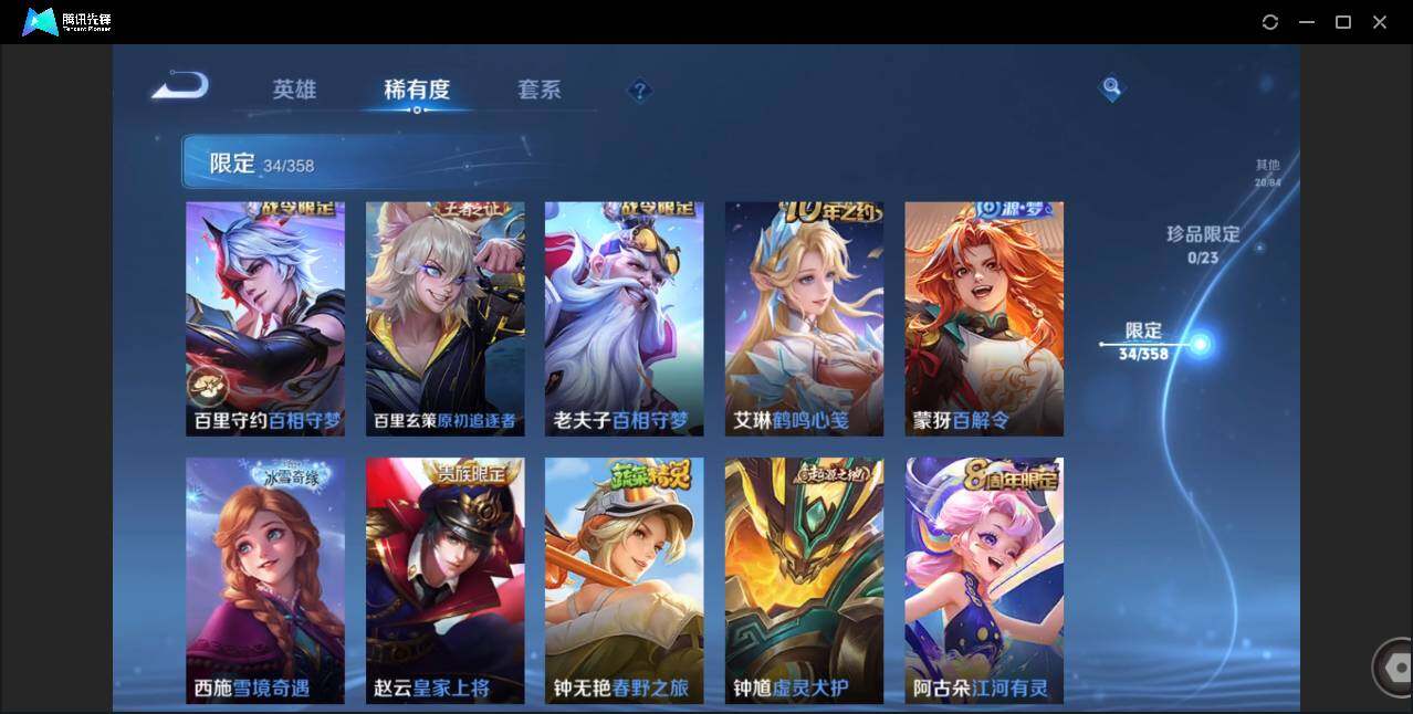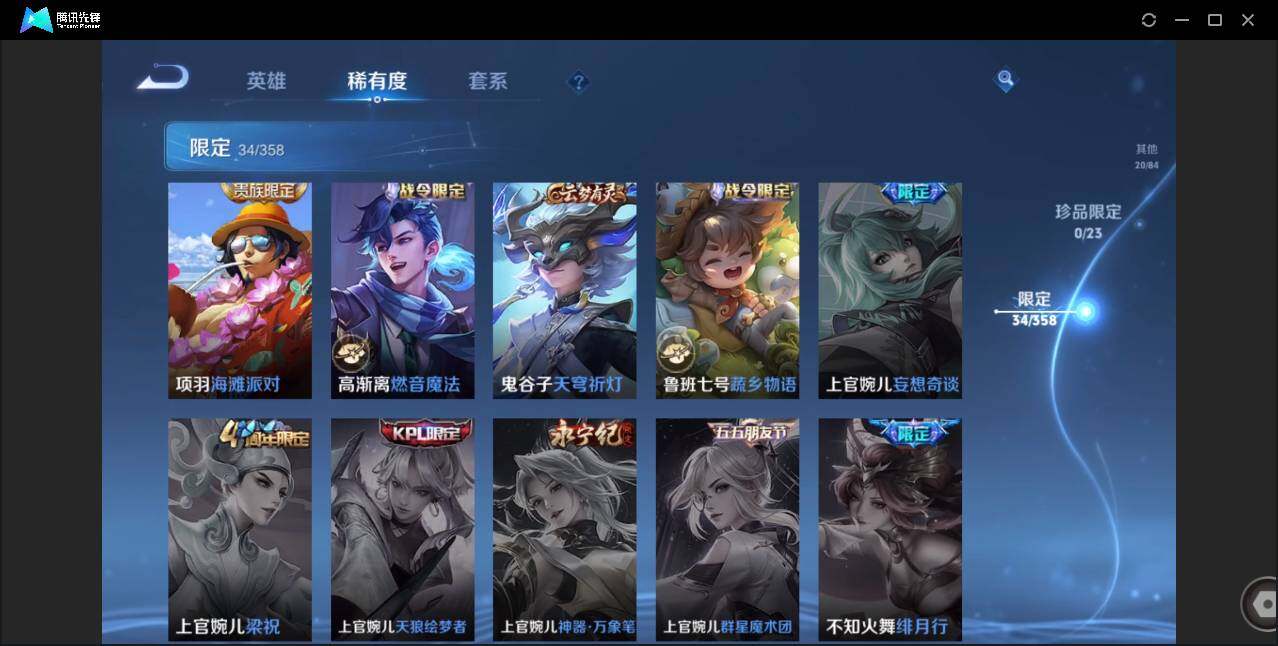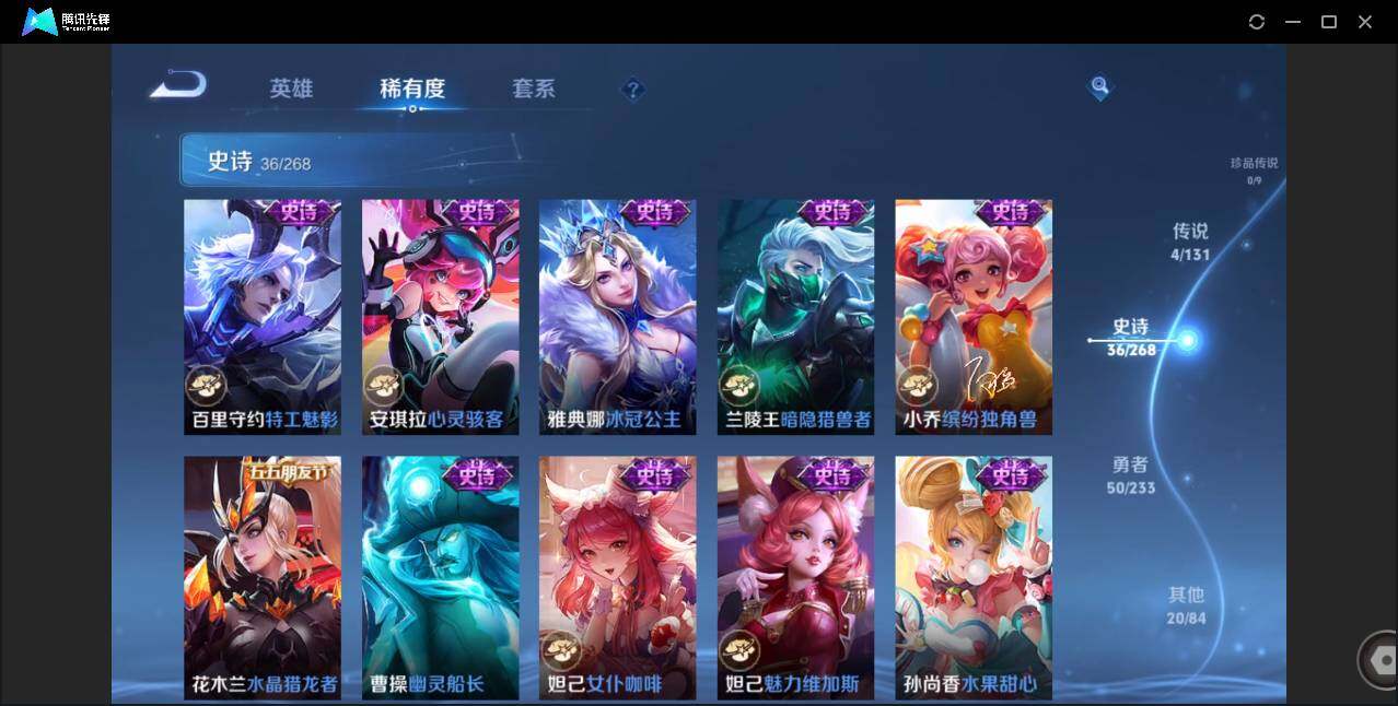 贵族6/皮肤111/传说4/史诗36/英雄103/空空儿全皮/桑启鸣野蒿/蔡文姬花朝如约/王昭君乞巧织情/小乔音你心动/蒙犽顽岩魄/姜子牙天穹之誓/狄仁杰阴阳师/赵云皇家上将/狄仁杰魔术师/项羽海滩派对/杨玉环遇见飞天/百里玄策原初追逐者/嫦娥拒霜思/阿古朵江河有灵/张良古海寻踪/蒙犽百解令/高渐离燃音魔法/妲己灵卜魔法/鬼谷子天穹祈灯/安琪拉乘龙聚宝船/鲁班七号蔬乡物语/李元芳蔬乡物语/刘邦剑破天穹/程咬金群星魔术团/周瑜熔金海岸/东皇太一噬灭天穹/太乙真人谧流熔炉/钟馗虚灵犬护/牛魔星界战将/百里守约百相守梦/老夫子百相守梦/周瑜线条小狗/貂蝉圣诞恋歌/甄姬冰雪圆舞曲/廉颇地狱岩魂/宫本武藏鬼剑武藏/孙尚香水果甜心/妲己魅力维加斯/妲己女仆咖啡/曹操幽灵船长/花木兰水晶猎龙者/小乔缤纷独角兽/兰陵王暗隐猎兽者/雅典娜冰冠公主/安琪拉心灵骇客/百里守约特工魅影/李元芳逐浪之夏/小乔青蛇/不知火舞魅语/瑶遇见神鹿/孙尚香时之恋人/西施诗语江南/安琪拉时之奇旅/庄周天秀幻梦/弈星万物之道/武则天东方不败/扁鹊救世之瞳/安琪拉玩偶对对碰/孙膑天使之翼/亚瑟死亡骑士/达摩拳王/花木兰兔女郎/刘备汉昭烈帝/老夫子功夫老勺/大乔守护之力/明世隐虹云星官/孙膑归虚梦演/沈梦溪鲨炮海盗猫/刘禅秘密基地/露娜瓷语鉴心/张良缤纷绘卷/鲁班大师乓乓大师/猪八戒潮玩探月行/太乙真人劲辣红锅/亚连破局者/后羿完美运算/海诺时空谍影/嫦娥漠中幻影/朵莉亚金色潮汐/钟无艳春野之旅/扁鹊无尽旅途/苍苍林狼骑/典韦铁骨偃魂/西施雪境奇遇/少司缘灵卦秘语/明世隐景韶洛都/戈娅玫蓝誓约/白起死霸装/空空儿戏梦巡演/艾琳鹤鸣心笺/桑启线条小狗/露娜绯红之刃/王昭君精灵公主/小乔万圣前夜/孙膑未来旅行/李元芳特种部队/蔡文姬蔷薇王座/太乙真人圆桌骑士/诸葛亮星航指挥官/大乔伊势巫女/铠龙域领主/女娲尼罗河女神/明世隐占星师/公孙离花间舞/杨玉环霓裳曲/弈星踏雪寻梅/上官婉儿修竹墨客/瑶森/云中君荷鲁斯之眼/西施归虚梦演/阿古朵熊喵少女