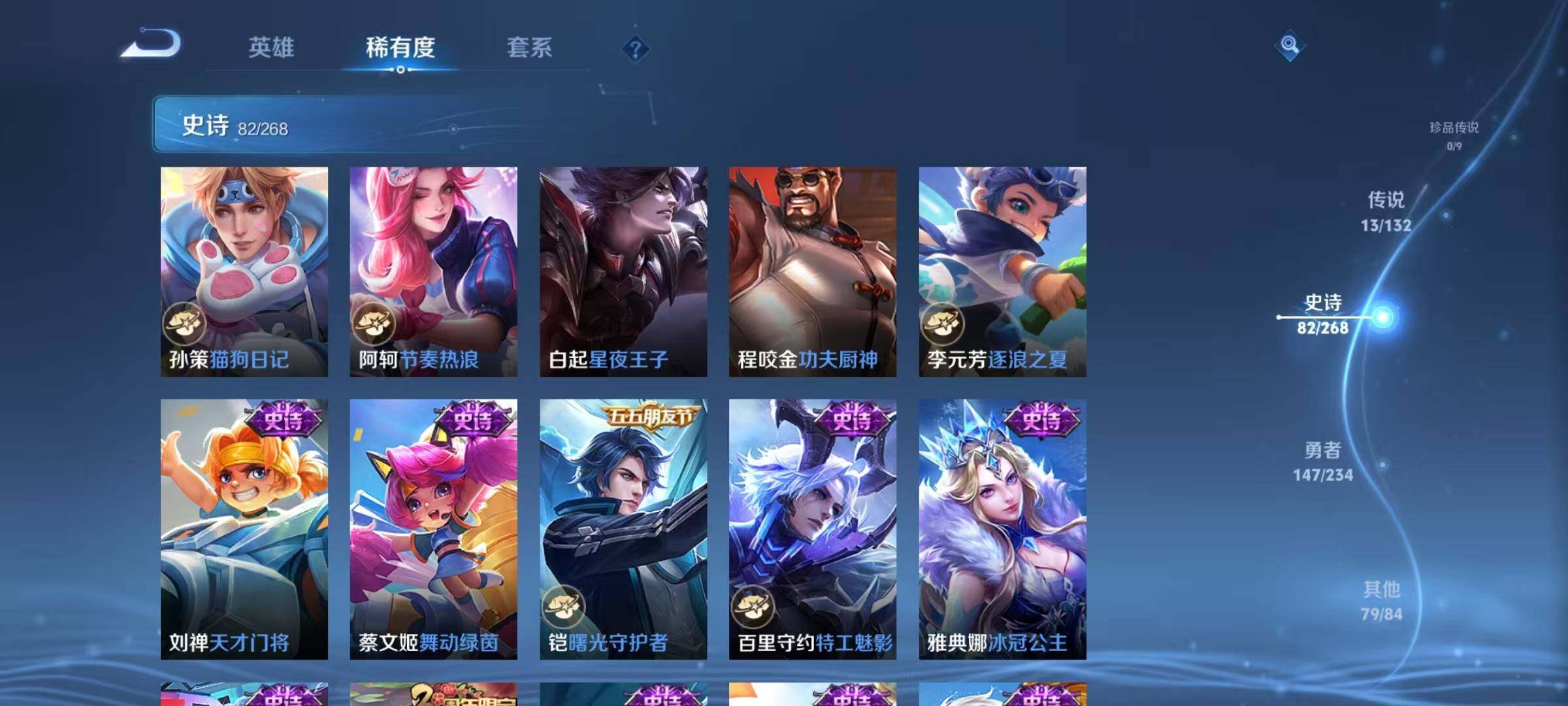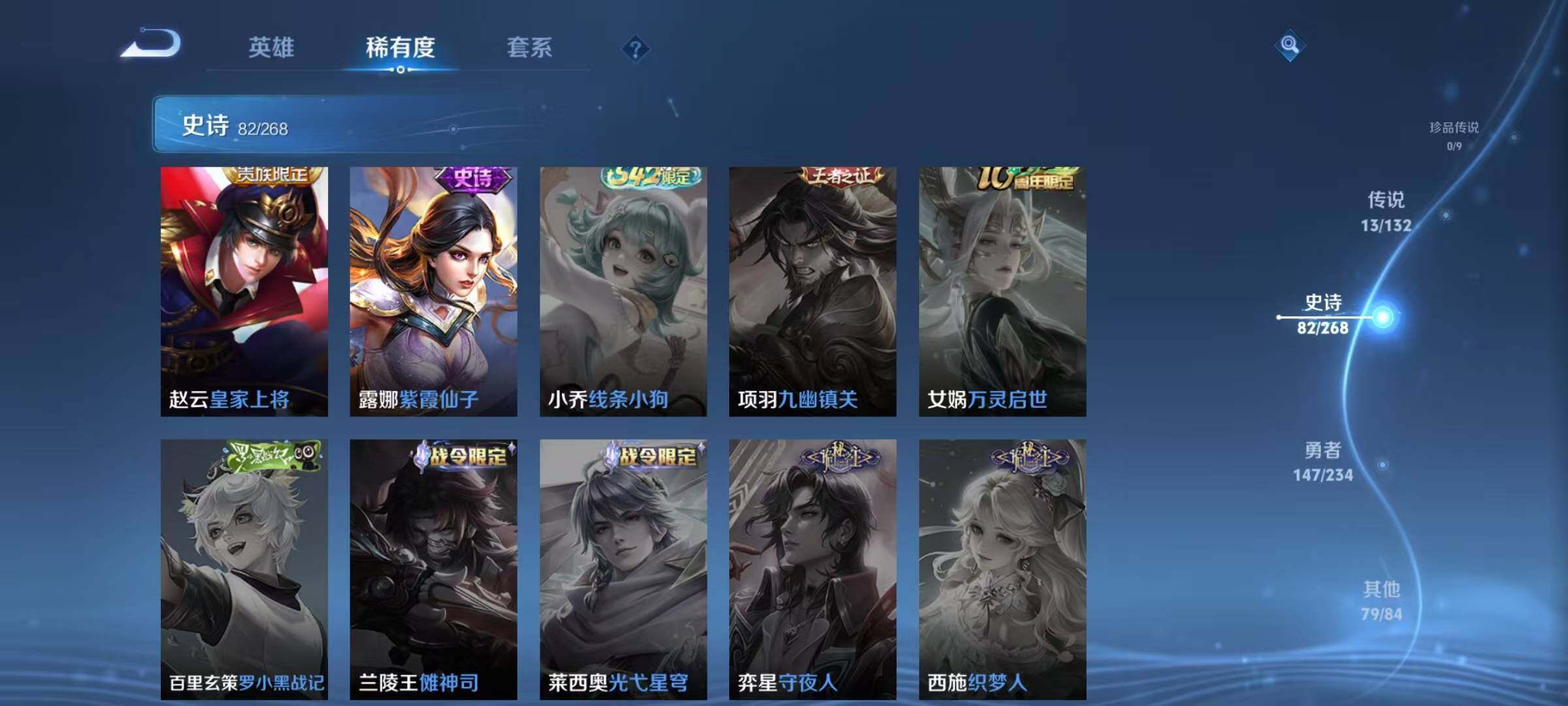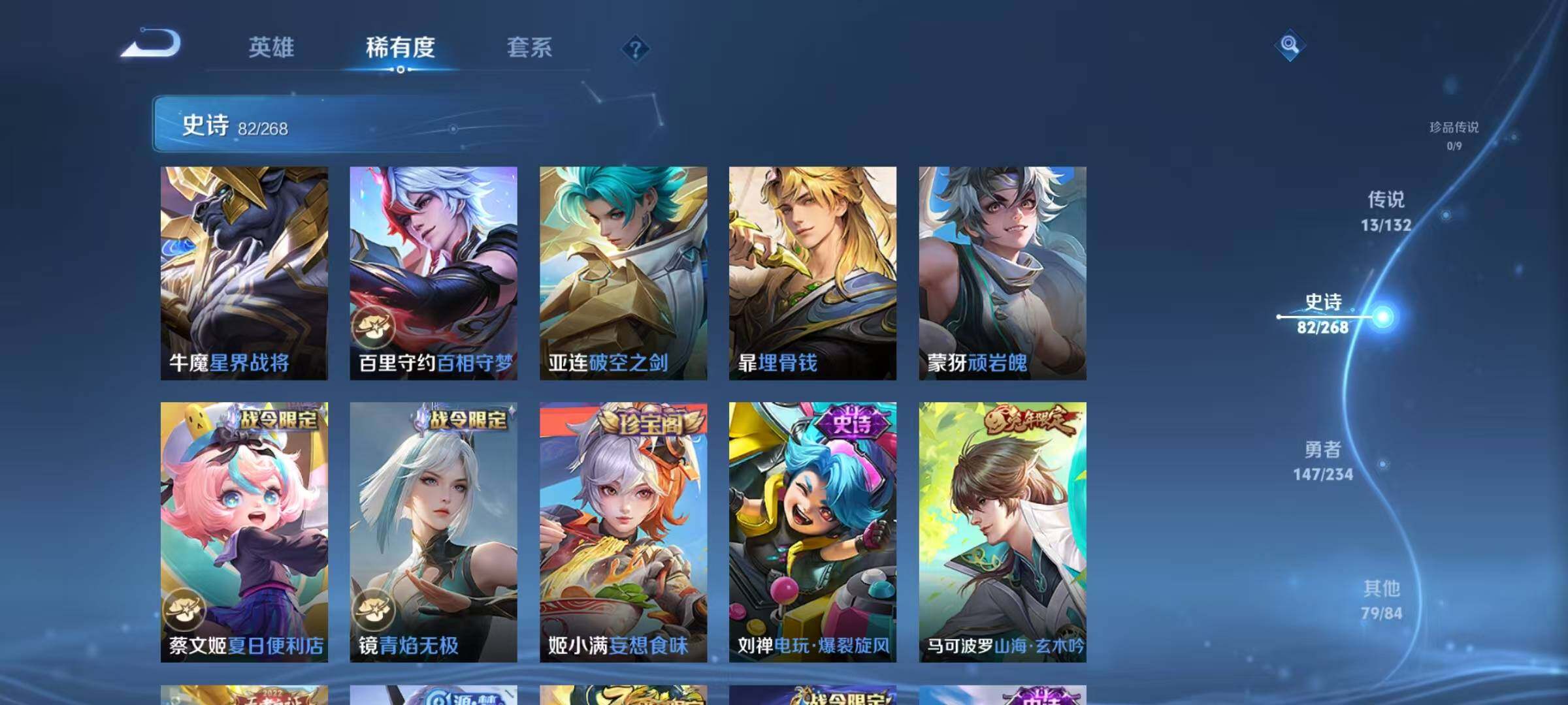 安卓q-v7-尊贵铂金i段位-127英雄-324皮肤-3典藏皮肤-13传说-81史诗 【英雄全皮】:刘禅全皮,达摩全皮,刘邦全皮,影全皮 【荣耀典藏】:夏侯惇无限飓风号,李白鸣剑曳影,铠银白咏叹调 【传说皮肤】:桑启鸣野蒿,孙策末日机甲,赵云淬星耀世,王昭君乞巧织情,周瑜音你心动,铠绛天战甲,虞姬启明星使,刘备时之恋人,貂蝉猫影幻舞,张良黄金白羊座,干将莫邪久胜战神,达摩黄金狮子座,后羿黄金射手座 【限定皮肤】:暃埋骨钱,蒙犽顽岩魄,蔡文姬夏日便利店,虞姬夏日便利店,姜子牙天穹之誓,杨戬破阵退雄兵,狄仁杰阴阳师,赵云皇家上将,墨子神迹守卫,嬴政优雅恋人,孙尚香蔷薇恋人,庄周高山流水,钟无艳超时空战士,芈月幻夜卜梦,元歌无心,甄姬游园惊梦,甄姬落雪兰心,马可波罗山海玄木吟,狄仁杰魔术师,狄仁杰万华元夜,达摩星际陆战队,达摩沙漠行僧,项羽海滩派对,老夫子航海奇遇记,安琪拉魔法小厨娘,程咬金演武夺筹,刘邦夺宝奇兵,兰陵王驯魔猎人,兰陵王金庭之子,孙悟空至尊宝,孙悟空孙行者,后羿圣弓游侠,李元芳云中旅人,虞姬启明星使,钟馗驱傩正仪,杨戬潮玩骑兵,女娲朔望之晖,干将莫邪真爱魔法,雅典娜黎明之约,鬼谷子原初探秘者,鬼谷子五谷丰年,黄忠火炮绅士,苏烈千军破阵,梦奇顽趣,沈梦溪星空之诺,沈梦溪大漠名商,裴擒虎擒涛扼浪,米莱狄胡桃异想国,猪八戒西部大镖客,嫦娥拒霜思,西施玲珑珍味,鲁班大师探海日志,桑启海盐诗旅,鬼谷子天穹祈灯,姬小满妄想食味,沈梦溪龙舞盛年,刘邦剑破天穹,程咬金群星魔术团,镜青焰无极,项羽苍威无极,周瑜熔金海岸 【年限皮肤】:马可波罗山海玄木吟 【赛季限定】:鬼谷子原初探秘者,狄仁杰万华元夜,程咬金演武夺筹,钟馗驱傩正仪,苏烈千军破阵,达摩沙漠行僧,兰陵王金庭之子,沈梦溪大漠名商,李元芳云中旅人,桑启海盐诗旅,裴擒虎擒涛扼浪,鲁班大师探海日志,鬼谷子天穹祈灯,刘邦剑破天穹,姜子牙天穹之誓,东皇太一噬灭天穹,太乙真人谧流熔炉,钟馗虚灵犬护,甄姬逆浪荇歌,雅典娜黎明之约,梦奇顽趣,牛魔星界战将 【战令限定】:女娲朔望之晖,兰陵王驯魔猎人,沈梦溪星空之诺,刘邦夺宝奇兵,猪八戒西部大镖客,米莱狄胡桃异想国,达摩星际陆战队,老夫子航海奇遇记,墨子神迹守卫,干将莫邪真爱魔法,后羿圣弓游侠,黄忠火炮绅士,芈月幻夜卜梦,钟无艳超时空战士,甄姬落雪兰心,杨戬潮玩骑兵,西施玲珑珍味,镜青焰无极,项羽苍威无极,蔡文姬夏日便利店,虞姬夏日便利店,亚连破空之剑,孙悟空神迹守卫,百里守约百相守梦,老夫子百相守梦,孙膑茶境仙,马超访茗客,刘禅鸭鸭历险记,沈梦溪鸭鸭历险记,周瑜线条小狗 【史诗皮肤】:露娜紫霞仙子,赵云皇家上将,赵云未来纪元,貂蝉圣诞恋歌,甄姬冰雪圆舞曲,王昭君偶像歌手,狄仁杰魔术师,廉颇地狱岩魂,宫本武藏鬼剑武藏,孙尚香蔷薇恋人,孙尚香水果甜心,嬴政优雅恋人,嬴政摇滚巨星,妲己魅力维加斯,妲己女仆咖啡,墨子龙骑士,墨子金属风暴,吕布圣诞狂欢,刘禅绅士熊喵,曹操幽灵船长,李白千年之狐,吕布末日机甲,安琪拉魔法小厨娘,张飞乱世虎臣,孙悟空至尊宝,花木兰水晶猎龙者,刘邦德古拉伯爵,夏侯惇乘风破浪,小乔缤纷独角兽,兰陵王暗隐猎兽者,甄姬游园惊梦,亚瑟心灵战警,雅典娜冰冠公主,百里守约特工魅影,铠曙光守护者,蔡文姬舞动绿茵,刘禅天才门将,李元芳逐浪之夏,程咬金功夫厨神,白起星夜王子,阿轲节奏热浪,孙策猫狗日记,大乔猫狗日记,狄仁杰鹰眼统帅,兰陵王驯魔猎人,橘右京修罗,马超神威,米莱狄胡桃异想国,老夫子航海奇遇记,干将莫邪真爱魔法,沈梦溪月团寄思,钟馗乐园奇幻夜,孙悟空孙行者,庄周高山流水,嫦娥拒霜思,黄忠火炮绅士,雅典娜黎明之约,哪吒雪上飞焰,钟无艳超时空战士,鬼谷子五谷丰年,元歌无心,梦奇顽趣,马可波罗山海玄木吟,刘禅电玩爆裂旋风,姬小满妄想食味,镜青焰无极,蔡文姬夏日便利店,蒙犽顽岩魄,暃埋骨钱,亚连破空之剑,百里守约百相守梦,牛魔星界战将,孙膑茶境仙,赵怀真器灵浮梦炉,阿轲化蝶舞,刘禅鸭鸭历险记,狂铁龙之律动,后羿石田雨龙,黄忠百相守梦,公孙离涂山容容,少司缘巫礼祀神,周瑜线条小狗 【其他皮肤】:项羽海滩派对,韩信教廷特使,韩信街头霸王,露娜哥特玫瑰,阿轲爱心护理,达摩大发明家,赵云白执事,赵云忍炎影,芈月红桃皇后,程咬金星际陆战队,白起白色死神,牛魔西部大镖客,扁鹊化身博士,扁鹊救世之瞳,宫本武藏未来纪元,安琪拉玩偶对对碰,孙膑天使之翼,姜子牙时尚教父,妲己少女阿狸,典韦黄金武士,亚瑟死亡骑士,达摩拳王,花木兰兔女郎,张飞五福同心,甄姬花好人间,刘备万事如意,宫本武藏万象初新,后羿阿尔法小队,狄仁杰阴阳师,刘备纽约教父,刘备汉昭烈帝,关羽龙腾万里,墨子进击墨子号,钟无艳海滩丽影,宫本武藏霸王丸,王昭君幻想奇妙夜,狂铁命运角斗场,老夫子功夫老勺,孙尚香沉稳之力,诸葛亮掌控之力,李白敏锐之力,鬼谷子幻乐之宴,苏烈坚韧之力,大乔守护之力,明世隐虹云星官,女娲朔望之晖,小乔丁香结,吕布野性能量,孙膑归虚梦演,沈梦溪鲨炮海盗猫,姜子牙炽热元素使,沈梦溪星空之诺,哪吒次元突破,鲁班七号黑桃队长,刘邦夺宝奇兵,盾山圆桌骑士,猪八戒西部大镖客,狂铁特工战影,鬼谷子原初探秘者,狄仁杰万华元夜,刘禅秘密基地,杨戬次元傲视,达摩星际陆战队,程咬金演武夺筹,张良缤纷绘卷,钟
