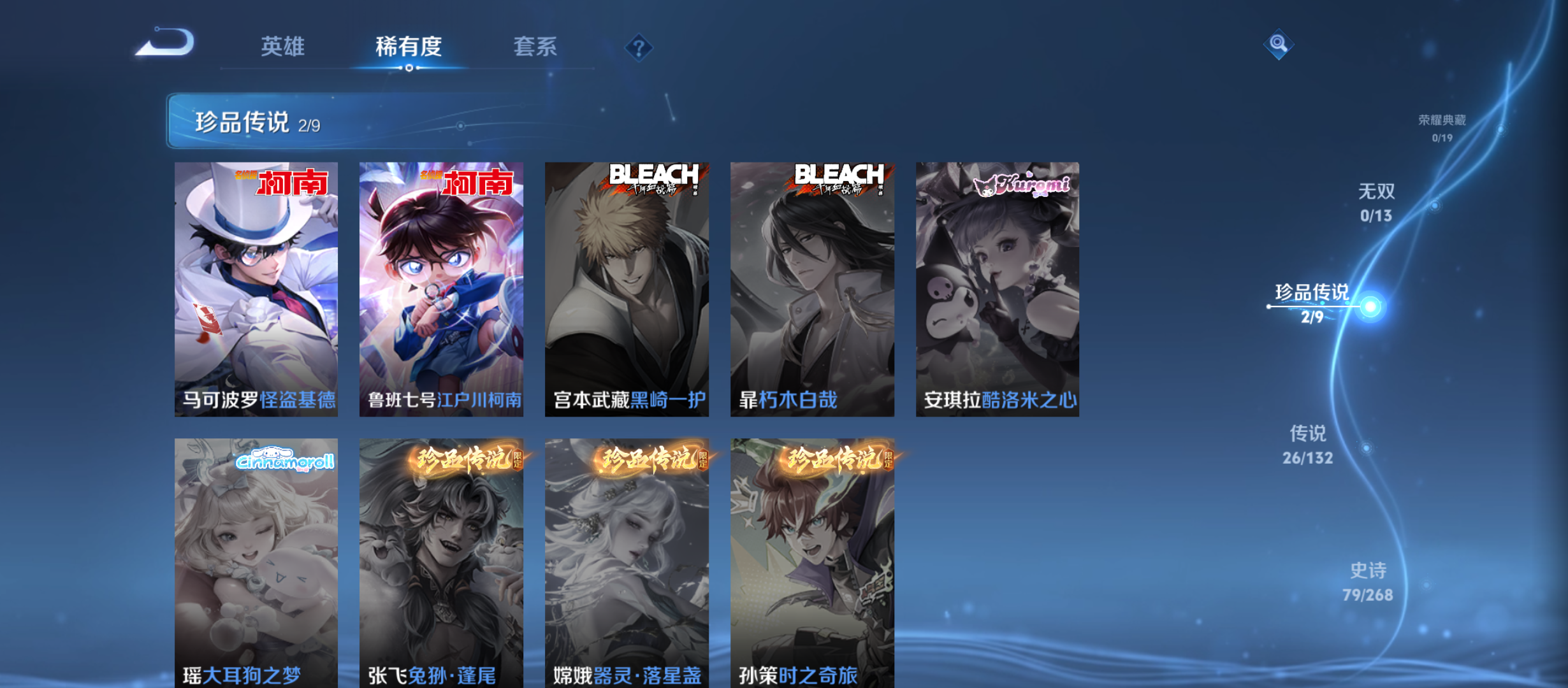 txwz29431 v8 274皮 2珍品 怪盗基德,江户川柯南 26传说 神树通天,地狱之眼,齐天大圣,燃星之曲,霜北刀,一念神魔,山海·炽霜斩,寅虎·赤拳,乘龙·铭钟鼎,琥珀纪元,祈雪灵祝,云霓雀翎,启明星使,逐花归海,乘龙·问璇玑,仲夏夜之梦,云鹰飞将,乘龙·淬吴钩,浮生妄,幻光神呛,鹤归松栖,诗剑行,霜月吟,鸣野蒿,落雪白狼,玄雷天君 78史诗