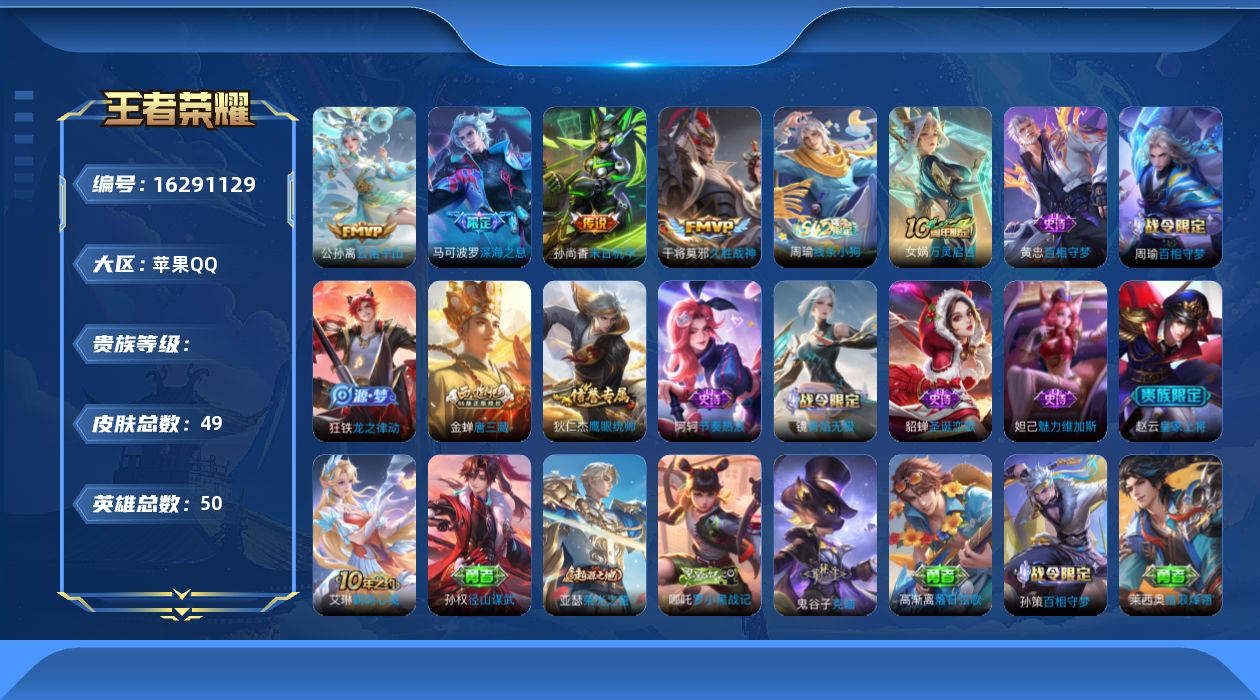 [16291129]hw8755苹果q-vundefined-永恒钻石ii-50英雄-49皮肤-0典藏-0无双-0珍品传说-5传说-8史诗 【稀有英雄】 不知火舞 娜可露露 艾琳 【传说皮肤】 云诺千山 深海之息 久胜战神 末日机甲 神树通天 【限定皮肤】 末日机甲 深海之息 【史诗皮肤】 唐三藏 龙之律动 魅力维加斯 鹰眼统帅 皇家上将 圣诞恋歌 青焰无极 节奏热浪