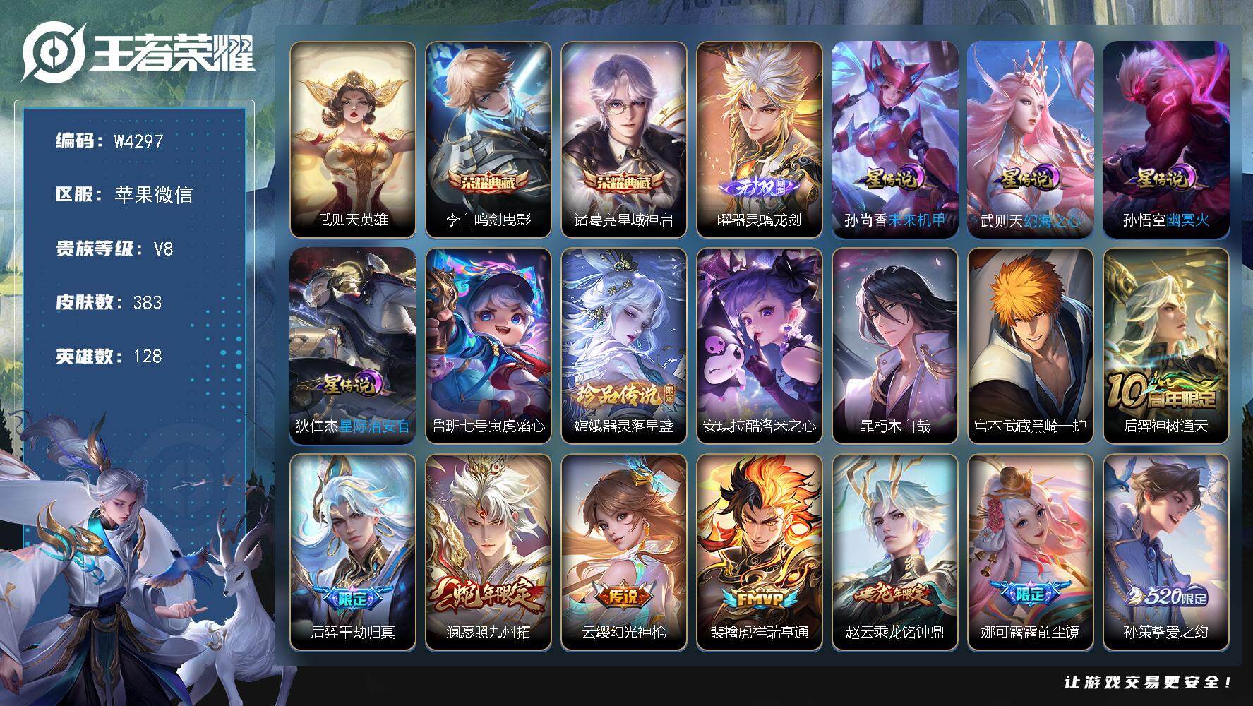 2425827-【w4297】8万战-36金标-曜器灵·螭龙剑-中路59段-打野57段-对抗路51段-发育路42段-苹果微-有二次-贵9-128英雄-384皮肤-3典藏(武则天)-1无双-4珍品传说-28传说-5星元-128限定-15按键-灵宝-23印记-11.1万贵族积分-营地522047043-热门皮肤-诸葛亮星域神启,李白鸣剑·曳影,宫本武藏黑崎一护,暃朽木白哉,安琪拉酷洛米之心,嫦娥