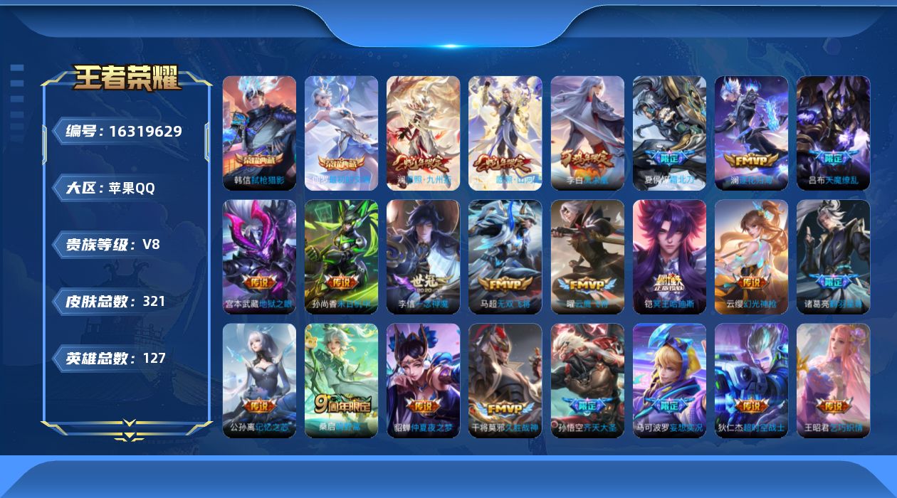 [16319629]v8 2典藏 24传说 127英雄 321皮肤 可修改实名 男号 【英雄全皮】空空儿全皮大禹全皮 【稀有英雄】大司命嬴政始皇帝韩信韩跳跳夏洛特夏师傅艾琳橘右京橘子娜可露露鸟人不知火舞赵云金蝉唐僧戈娅 【荣耀水晶】最初的交响伽罗典藏弑呛猎影韩信典藏 【传说皮】铠冥王哈迪斯幻光神呛地狱火仲夏夜之梦大飞蛾地狱之眼末日机甲-孙尚香绿蚂蚱一念神魔久胜战神云鹰飞将小将军无双飞将乞巧织情超时空战士-狄仁杰记忆之芯机甲兔鹤羽星尊妄想实况澜逐花归海 【珍宝阁皮】优雅恋人蔷薇恋人玩趣恶龙 【赛季/战令皮】噬灭天穹s37海盐诗旅s30擒涛扼浪s31顽趣-梦奇剑破天穹s35天穹祈灯s34天穹之誓s36蔡文姬夏日便利店虞姬夏日便利店蜃楼王s4妖精王s5炼金王s6凯尔特女王s7狰s8饕餮s9烛龙s10重明s11穷奇s12御狮s13御霄s14御旌s15御銮s16混沌棋s18疑决卦s19醍醐杖s20原初探秘者s21万华元夜s22演武夺筹s23驱傩正仪s24千军破阵s25狂想玩偶喵圣弓游侠真爱魔法火炮绅士沙漠行僧s26幻夜卜梦金庭之子s27大漠名商s28云中旅人s29 【史诗皮】雪豹·霜爪鸭鸭历险记-刘禅龙之律动石田雨龙器灵·浮梦炉茶境仙百相守梦-百里守约谪仙醉月星界特工炽弈燎原破空之剑东方月初蒙犽顽岩魄埋骨钱戍鼓铭心罗小黑战记-百里玄策线条小狗-周瑜九幽镇关紫霞仙子苍穹之光白龙吟黄金分割率特工魅影千年之狐永昼蒙恬荣光圣徽龙骑士小龙虾白蛇冰冠公主青蛇偶像歌手魅语晚萤末日机甲-吕布猫狗日记-孙策猫狗日记-大乔乱世虎臣节奏热浪修罗女仆咖啡摇滚巨星水果甜心绅士熊喵天才门将星夜王子心灵骇客时之奇旅-安琪拉功夫厨神德古拉伯爵暗隐猎兽者幽灵船长鬼剑武藏暗渊魔法心灵战警天秀·启明舞动绿茵地狱岩魂拒霜思缤纷独角兽乘风破浪逐浪之夏水晶猎龙者热力回旋金属风暴原初追逐者圣诞狂欢圣诞恋歌