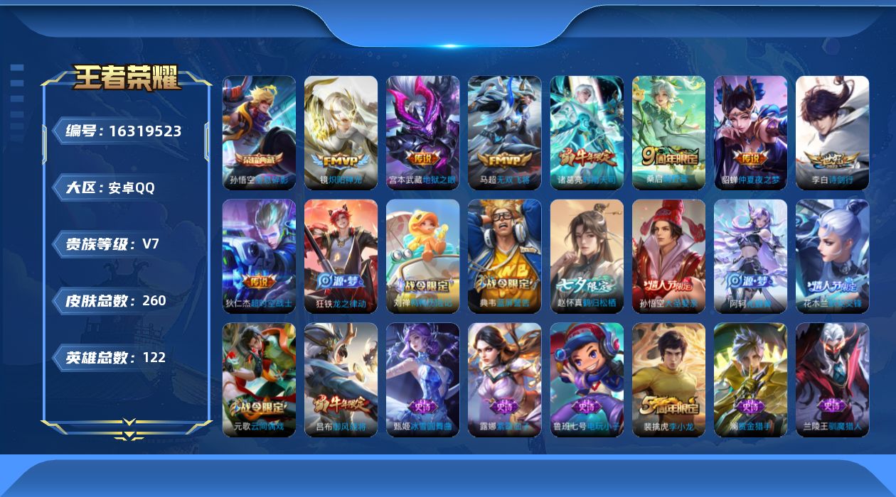[16319523]安卓q-v7-最强王者段位-122英雄-260皮肤-1典藏-0珍品无双-0无双-0珍品传说-8传说-68史诗 【荣耀典藏】:孙悟空全息碎影 【传说皮肤】:桑启鸣野蒿,李白诗剑行,马超无双飞将,诸葛亮时雨天司,镜炽阳神光,貂蝉仲夏夜之梦,宫本武藏地狱之眼,狄仁杰超时空战士 【限定皮肤】:白起狰,大乔绒语心约,姜子牙天穹之誓,杨戬破阵退雄兵,狄仁杰阴阳师,虞姬凯尔特女王,赵云皇家上将,嬴政白昼王子,鲁班七号狮舞东方,高渐离玩趣恶龙,芈月重明,吕布猎兽之王,吕布御风骁将,周瑜赤莲之焰,元歌云间偶戏,夏侯惇朔风刀,甄姬游园惊梦,曹操烛龙,典韦穷奇,典韦蓝屏警告,狄仁杰魔术师,狄仁杰万华元夜,达摩星际陆战队,项羽海滩派对,老夫子醍醐杖,程咬金演武夺筹,兰陵王驯魔猎人,花木兰默契交锋,亚瑟潮玩骑士王,孙悟空大圣娶亲,牛魔御旌,李元芳银河之约,钟馗神迹守卫,杨玉环遇见飞天,女娲朔望之晖,雅典娜单词大作战,蔡文姬繁星吟游,太乙真人饕餮,东皇太一逐梦之光,鬼谷子原初探秘者,诸葛亮时雨天司,苏烈千军破阵,百里玄策原初追逐者,弈星混沌棋,沈梦溪星空之诺,明世隐疑决卦,裴擒虎李小龙,裴擒虎擒涛扼浪,狂铁御狮,米莱狄御霄,云中君纤云弄巧,盾山御銮,上官婉儿梁祝,嫦娥拒霜思,蒙犽狂想玩偶喵,鲁班大师探海日志,桑启海盐诗旅,赵怀真鹤归松栖,阿古朵江河有灵,张良古海寻踪,蒙犽百解令,蒙恬荣光圣徽,鬼谷子天穹祈灯,伽罗琥珀纪元,刘邦剑破天穹,程咬金群星魔术团,镜青焰无极,项羽苍威无极,周瑜熔金海岸 【年限皮肤】:吕布御风骁将,诸葛亮时雨天司 【赛季限定】:白起狰,芈月重明,夏侯惇朔风刀,曹操烛龙,典韦穷奇,狄仁杰万华元夜,老夫子醍醐杖,程咬金演武夺筹,张良古海寻踪,牛魔御旌,虞姬凯尔特女王,太乙真人饕餮,鬼谷子原初探秘者,苏烈千军破阵,百里玄策原初追逐者,弈星混沌棋,明世隐疑决卦,裴擒虎擒涛扼浪,狂铁御狮,米莱狄御霄,盾山御銮,鲁班大师探海日志,桑启海盐诗旅,鬼谷子天穹祈灯,蒙恬荣光圣徽,刘邦剑破天穹,姜子牙天穹之誓 【战令限定】:嬴政白昼王子,鲁班七号狮舞东方,吕布猎兽之王,周瑜赤莲之焰,元歌云间偶戏,典韦蓝屏警告,达摩星际陆战队,兰陵王驯魔猎人,亚瑟潮玩骑士王,李元芳银河之约,钟馗神迹守卫,女娲朔望之晖,雅典娜单词大作战,沈梦溪星空之诺,蒙犽狂想玩偶喵,镜青焰无极,项羽苍威无极 【史诗皮肤】: