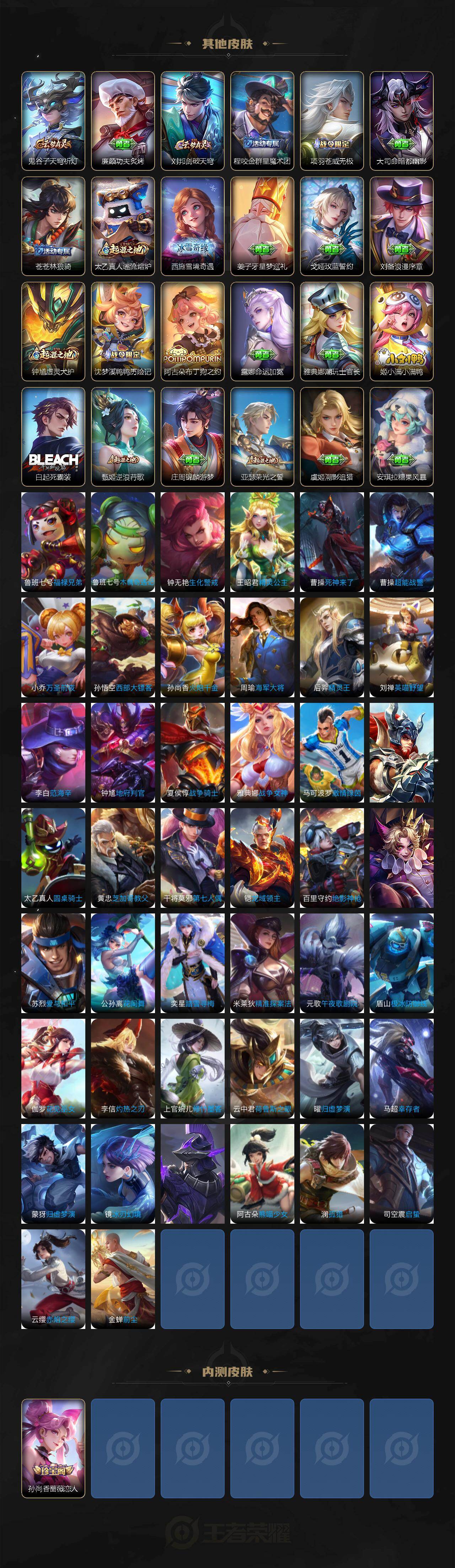 【wz180332】171皮肤-7传说-41史诗 【传说皮肤】:裴擒虎祥瑞亨通,镜炽阳神光,李信一念神魔,后羿黄金射手座,孙尚香末日机甲,孙悟空地狱火,狄仁杰超时空战士 【限定皮肤】:狄仁杰阴阳师,赵云皇家上将,墨子降魔,孙尚香蔷薇恋人,钟无艳超时空战士,芈月幻夜卜梦,元歌云间偶戏,元歌无心,甄姬落雪兰心,狄仁杰魔术师,狄仁杰万华元夜,达摩沙漠行僧,项羽海滩派对,老夫子醍醐杖,程咬金演武夺筹,韩信傲雪梅呛,王昭君午后时光,兰陵王金庭之子,亚瑟潮玩骑士王,孙悟空孙行者,李元芳云中旅人,钟馗神迹守卫,鬼谷子原初探秘者,鬼谷子五谷丰年,黄忠火炮绅士,百里守约朱雀志,沈梦溪大漠名商,裴擒虎李小龙,裴擒虎擒涛扼浪,云中君纤云弄巧,上官婉儿梁祝,嫦娥暖冬兔眠,鲁班大师探海日志,桑启海盐诗旅,暃星界游侠,张良古海寻踪,鬼谷子天穹祈灯,刘邦剑破天穹,程咬金群星魔术团,镜青焰无极,项羽苍威无极 【年限皮肤】:百里守约朱雀志 【赛季限定】:老夫子醍醐杖,鬼谷子原初探秘者,狄仁杰万华元夜,程咬金演武夺筹,达摩沙漠行僧,兰陵王金庭之子,沈梦溪大漠名商,李元芳云中旅人,桑启海盐诗旅,裴擒虎擒涛扼浪,鲁班大师探海日志,张良古海寻踪,鬼谷子天穹祈灯,刘邦剑破天穹,太乙真人谧流熔炉,钟馗虚灵犬护,甄姬逆浪荇歌,亚瑟荣光之誓,项羽九幽镇关 【战令限定】:钟馗神迹守卫,元歌云间偶戏,亚瑟潮玩骑士王,黄忠火炮绅士,芈月幻夜卜梦,王昭君午后时光,钟无艳超时空战士,甄姬落雪兰心,暃星界游侠,嫦娥暖冬兔眠,镜青焰无极,项羽苍威无极,刘禅鸭鸭历险记,沈梦溪鸭鸭历险记,周瑜线条小狗 【史诗皮肤】:阿轲暗夜猫娘,赵云皇家上将,貂蝉圣诞恋歌,甄姬冰雪圆舞曲,狄仁杰魔术师,宫本武藏鬼剑武藏,孙尚香蔷薇恋人,孙尚香水果甜心,妲己魅力维加斯,妲己女仆咖啡,吕布圣诞狂欢,刘邦德古拉伯爵,百里守约特工魅影,刘禅天才门将,李元芳逐浪之夏,程咬金功夫厨神,白起星夜王子,孙策猫狗日记,百里守约朱雀志,狄仁杰鹰眼统帅,上官婉儿梁祝,娜可露露晚萤,不知火舞魅语,橘右京修罗,裴擒虎李小龙,云中君纤云弄巧,元歌云间偶戏,钟馗乐园奇幻夜,孙悟空孙行者,黄忠火炮绅士,韩信傲雪梅呛,钟无艳超时空战士,鬼谷子五谷丰年,元歌无心,墨子降魔,暃星界游侠,镜青焰无极,狄仁杰绮世丹青,刘禅鸭鸭历险记,狂铁龙之律动,项羽九幽镇关,周瑜线条小狗 【其他皮肤】:项羽海滩派对,韩信教廷特使,韩信街头霸王,露娜哥特玫瑰,阿轲爱心护理,达摩大发明家,白起白色死神,牛魔西部大镖客,孙膑天使之翼,典韦黄金武士,亚瑟死亡骑士,花木兰兔女郎,甄姬花好人间,刘备万事如意,宫本武藏万象初新,后羿阿尔法小队,狄仁杰阴阳师,刘备纽约教父,墨子进击墨子号,钟无艳海滩丽影,老夫子功夫老勺,孙尚香沉稳之力,诸葛亮掌控之力,明世隐虹云星官,小乔丁香结,吕布野性能量,钟馗神迹守卫,姜子牙炽热元素使,盾山圆桌骑士,老夫子醍醐杖,鬼谷子原初探秘者,狄仁杰万华元夜,亚瑟潮玩骑士王,程咬金演武夺筹,张良缤纷绘卷,盘古重装意志,达摩沙漠行僧,芈月幻夜卜梦,兰陵王金庭之子,米莱狄契约魔法,王昭君午后时光,沈梦溪大漠名商,蒙犽胡桃狂想曲,甄姬落雪兰心,李元芳云中旅人,桑启海盐诗旅,嫦娥暖冬兔眠,海月幻泉雾影,猪八戒潮玩探月行,赵怀真太极少年,裴擒虎擒涛扼浪,鲁班大师探海日志,李元芳妄想特派,张良古海寻踪,鬼谷子天穹祈灯,廉颇功夫炙烤,刘邦剑破天穹,程咬金群星魔术团,项羽苍威无极,大司命暗都幽影,苍苍林狼骑,太乙真人谧流熔炉,西施雪境奇遇,姜子牙星梦巡礼,戈娅玫蓝誓约,刘备浪漫序章,钟馗虚灵犬护,沈梦溪鸭鸭历险记,阿古朵布丁狗之约,露娜命运加冕,雅典娜潮玩士官长,姬小满小满鸭,白起死霸装,甄姬逆浪荇歌,庄周锦麟游梦,亚瑟荣光之誓,虞姬溯影追猎,安琪拉糖果风暴,鲁班七号福禄兄弟,鲁班七号木偶奇遇记,钟无艳生化警戒,王昭君精灵公主,曹操死神来了,曹操超能战警,小乔万圣前夜,孙悟空西部大镖客,孙尚香火炮千金,周瑜海军大将,后羿精灵王,刘禅英喵野望,李白范海辛,钟馗地府判官,夏侯惇战争骑士,雅典娜战争女神,马可波罗激情绿茵,苍维京掠夺者,太乙真人圆桌骑士,黄忠芝加哥教父,干将莫邪第七人偶,铠龙域领主,百里守约绝影神呛,百里玄策威尼斯狂欢,苏烈爱与和平,公孙离花间舞,弈星踏雪寻梅,米莱狄精准探案法,元歌午夜歌剧院,盾山极冰防御线,伽罗花见巫女,李信灼热之刃,上官婉儿修竹墨客,云中君荷鲁斯之眼,曜归虚梦演,马超幸存者,蒙犽归虚梦演,镜冰刃幻境,蒙恬秩序猎龙将,阿古朵熊喵少女,澜孤猎,司空震启蛰,云缨赤焰之缨,金蝉前尘 【内测皮肤】:孙尚香蔷薇恋人 【