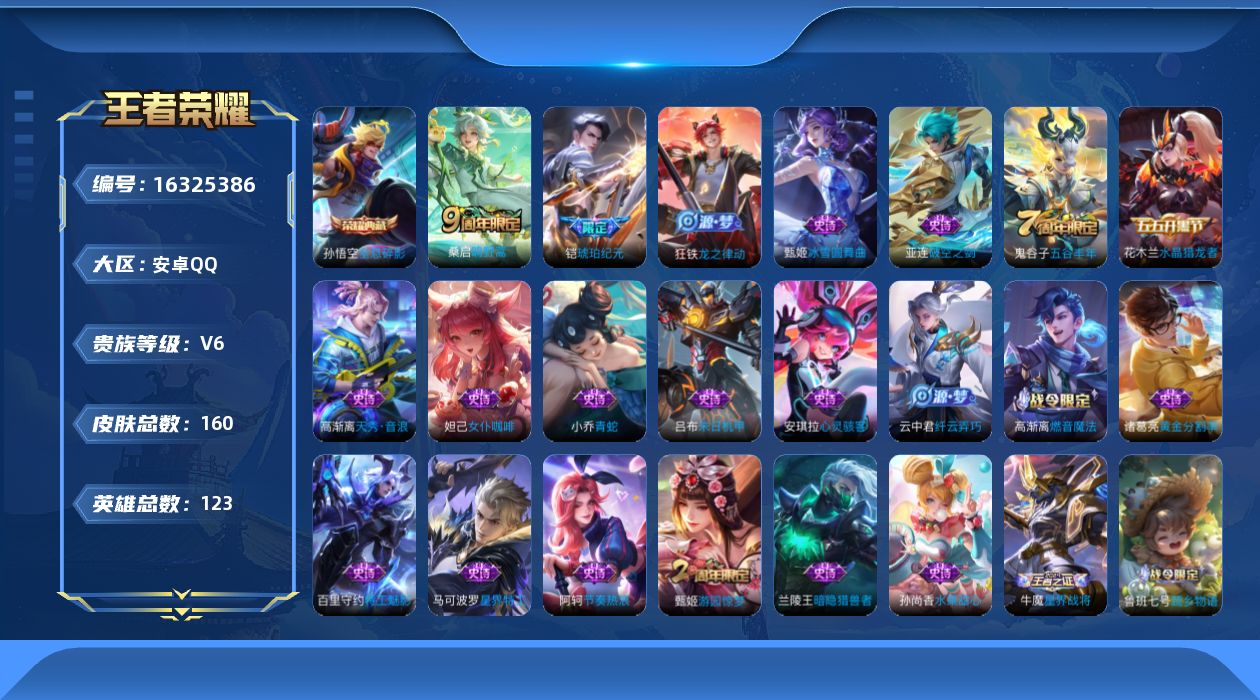 [16325386]安卓q-v6-最强王者段位-123英雄-160皮肤-1典藏皮肤-2传说-35史诗 【荣耀典藏】:孙悟空全息碎影 【传说皮肤】:桑启鸣野蒿,铠琥珀纪元 【限定皮肤】:蔡文姬夏日便利店,虞姬夏日便利店,姜子牙天穹之誓,狄仁杰阴阳师,赵云皇家上将,庄周高山流水,高渐离玩趣恶龙,甄姬游园惊梦,狄仁杰魔术师,狄仁杰万华元夜,达摩沙漠行僧,项羽海滩派对,老夫子醍醐杖,程咬金演武夺筹,兰陵王金庭之子,李元芳云中旅人,钟馗驱傩正仪,鬼谷子原初探秘者,鬼谷子五谷丰年,苏烈千军破阵,沈梦溪大漠名商,裴擒虎擒涛扼浪,云中君纤云弄巧,鲁班大师探海日志,桑启海盐诗旅,张良古海寻踪,高渐离燃音魔法,妲己灵卜魔法,鬼谷子天穹祈灯,铠琥珀纪元,沈梦溪龙舞盛年,鲁班七号蔬乡物语,李元芳蔬乡物语,刘邦剑破天穹,程咬金群星魔术团,周瑜熔金海岸 【赛季限定】:狄仁杰万华元夜,达摩沙漠行僧,老夫子醍醐杖,程咬金演武夺筹,兰陵王金庭之子,张良古海寻踪,李元芳云中旅人,钟馗驱傩正仪,鬼谷子原初探秘者,苏烈千军破阵,沈梦溪大漠名商,裴擒虎擒涛扼浪,鲁班大师探海日志,桑启海盐诗旅,鬼谷子天穹祈灯,刘邦剑破天穹,姜子牙天穹之誓 【战令限定】:蔡文姬夏日便利店,虞姬夏日便利店,高渐离燃音魔法,妲己灵卜魔法,鲁班七号蔬乡物语,李元芳蔬乡物语 【史诗皮肤】:赵云皇家上将,貂蝉圣诞恋歌,甄姬冰雪圆舞曲,王昭君偶像歌手,狄仁杰魔术师,宫本武藏鬼剑武藏,孙尚香水果甜心,嬴政摇滚巨星,妲己女仆咖啡,吕布末日机甲,张飞乱世虎臣,花木兰水晶猎龙者,刘邦德古拉伯爵,兰陵王暗隐猎兽者,诸葛亮黄金分割率,甄姬游园惊梦,亚瑟心灵战警,雅典娜冰冠公主,安琪拉心灵骇客,百里守约特工魅影,刘禅天才门将,程咬金功夫厨神,阿轲节奏热浪,小乔青蛇,云中君纤云弄巧,庄周高山流水,高渐离天秀音浪,鬼谷子五谷丰年,妲己灵卜魔法,高渐离燃音魔法,鲁班七号蔬乡物语,蔡文姬夏日便利店,亚连破空之剑,马可波罗星界特工,牛魔星界战将,狂铁龙之律动 【其他皮肤】:项羽海滩派对,韩信教廷特使,韩信街头霸王,露娜哥特玫瑰,阿轲爱心护理,达摩大发明家,赵云忍炎影,芈月红桃皇后,白起白色死神,武则天东方不败,扁鹊救世之瞳,宫本武藏未来纪元,妲己少女阿狸,典韦黄金武士,达摩拳王,花木兰兔女郎,甄姬花好人间,宫本武藏万象初新,后羿阿尔法小队,狄仁杰阴阳师,刘备汉昭烈帝,关羽龙腾万里