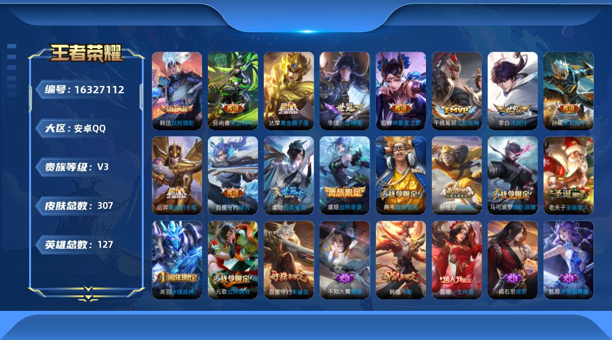 [16327112]安卓q-v3-尊贵铂金ii段位-127英雄-307皮肤-1典藏皮肤-12传说-83史诗 【英雄全皮】:影全皮 【荣耀典藏】:韩信弑呛猎影 【传说皮肤】:后羿神树通天,李白诗剑行,百里守约碎云,孙策末日机甲,虞姬启明星使,李信一念神魔,干将莫邪久胜战神,虞姬云霓雀翎,达摩黄金狮子座,后羿黄金射手座,貂蝉仲夏夜之梦,孙尚香末日机甲 【限定皮肤】:白起狰,狄仁杰阴阳师,虞姬凯尔特女王,赵云皇家上将,墨子神迹守卫,嬴政优雅恋人,嬴政白昼王子,孙尚香蔷薇恋人,鲁班七号狮舞东方,庄周蜃楼王,庄周高山流水,高渐离死亡摇滚,阿轲迷踪丽影,钟无艳王者之锤,钟无艳超时空战士,孙膑妖精王,扁鹊炼金王,芈月重明,吕布猎兽之王,周瑜赤莲之焰,元歌云间偶戏,元歌无心,夏侯惇朔风刀,甄姬游园惊梦,甄姬落雪兰心,曹操烛龙,典韦穷奇,典韦蓝屏警告,马可波罗暗影游猎,狄仁杰魔术师,狄仁杰万华元夜,达摩星际陆战队,达摩沙漠行僧,项羽海滩派对,老夫子圣诞老人,老夫子醍醐杖,老夫子航海奇遇记,关羽冰锋战神,程咬金演武夺筹,露娜一生所爱,刘邦夺宝奇兵,韩信逐梦之影,韩信飞衡,王昭君午后时光,兰陵王驯魔猎人,花木兰瑞麟志,亚瑟狮心王,亚瑟潮玩骑士王,孙悟空美猴王,孙悟空孙行者,牛魔御旌,后羿圣弓游侠,李元芳银河之约,李元芳云中旅人,虞姬启明星使,钟馗神迹守卫,钟馗驱傩正仪,杨玉环遇见飞天,杨戬潮玩骑兵,女娲朔望之晖,干将莫邪真爱魔法,雅典娜单词大作战,雅典娜黎明之约,蔡文姬繁星吟游,太乙真人饕餮,鬼谷子原初探秘者,鬼谷子五谷丰年,苏烈千军破阵,百里玄策原初追逐者,百里守约朱雀志,弈星混沌棋,沈梦溪星空之诺,沈梦溪大漠名商,明世隐疑决卦,裴擒虎李小龙,裴擒虎擒涛扼浪,狂铁御狮,狂铁电玩高手,米莱狄御霄,米莱狄胡桃异想国,云中君纤云弄巧,盾山御銮,猪八戒西部大镖客,上官婉儿梁祝,嫦娥暖冬兔眠,蒙犽狂想玩偶喵,鲁班大师探海日志,桑启海盐诗旅,暃星界游侠,艾琳女武神,张良古海寻踪,鬼谷子天穹祈灯,沈梦溪龙舞盛年,鲁班七号蔬乡物语,李元芳蔬乡物语,刘邦剑破天穹,程咬金群星魔术团 【年限皮肤】:百里守约朱雀志,花木兰瑞麟志,孙悟空美猴王,韩信飞衡 【赛季限定】:庄周蜃楼王,孙膑妖精王,扁鹊炼金王,白起狰,芈月重明,夏侯惇朔风刀,曹操烛龙,典韦穷奇,狄仁杰万华元夜,达摩沙漠行僧,老夫子醍醐杖,程咬金演武夺筹,张良古海寻踪,