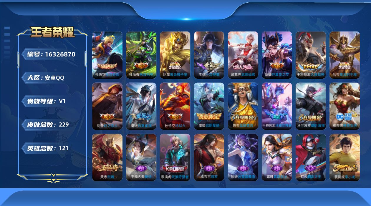 [16326870]安卓q-v0-121英雄-229皮肤-1典藏皮肤-11传说-59史诗 【荣耀典藏】:孙悟空全息碎影 【传说皮肤】:虞姬启明星使,李信一念神魔,刘备时之恋人,干将莫邪久胜战神,虞姬云霓雀翎,达摩黄金狮子座,后羿黄金射手座,诸葛亮武陵仙君,貂蝉仲夏夜之梦,孙尚香末日机甲,孙悟空地狱火 【限定皮肤】:白起狰,狄仁杰阴阳师,赵云皇家上将,嬴政优雅恋人,嬴政白昼王子,孙尚香蔷薇恋人,鲁班七号狮舞东方,阿轲迷踪丽影,钟无艳王者之锤,芈月重明,吕布猎兽之王,周瑜赤莲之焰,夏侯惇朔风刀,甄姬游园惊梦,曹操烛龙,典韦穷奇,典韦蓝屏警告,马可波罗暗影游猎,狄仁杰魔术师,狄仁杰万华元夜,达摩沙漠行僧,项羽海滩派对,老夫子醍醐杖,程咬金演武夺筹,刘邦夺宝奇兵,兰陵王驯魔猎人,兰陵王金庭之子,牛魔御旌,李元芳银河之约,李元芳云中旅人,虞姬启明星使,钟馗神迹守卫,钟馗驱傩正仪,杨玉环遇见飞天,女娲朔望之晖,干将莫邪冰霜恋舞曲,蔡文姬繁星吟游,太乙真人饕餮,鬼谷子原初探秘者,鬼谷子五谷丰年,诸葛亮武陵仙君,黄忠烈魂,苏烈千军破阵,百里玄策原初追逐者,弈星混沌棋,沈梦溪星空之诺,沈梦溪大漠名商,明世隐疑决卦,裴擒虎天狼狩猎者,裴擒虎李小龙,裴擒虎擒涛扼浪,狂铁御狮,米莱狄御霄,盾山御銮,猪八戒西部大镖客,上官婉儿梁祝,鲁班大师探海日志,桑启海盐诗旅,阿古朵江河有灵,张良古海寻踪,鬼谷子天穹祈灯,刘邦剑破天穹,程咬金群星魔术团 【年限皮肤】:黄忠烈魂 【赛季限定】:白起狰,芈月重明,夏侯惇朔风刀,曹操烛龙,典韦穷奇,狄仁杰万华元夜,达摩沙漠行僧,老夫子醍醐杖,程咬金演武夺筹,兰陵王金庭之子,张良古海寻踪,牛魔御旌,李元芳云中旅人,钟馗驱傩正仪,太乙真人饕餮,鬼谷子原初探秘者,苏烈千军破阵,百里玄策原初追逐者,弈星混沌棋,沈梦溪大漠名商,明世隐疑决卦,裴擒虎擒涛扼浪,狂铁御狮,米莱狄御霄,盾山御銮,鲁班大师探海日志,桑启海盐诗旅,鬼谷子天穹祈灯,刘邦剑破天穹 【战令限定】:嬴政白昼王子,鲁班七号狮舞东方,阿轲迷踪丽影,吕布猎兽之王,周瑜赤莲之焰,典韦蓝屏警告,马可波罗暗影游猎,刘邦夺宝奇兵,兰陵王驯魔猎人,李元芳银河之约,钟馗神迹守卫,女娲朔望之晖,沈梦溪星空之诺,猪八戒西部大镖客 【史诗皮肤】:露娜紫霞仙子,钟无艳王者之锤,赵云嘻哈天王,赵云皇家上将,赵云未来纪元,甄姬冰雪圆舞曲,王昭君偶像歌手,