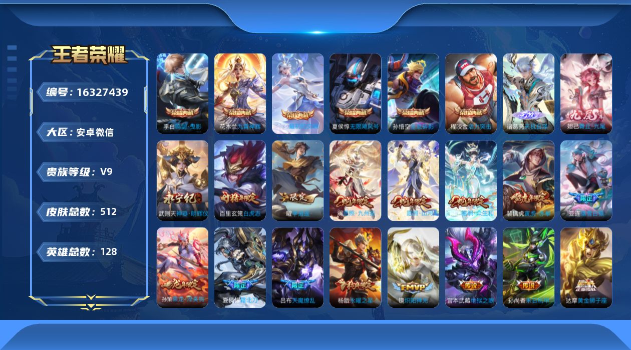 [16327439]【特价出售/店主推荐】安卓wx-v9-最强王者段位-128英雄-511皮肤-6典藏皮肤-1典藏英雄-3无双-52传说-167史诗 【英雄全皮】:达摩全皮,刘邦全皮,孙权全皮,钟馗全皮,雅典娜全皮,太乙真人全皮,苏烈全皮,弈星全皮,米莱狄全皮,盾山全皮,猪八戒全皮,司空震全皮,金蝉全皮,戈娅全皮,空空儿全皮,影全皮,少司缘全皮 【荣耀典藏】:武则天英雄,孙悟空全息碎影,夏侯惇无限飓风号,程咬金活力突击,李白鸣剑曳影,花木兰九霄神辉,伽罗最初的交响 【无双皮肤】:武则天神器明辉仪,妲己青丘九尾,诸葛亮天机白泽 【传说皮肤】:后羿神树通天,干将莫邪千山共赴,司空震愿照山河定,妲己愿照众生和,澜愿照九州拓,云缨幻光神呛,桑启鸣野蒿,夏侯惇霜北刀,亚连落雪白狼,吕布曦玄引,典韦战鼓燎原,孙策乘龙淬吴钩,艾琳觅芳踪,露娜霜月吟,马可波罗妄想实况,东皇太一灼幽烈阳,张飞百相守梦,干将莫邪画中仙,花木兰燃星之曲,吕布怒海麟威,马超无双飞将,蔡文姬花朝如约,孙策末日机甲,裴擒虎寅虎赤拳,赵云淬星耀世,王昭君乞巧织情,西施游龙清影,曜李 ,周瑜音你心动,小乔音你心动,诸葛亮时雨天司,铠绛天战甲,镜炽阳神光,虞姬启明星使,曜云鹰飞将,李信一念神魔,刘备时之恋人,貂蝉猫影幻舞,干将莫邪久胜战神,虞姬云霓雀翎,达摩黄金狮子座,百里玄策白虎志,花木兰冠军飞将,梦奇胖达荣荣,后羿黄金射手座,杨戬永曜之星,貂蝉仲夏夜之梦,孙尚香末日机甲,宫本武藏地狱之眼,吕布天魔缭乱,武则天海洋之心,狄仁杰超时空战士 【限定皮肤】:白起狰,夏侯惇霜北刀,暃埋骨钱,蔡文姬夏日便利店,虞姬夏日便利店,姜子牙天穹之誓,杨戬破阵退雄兵,狄仁杰阴阳师,虞姬凯尔特女王,赵云皇家上将,墨子神迹守卫,嬴政白昼王子,孙尚香蔷薇恋人,鲁班七号狮舞东方,庄周高山流水,高渐离死亡摇滚,高渐离玩趣恶龙,阿轲迷踪丽影,钟无艳超时空战士,扁鹊奇幻香踪,白起夜都怪侠,芈月重明,芈月白晶晶,芈月幻夜卜梦,吕布天魔缭乱,吕布猎兽之王,周瑜赤莲之焰,元歌无心,夏侯惇朔风刀,甄姬女儿国国王,甄姬游园惊梦,甄姬落雪兰心,曹操烛龙,典韦穷奇,典韦岱宗,马可波罗暗影游猎,马可波罗山海玄木吟,马可波罗妄想实况,狄仁杰魔术师,狄仁杰万华元夜,达摩星际陆战队,达摩沙漠行僧,项羽海滩派对,老夫子圣诞老人,老夫子醍醐杖,老夫子航海奇遇记,关羽冰锋战神,程咬金演武