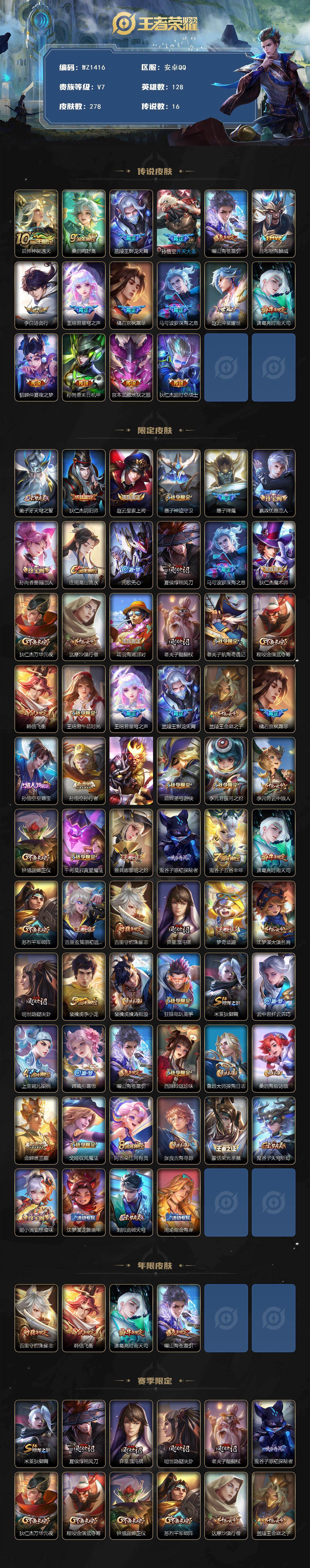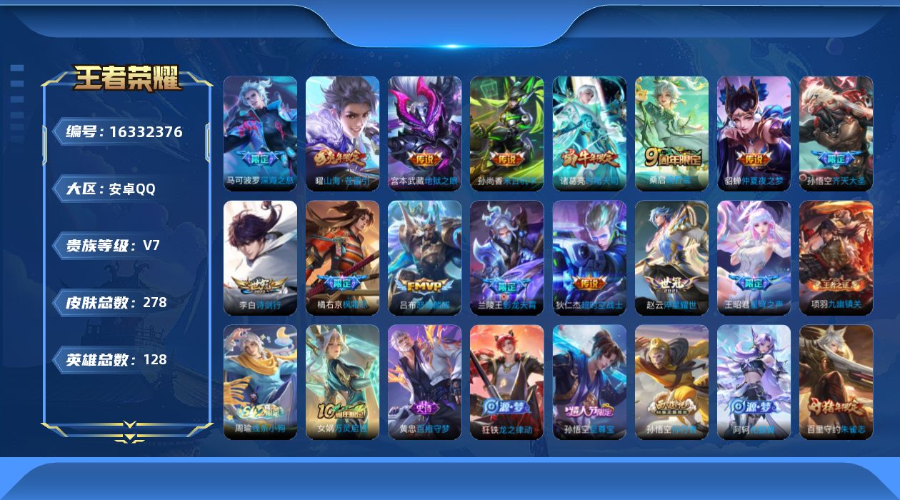 [16332376]安卓q-v7-128英雄-278皮肤-16传说-71史诗 【英雄全皮】:孙权全皮,金蝉全皮,戈娅全皮,影全皮 【传说皮肤】:后羿神树通天,桑启鸣野蒿,兰陵王影龙天霄,孙悟空齐天大圣,曜山海苍雷引,吕布怒海麟威,李白诗剑行,王昭君星穹之声,橘右京枫霜尽,马可波罗深海之息,赵云淬星耀世,诸葛亮时雨天司,貂蝉仲夏夜之梦,孙尚香末日机甲,宫本武藏地狱之眼,狄仁杰超时空战士 【限定皮肤】:姜子牙天穹之誓,狄仁杰阴阳师,赵云皇家上将,墨子神迹守卫,墨子降魔,嬴政优雅恋人,孙尚香蔷薇恋人,庄周高山流水,元歌无心,夏侯惇朔风刀,马可波罗深海之息,狄仁杰魔术师,狄仁杰万华元夜,达摩沙漠行僧,项羽海滩派对,老夫子醍醐杖,老夫子航海奇遇记,程咬金演武夺筹,韩信飞衡,王昭君午后时光,王昭君星穹之声,兰陵王影龙天霄,兰陵王金庭之子,橘右京枫霜尽,孙悟空至尊宝,孙悟空孙行者,孙悟空齐天大圣,后羿圣弓游侠,李元芳银河之约,李元芳云中旅人,钟馗驱傩正仪,干将莫邪真爱魔法,雅典娜黎明之约,鬼谷子原初探秘者,鬼谷子五谷丰年,诸葛亮时雨天司,苏烈千军破阵,百里玄策原初追逐者,百里守约朱雀志,弈星混沌棋,梦奇顽趣,沈梦溪大漠名商,明世隐疑决卦,裴擒虎李小龙,裴擒虎擒涛扼浪,狂铁电玩高手,米莱狄御霄,云中君纤云弄巧,上官婉儿梁祝,嫦娥拒霜思,曜山海苍雷引,西施玲珑珍味,鲁班大师探海日志,桑启海盐诗旅,金蝉唐三藏,戈娅驭风魔法,阿古朵江河有灵,张良古海寻踪,蒙恬荣光圣徽,鬼谷子天穹祈灯,姬小满妄想食味,沈梦溪龙舞盛年,刘邦剑破天穹,周瑜熔金海岸 【年限皮肤】:百里守约朱雀志,韩信飞衡,诸葛亮时雨天司,曜山海苍雷引 【赛季限定】:米莱狄御霄,夏侯惇朔风刀,弈星混沌棋,明世隐疑决卦,老夫子醍醐杖,鬼谷子原初探秘者,狄仁杰万华元夜,程咬金演武夺筹,钟馗驱傩正仪,苏烈千军破阵,达摩沙漠行僧,兰陵王金庭之子,沈梦溪大漠名商,李元芳云中旅人,桑启海盐诗旅,裴擒虎擒涛扼浪,鲁班大师探海日志,张良古海寻踪,鬼谷子天穹祈灯,刘邦剑破天穹,姜子牙天穹之誓,东皇太一噬灭天穹,太乙真人谧流熔炉,钟馗虚灵犬护,甄姬逆浪荇歌,亚瑟荣光之誓,百里玄策原初追逐者,雅典娜黎明之约,梦奇顽趣,蒙恬荣光圣徽,牛魔星界战将,项羽九幽镇关 【战令限定】:李元芳银河之约,老夫子航海奇遇记,墨子神迹守卫,干将莫邪真爱魔法,后羿圣弓游侠,狂铁电玩高手,王