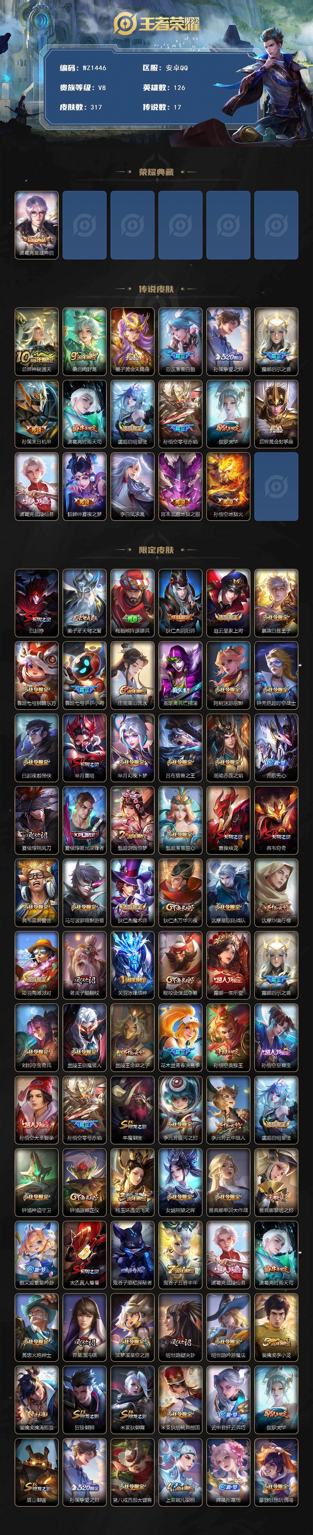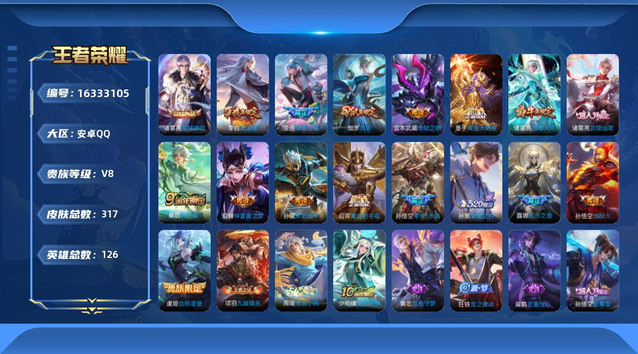 [16333105]西施星传说-7按键-安卓q-v8-126英雄-317皮肤-1典藏皮肤-17传说-90史诗 【荣耀典藏】:诸葛亮星域神启 【传说皮肤】:后羿神树通天,桑启鸣野蒿,墨子黄金天蝎座,亚连落雪白狼,孙策挚爱之约,露娜启示之音,孙策末日机甲,诸葛亮时雨天司,虞姬启明星使,孙悟空零号赤焰,伽罗太华,后羿黄金射手座,诸葛亮武陵仙君,貂蝉仲夏夜之梦,李白凤求凰,宫本武藏地狱之眼,孙悟空地狱火 【限定皮肤】:白起狰,姜子牙天穹之誓,杨戬破阵退雄兵,狄仁杰阴阳师,赵云皇家上将,嬴政白昼王子,鲁班七号狮舞东方,鲁班七号乒乒小将,庄周高山流水,高渐离死亡摇滚,阿轲迷踪丽影,钟无艳超时空战士,白起夜都怪侠,芈月重明,芈月幻夜卜梦,吕布猎兽之王,周瑜赤莲之焰,元歌无心,夏侯惇朔风刀,夏侯惇匿光决锋者,甄姬游园惊梦,甄姬落雪兰心,曹操烛龙,典韦穷奇,典韦蓝屏警告,马可波罗暗影游猎,狄仁杰魔术师,狄仁杰万华元夜,达摩星际陆战队,达摩沙漠行僧,项羽海滩派对,老夫子醍醐杖,关羽冰锋战神,程咬金演武夺筹,露娜一生所爱,露娜启示之音,刘邦夺宝奇兵,兰陵王驯魔猎人,兰陵王金庭之子,花木兰青春决赛季,孙悟空美猴王,孙悟空至尊宝,孙悟空大圣娶亲,孙悟空零号赤焰,牛魔御旌,李元芳银河之约,李元芳云中旅人,虞姬启明星使,钟馗神迹守卫,钟馗驱傩正仪,杨玉环遇见飞天,女娲朔望之晖,雅典娜单词大作战,雅典娜黎明之约,蔡文姬繁星吟游,太乙真人饕餮,鬼谷子原初探秘者,鬼谷子五谷丰年,诸葛亮武陵仙君,诸葛亮时雨天司,黄忠火炮绅士,弈星混沌棋,沈梦溪星空之诺,明世隐疑决卦,明世隐吟游魔法,裴擒虎李小龙,裴擒虎擒涛扼浪,狂铁御狮,米莱狄御霄,米莱狄胡桃异想国,云中君纤云弄巧,伽罗太华,盾山御銮,孙策挚爱之约,猪八戒西部大镖客,上官婉儿梁祝,嫦娥拒霜思,蒙犽狂想玩偶喵,鲁班大师探海日志,桑启海盐诗旅,艾琳女武神,阿古朵江河有灵,张良古海寻踪,蒙犽百解令,蒙恬荣光圣徽,鬼谷子天穹祈灯,伽罗琥珀纪元,姬小满妄想食味,亚连落雪白狼,刘邦剑破天穹,程咬金群星魔术团,周瑜熔金海岸 【年限皮肤】:孙悟空美猴王,李白凤求凰,伽罗太华,诸葛亮时雨天司 【赛季限定】:白起狰,太乙真人饕餮,曹操烛龙,芈月重明,典韦穷奇,狂铁御狮,米莱狄御霄,牛魔御旌,盾山御銮,夏侯惇朔风刀,弈星混沌棋,明世隐疑决卦,老夫子醍醐杖,鬼谷子原初探秘者,狄仁杰万华元夜,程