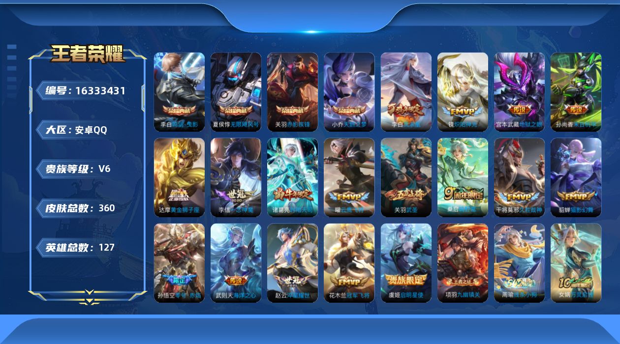 [16333431]安卓q-v6-127英雄-360皮肤-4典藏皮肤-1典藏英雄-17传说-107史诗 【英雄全皮】:猪八戒全皮,戈娅全皮,影全皮 【荣耀典藏】:武则天英雄,夏侯惇无限飓风号,小乔天鹅之梦,李白鸣剑曳影,关羽赤影疾锋 【传说皮肤】:桑启鸣野蒿,赵云淬星耀世,诸葛亮时雨天司,镜炽阳神光,虞姬启明星使,孙悟空零号赤焰,关羽武圣,曜云鹰飞将,李信一念神魔,貂蝉猫影幻舞,干将莫邪久胜战神,达摩黄金狮子座,花木兰冠军飞将,李白凤求凰,孙尚香末日机甲,宫本武藏地狱之眼,武则天海洋之心 【限定皮肤】:白起狰,姜子牙天穹之誓,狄仁杰阴阳师,虞姬凯尔特女王,赵云皇家上将,墨子神迹守卫,嬴政优雅恋人,嬴政白昼王子,鲁班七号狮舞东方,庄周高山流水,高渐离死亡摇滚,高渐离玩趣恶龙,阿轲迷踪丽影,钟无艳超时空战士,扁鹊炼金王,扁鹊奇幻香踪,白起夜都怪侠,芈月重明,芈月幻夜卜梦,吕布猎兽之王,吕布御风骁将,周瑜赤莲之焰,元歌云间偶戏,夏侯惇朔风刀,甄姬游园惊梦,甄姬落雪兰心,曹操烛龙,典韦穷奇,典韦蓝屏警告,马可波罗暗影游猎,狄仁杰魔术师,狄仁杰万华元夜,达摩星际陆战队,达摩沙漠行僧,项羽海滩派对,老夫子醍醐杖,老夫子航海奇遇记,关羽冰锋战神,关羽武圣,程咬金演武夺筹,刘邦夺宝奇兵,韩信逐梦之影,王昭君午后时光,兰陵王驯魔猎人,兰陵王金庭之子,花木兰默契交锋,亚瑟潮玩骑士王,孙悟空大圣娶亲,孙悟空零号赤焰,牛魔御旌,后羿圣弓游侠,李元芳银河之约,李元芳云中旅人,虞姬启明星使,钟馗神迹守卫,钟馗驱傩正仪,杨戬潮玩骑兵,女娲朔望之晖,干将莫邪冰霜恋舞曲,干将莫邪真爱魔法,雅典娜单词大作战,雅典娜黎明之约,蔡文姬繁星吟游,太乙真人饕餮,鬼谷子原初探秘者,鬼谷子五谷丰年,诸葛亮时雨天司,黄忠火炮绅士,铠青龙志,苏烈千军破阵,百里玄策原初追逐者,弈星混沌棋,梦奇顽趣,沈梦溪星空之诺,沈梦溪大漠名商,明世隐疑决卦,明世隐吟游魔法,裴擒虎李小龙,裴擒虎擒涛扼浪,狂铁御狮,狂铁电玩高手,米莱狄御霄,米莱狄胡桃异想国,云中君纤云弄巧,盾山御銮,猪八戒西部大镖客,猪八戒猪悟能,上官婉儿梁祝,嫦娥暖冬兔眠,西施玲珑珍味,蒙犽狂想玩偶喵,鲁班大师探海日志,桑启海盐诗旅,暃星界游侠,戈娅驭风魔法,艾琳流音漫舞,赵怀真鹤归松栖,司空震地狱燃心,阿古朵江河有灵,张良古海寻踪,蒙恬荣光圣徽,鬼谷子天穹祈灯,姬小满妄想食味,沈梦