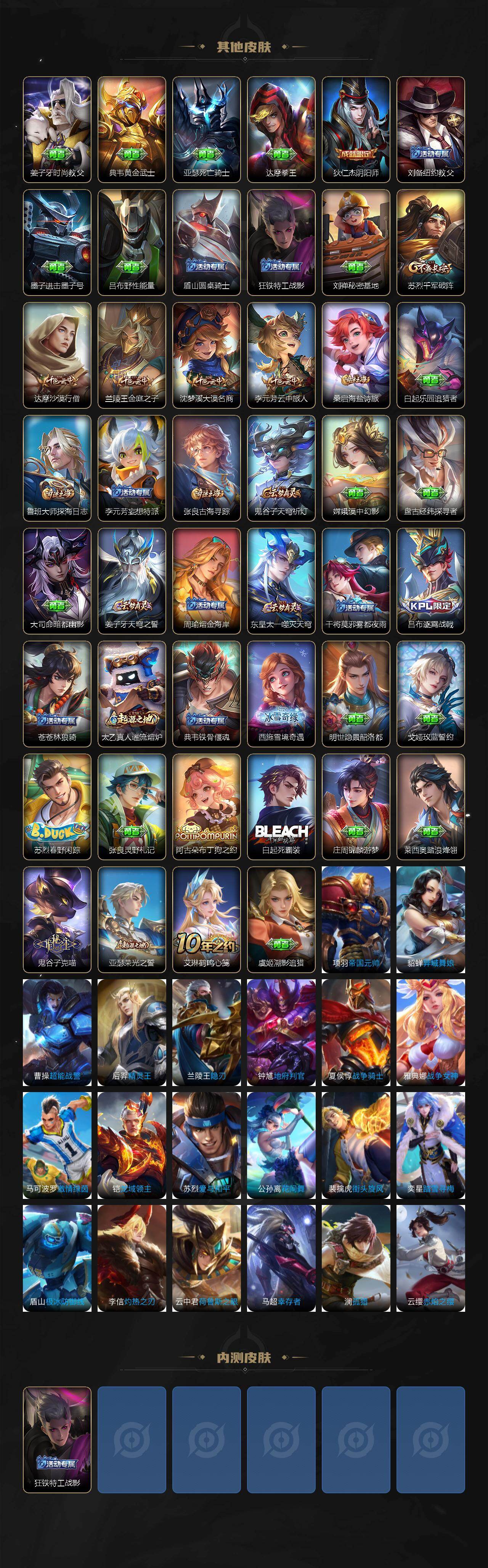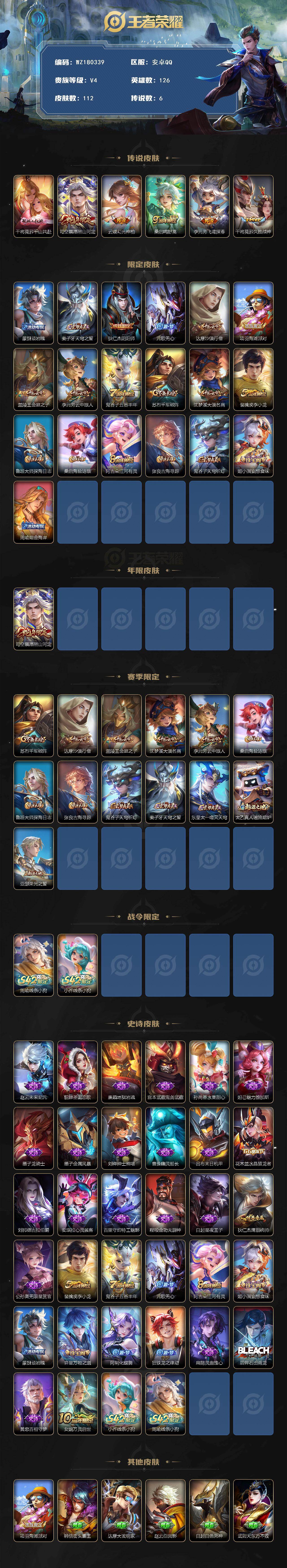 【wz180339】112皮肤-6传说-33史诗 【传说皮肤】:干将莫邪千山共赴,司空震愿照山河定,云缨幻光神呛,桑启鸣野蒿,李元芳飞鸢探春,干将莫邪久胜战神 【限定皮肤】:蒙犽顽岩魄,姜子牙天穹之誓,狄仁杰阴阳师,元歌无心,达摩沙漠行僧,项羽海滩派对,兰陵王金庭之子,李元芳云中旅人,鬼谷子五谷丰年,苏烈千军破阵,沈梦溪大漠名商,裴擒虎李小龙,鲁班大师探海日志,桑启海盐诗旅,阿古朵江河有灵,张良古海寻踪,鬼谷子天穹祈灯,姬小满妄想食味,周瑜熔金海岸 【年限皮肤】:司空震愿照山河定 【赛季限定】:苏烈千军破阵,达摩沙漠行僧,兰陵王金庭之子,沈梦溪大漠名商,李元芳云中旅人,桑启海盐诗旅,鲁班大师探海日志,张良古海寻踪,鬼谷子天穹祈灯,姜子牙天穹之誓,东皇太一噬灭天穹,太乙真人谧流熔炉,亚瑟荣光之誓 【战令限定】:周瑜线条小狗,小乔线条小狗 【史诗皮肤】:赵云未来纪元,貂蝉圣诞恋歌,廉颇地狱岩魂,宫本武藏鬼剑武藏,孙尚香水果甜心,妲己魅力维加斯,墨子龙骑士,墨子金属风暴,刘禅绅士熊喵,曹操幽灵船长,吕布末日机甲,花木兰水晶猎龙者,刘邦德古拉伯爵,安琪拉心灵骇客,百里守约特工魅影,程咬金功夫厨神,白起星夜王子,狄仁杰鹰眼统帅,公孙离无限星赏官,裴擒虎李小龙,鬼谷子五谷丰年,元歌无心,阿古朵江河有灵,姬小满妄想食味,蒙犽顽岩魄,弈星万物之道,阿轲化蝶舞,狂铁龙之律动,扁鹊灵蛊蚀心,后羿石田雨龙,黄忠百相守梦,女娲万灵启世,小乔线条小狗,周瑜线条小狗 【其他皮肤】:项羽海滩派对,韩信街头霸王,达摩大发明家,赵云忍炎影,白起白色死神,武则天东方不败,姜子牙时尚教父,典韦黄金武士,亚瑟死亡骑士,达摩拳王,狄仁杰阴阳师,刘备纽约教父,墨子进击墨子号,吕布野性能量,盾山圆桌骑士,狂铁特工战影,刘禅秘密基地,苏烈千军破阵,达摩沙漠行僧,兰陵王金庭之子,沈梦溪大漠名商,李元芳云中旅人,桑启海盐诗旅,白起乐园追猎者,鲁班大师探海日志,李元芳妄想特派,张良古海寻踪,鬼谷子天穹祈灯,嫦娥漠中幻影,盘古经纬探寻者,大司命暗都幽影,姜子牙天穹之誓,周瑜熔金海岸,东皇太一噬灭天穹,干将莫邪雾都夜雨,吕布逐霄战戟,苍苍林狼骑,太乙真人谧流熔炉,典韦铁骨偃魂,西施雪境奇遇,明世隐景韶洛都,戈娅玫蓝誓约,苏烈春野闲踪,张良灵野札记,阿古朵布丁狗之约,白起死霸装,庄周锦麟游梦,莱西奥踏浪烽翎,鬼谷子克喵,亚瑟荣光之誓,艾琳鹤鸣心笺,虞姬溯影追猎,项羽帝国元帅,貂蝉异域舞娘,曹操超能战警,后羿精灵王,兰陵王隐刃,钟馗地府判官,夏侯惇战争骑士,雅典娜战争女神,马可波罗激情绿茵,铠龙域领主,苏烈爱与和平,公孙离花间舞,裴擒虎街头旋风,弈星踏雪寻梅,盾山极冰防御线,李信灼热之刃,云中君荷鲁斯之眼,马超幸存者,澜孤猎,云缨赤焰之缨 【内测皮肤】:狂铁特工战影 【