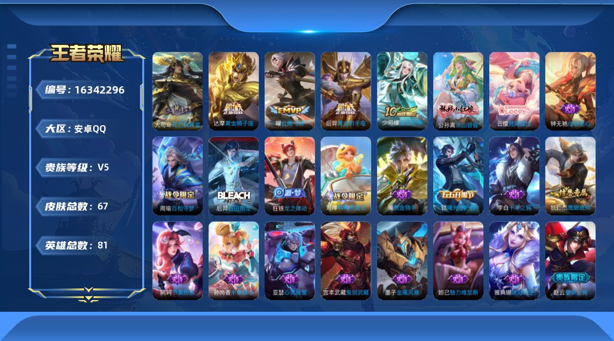 [16342296]v5 4传说 81英雄 67皮肤 可修改实名 男号 【英雄全皮】空空儿全皮 【稀有英雄】大司命艾琳橘右京橘子娜可露露鸟人不知火舞戈娅 【传说皮】死亡执政官黄金狮子座黄金射手座云鹰飞将小将军 【史诗皮】赞萌露比鸭鸭历险记-刘禅龙之律动石田雨龙百相守梦-周瑜涂山容容戍鼓铭心巫礼祀神千年之狐冰冠公主节奏热浪水果甜心鬼剑武藏心灵战警曙光守护者金属风暴鹰眼统帅魅力维加斯赏金猎手 【普通皮】谧流熔炉街头霸王玫蓝誓约鹤鸣心笺荣光之誓浪漫序章落日弦歌克喵逐霄之志戏梦巡演命运加冕锦麟游梦虚灵犬护鸭鸭历险记-沈梦溪春野闲踪布丁狗之约灵野札记潮玩士官长小满鸭死霸装逆浪荇歌踏浪烽翎百相守梦-孙策海滩派对皇家上将掌控之力纽约教父万象初新哥特玫瑰阴阳师兔女郎死亡骑士忍·炎影救世之瞳铁甲之心拳王幻乐之宴重装意志幸存者启蛰秩序猎龙将绝影神呛时尚教父潮玩牛仔
