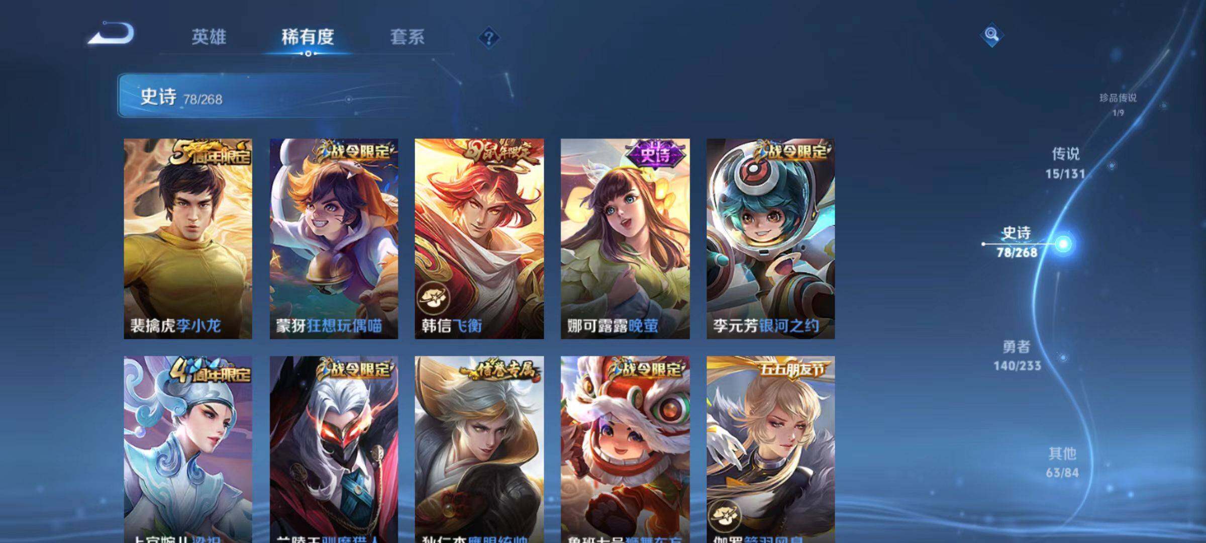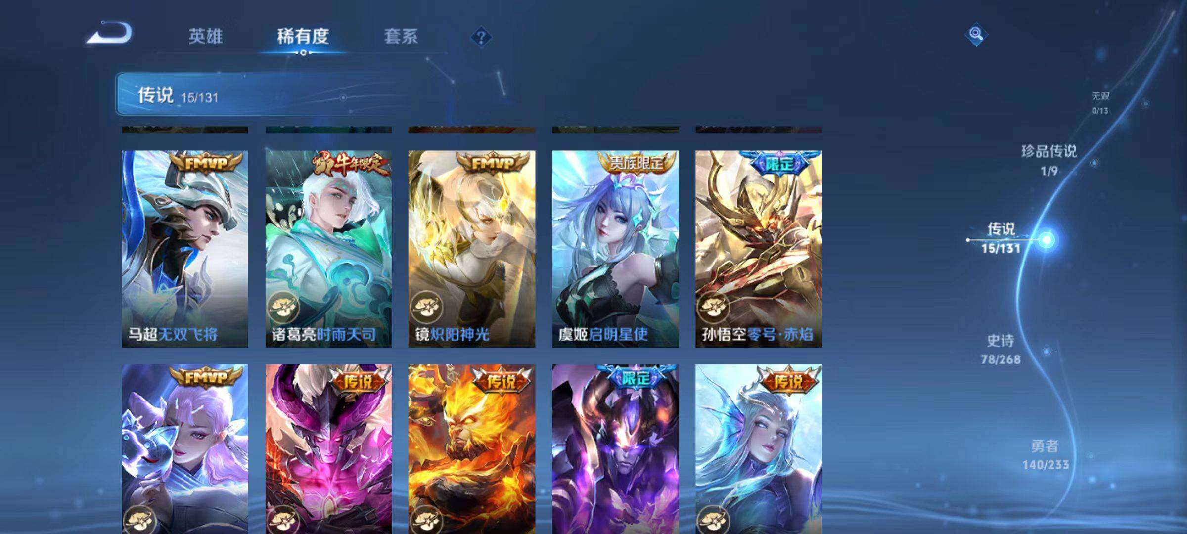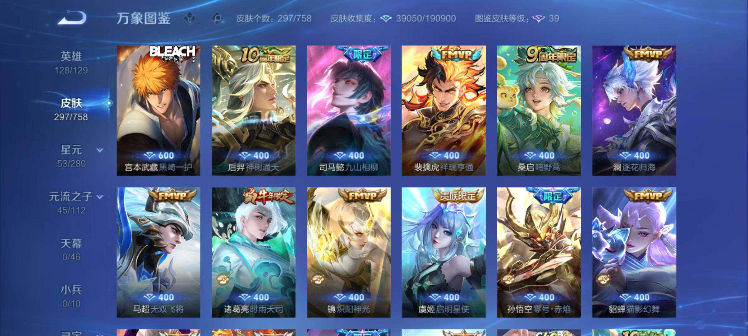 128英雄-297皮肤-安卓q-v8-297皮肤-1典藏英雄-1珍品传说-15传说-77史诗 【英雄全皮】:狂铁全皮,影全皮 【荣耀典藏】:武则天英雄 【珍品传说】:宫本武藏黑崎一护 【传说皮肤】:后羿神树通天,司马懿九山相柳,裴擒虎祥瑞亨通,桑启鸣野蒿,澜逐花归海,马超无双飞将,诸葛亮时雨天司,镜炽阳神光,虞姬启明星使,