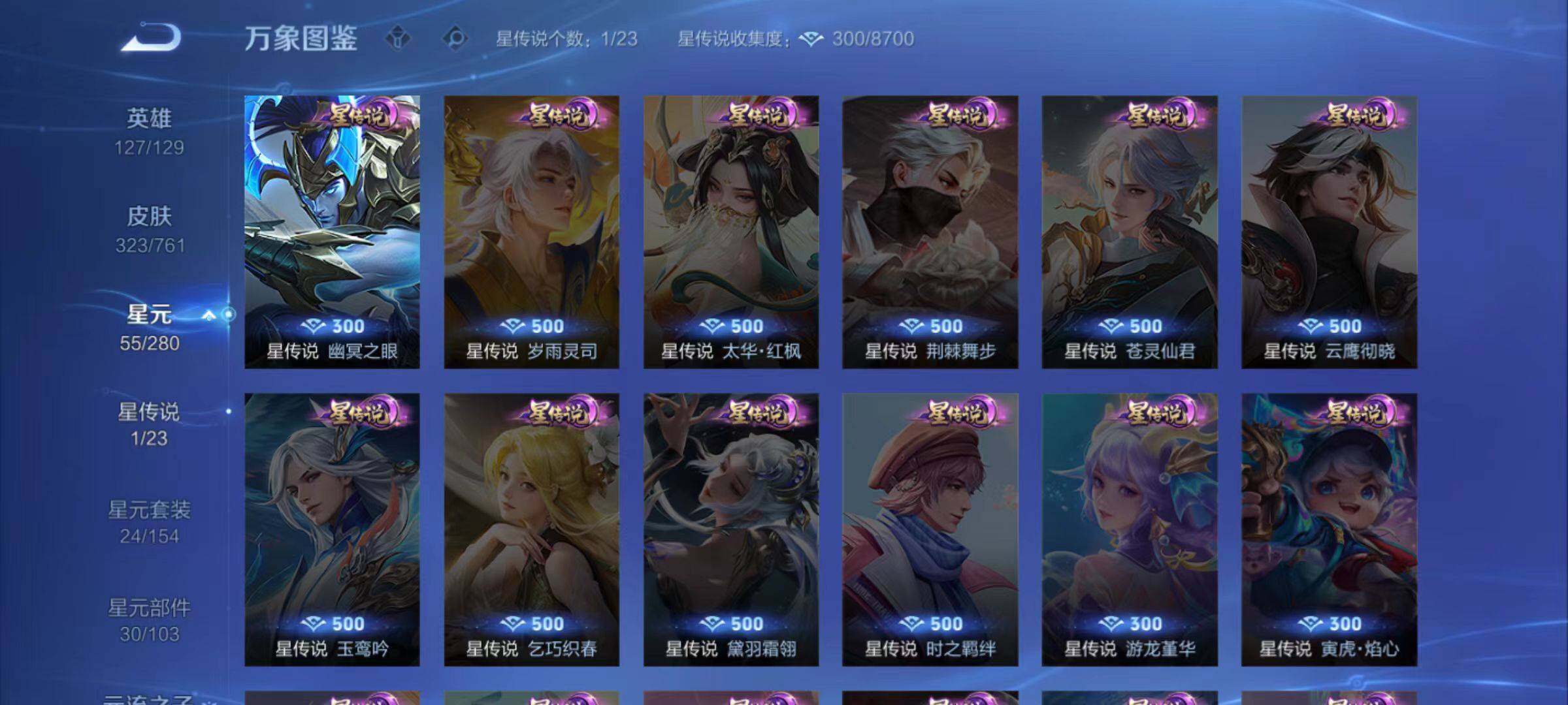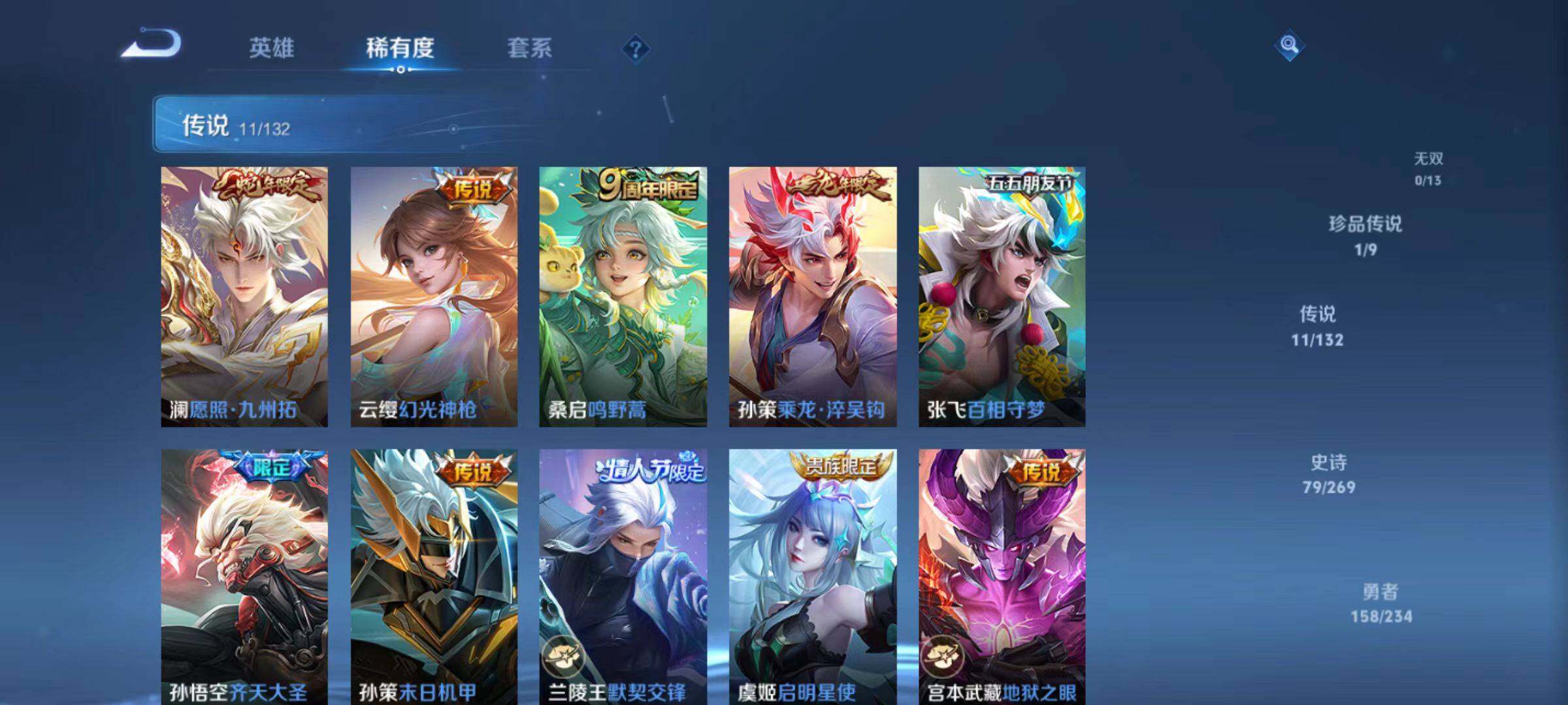 127英雄-323皮肤-安卓q-v8-永恒钻石i段位-127英雄-323皮肤-1典藏皮肤-1珍品传说-11传说-78史诗 【英雄全皮】:太乙真人全皮,狂铁全皮,蒙恬全皮,空空儿全皮 【荣耀典藏】:铠银白咏叹调 【珍品传说】:孙策时之奇旅 【传说皮肤】:澜愿照九州拓,云缨幻光神呛,桑启鸣野蒿,孙策乘龙淬吴钩,张飞百相守梦,孙