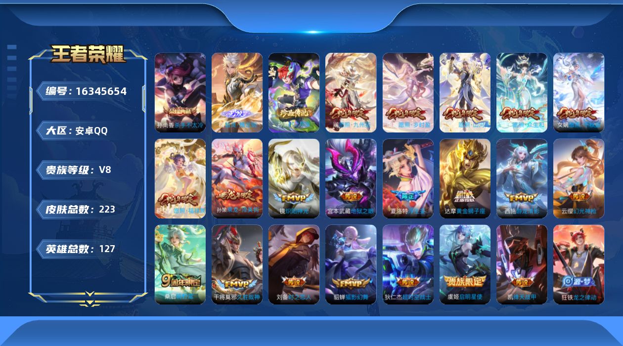 [16345654]【编号69807,可秒换绑】【高质量王者号!热门典藏无双,蛇年套,牌面拉满!!】,时之思念,安卓q-v8-最强王者段位-127英雄-223皮肤-1典藏皮肤-1无双-1珍品传说-20传说-51史诗 【英雄全皮】:鬼谷子全皮 【荣耀典藏】:孙尚香杀手不太冷 【无双皮肤】:曜器灵螭龙剑 【珍品传说】:孙策时之奇旅 【传说皮肤】:司空震愿照山河定,女娲愿照千秋盛,妲己愿照众生和,澜愿照九州拓,蔡文姬愿照福禄聚,虞姬愿照岁时盈,云缨幻光神呛,桑启鸣野蒿,孙策乘龙淬吴钩,夏洛特浮生妄,西施游龙清影,铠绛天战甲,镜炽阳神光,虞姬启明星使,刘备时之恋人,貂蝉猫影幻舞,干将莫邪久胜战神,达摩黄金狮子座,宫本武藏地狱之眼,狄仁杰超时空战士 【限定皮肤】:白起狰,姜子牙天穹之誓,狄仁杰阴阳师,赵云皇家上将,赵云引擎之心,嬴政白昼王子,孙尚香蔷薇恋人,高渐离玩趣恶龙,吕布猎兽之王,夏侯惇朔风刀,甄姬游园惊梦,典韦穷奇,马可波罗山海玄木吟,狄仁杰魔术师,狄仁杰万华元夜,达摩沙漠行僧,项羽海滩派对,老夫子圣诞老人,老夫子醍醐杖,程咬金演武夺筹,兰陵王金庭之子,孙悟空大圣娶亲,牛魔御旌,李元芳云中旅人,虞姬启明星使,钟馗驱傩正仪,太乙真人饕餮,鬼谷子原初探秘者,鬼谷子五谷丰年,苏烈千军破阵,弈星混沌棋,梦奇顽趣,沈梦溪大漠名商,明世隐疑决卦,裴擒虎李小龙,裴擒虎擒涛扼浪,狂铁御狮,米莱狄御霄,云中君纤云弄巧,盾山御銮,上官婉儿梁祝,嫦娥暖冬兔眠,西施玲珑珍味,鲁班大师探海日志,桑启海盐诗旅,夏洛特浮生妄,暃星界游侠,戈娅驭风魔法,阿古朵江河有灵,张良古海寻踪,鬼谷子天穹祈灯,孙策乘龙淬吴钩,沈梦溪龙舞盛年 【年限皮肤】:马可波罗山海玄木吟,孙策乘龙淬吴钩 【赛季限定】:白起狰,夏侯惇朔风刀,典韦穷奇,狄仁杰万华元夜,达摩沙漠行僧,老夫子醍醐杖,程咬金演武夺筹,兰陵王金庭之子,张良古海寻踪,牛魔御旌,李元芳云中旅人,钟馗驱傩正仪,太乙真人饕餮,鬼谷子原初探秘者,苏烈千军破阵,弈星混沌棋,梦奇顽趣,沈梦溪大漠名商,明世隐疑决卦,裴擒虎擒涛扼浪,狂铁御狮,米莱狄御霄,盾山御銮,鲁班大师探海日志,桑启海盐诗旅,鬼谷子天穹祈灯,姜子牙天穹之誓 【战令限定】:嬴政白昼王子,吕布猎兽之王,嫦娥暖冬兔眠,西施玲珑珍味,暃星界游侠,戈娅驭风魔法 【史诗皮肤】:鲁班七号电玩小子,阿轲暗夜猫娘,赵云皇家上将,貂蝉圣