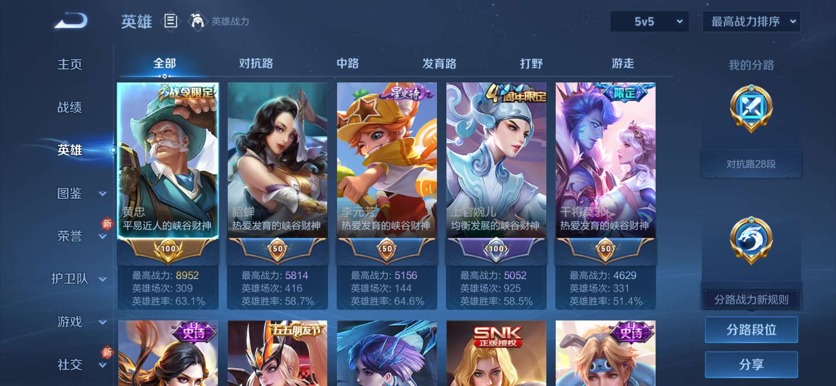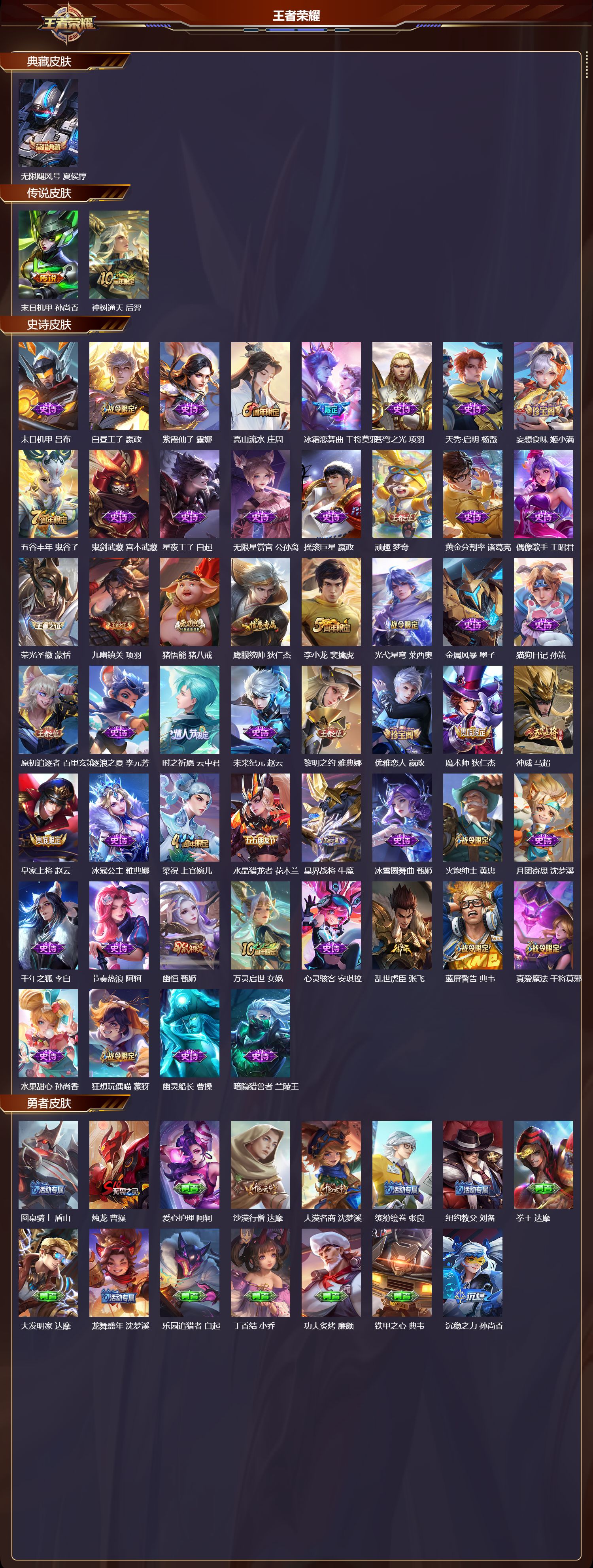 安卓qq/最强王者/244皮肤/126英雄/1典藏/0珍品无双/0无双/0珍品传说/2传说/52史诗/8稀有英雄【1 典藏皮肤】无限飓风号 夏侯惇【2 传说皮肤】末日机甲 孙尚香神树通天 后羿【52 史诗皮肤】末日机甲 吕布白昼王子 嬴政紫霞仙子 露娜高山流水 庄周冰霜恋舞曲 干将莫邪苍穹之光 项羽天秀·启明 杨戬妄想食味 姬小满五谷丰年 鬼谷子鬼剑武藏 宫本武藏星夜王子