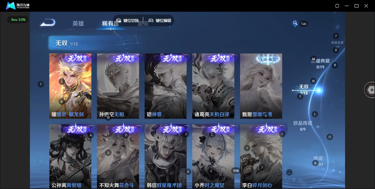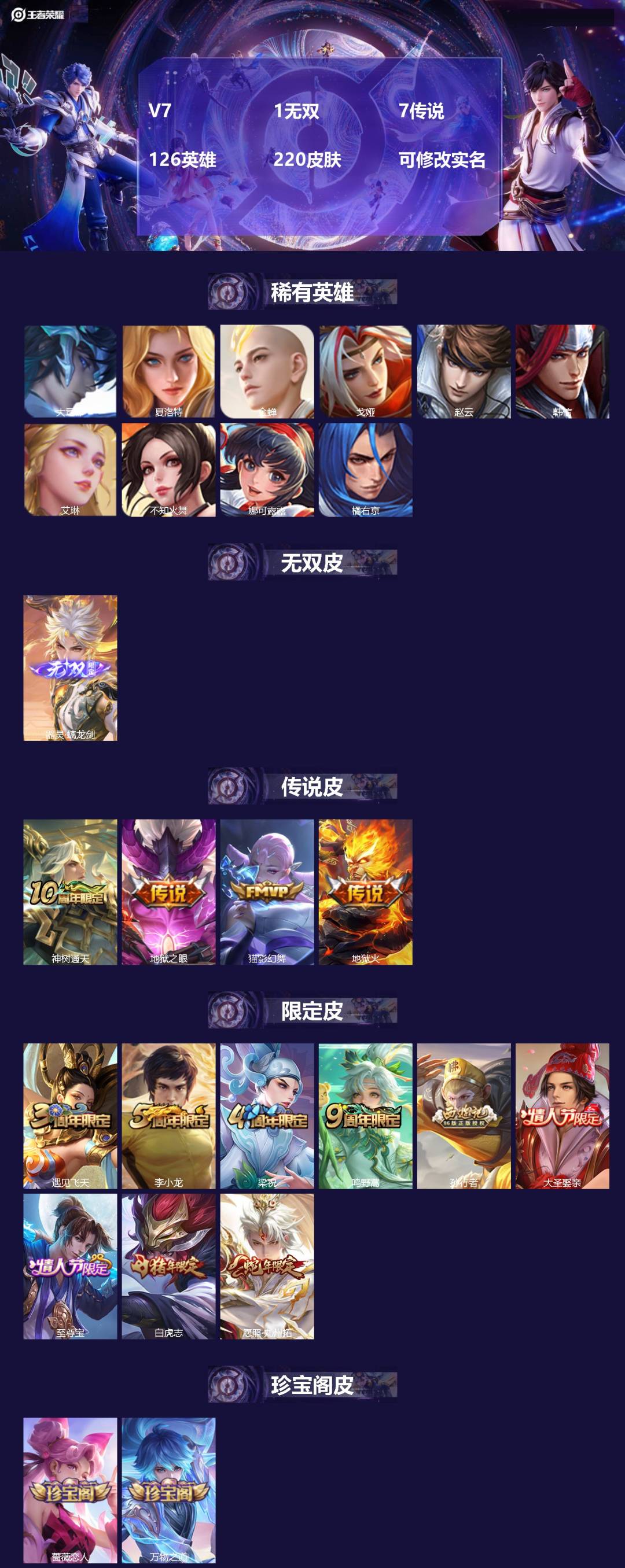[16173090]v7 1无双 7传说 126英雄 220皮肤 可修改实名 【英雄全皮】孙权全皮大禹全皮 【稀有英雄】大司命韩信韩跳跳夏洛特夏师傅艾琳橘右京橘子娜可露露鸟人不知火舞赵云金蝉唐僧戈娅 【无双皮】器灵·螭龙剑 【传说皮】神树通天地狱火地狱之
