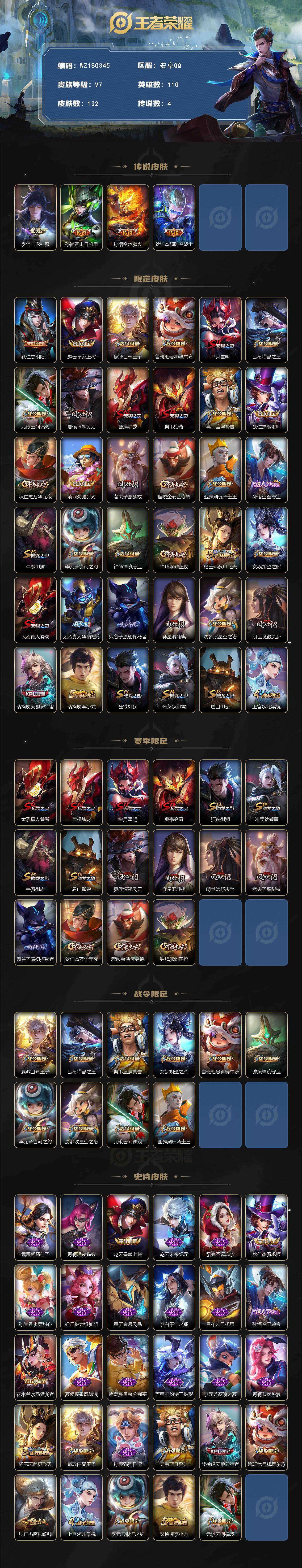 【wz180345】安卓q-v7-秩序白银i段位-110英雄-132皮肤-4传说-29史诗 【传说皮肤】:李信一念神魔,孙尚香末日机甲,孙悟空地狱火,狄仁杰超时空战士 【限定皮肤】:狄仁杰阴阳师,赵云皇家上将,嬴政白昼王子,鲁班七号狮舞东方,芈月重明,吕布猎兽之王,元歌云间偶戏,夏侯惇朔风刀,曹操烛龙,典韦穷奇,典韦蓝屏警告,狄仁杰魔术师,狄仁杰万华元夜,项羽海滩派对,老夫子醍醐杖,程咬金演武夺筹,亚瑟潮玩骑士王,孙悟空至尊宝,牛魔御旌,李元芳银河之约,钟馗神迹守卫,钟馗驱傩正仪,杨玉环遇见飞天,女娲朔望之晖,太乙真人饕餮,太乙真人华丽摇滚,鬼谷子原初探秘者,弈星混沌棋,沈梦溪星空之诺,明世隐疑决卦,裴擒虎天狼狩猎者,裴擒虎李小龙,狂铁御狮,米莱狄御霄,盾山御銮,上官婉儿梁祝 【赛季限定】:太乙真人饕餮,曹操烛龙,芈月重明,典韦穷奇,狂铁御狮,米莱狄御霄,牛魔御旌,盾山御銮,夏侯惇朔风刀,弈星混沌棋,明世隐疑决卦,老夫子醍醐杖,鬼谷子原初探秘者,狄仁杰万华元夜,程咬金演武夺筹,钟馗驱傩正仪 【战令限定】:嬴政白昼王子,吕布猎兽之王,典韦蓝屏警告,女娲朔望之晖,鲁班七号狮舞东方,钟馗神迹守卫,李元芳银河之约,沈梦溪星空之诺,元歌云间偶戏,亚瑟潮玩骑士王 【史诗皮肤】:露娜紫霞仙子,阿轲暗夜猫娘,赵云皇家上将,赵云未来纪元,貂蝉圣诞恋歌,狄仁杰魔术师,孙尚香水果甜心,妲己魅力维加斯,墨子金属风暴,李白千年之狐,吕布末日机甲,孙悟空至尊宝,花木兰水晶猎龙者,夏侯惇乘风破浪,诸葛亮黄金分割率,百里守约特工魅影,李元芳逐浪之夏,阿轲节奏热浪,杨玉环遇见飞天,嬴政白昼王子,孙策猫狗日记,典韦蓝屏警告,裴擒虎天狼狩猎者,鲁班七号狮舞东方,狄仁杰鹰眼统帅,上官婉儿梁祝,李元芳银河之约,裴擒虎李小龙,元歌云间偶戏 【其他皮肤】:项羽海滩派对,韩信教廷特使,韩信街头霸王,露娜哥特玫瑰,阿轲爱心护理,达摩大发明家,扁鹊化身博士,扁鹊救世之瞳,妲己少女阿狸,亚瑟死亡骑士,达摩拳王,张飞五福同心,宫本武藏万象初新,后羿阿尔法小队,狄仁杰阴阳师,刘备纽约教父,关羽龙腾万里,钟无艳海滩丽影,太乙真人饕餮,宫本武藏霸王丸,曹操烛龙,芈月重明,狂铁命运角斗场,老夫子功夫老勺,典韦穷奇,诸葛亮掌控之力,鬼谷子幻乐之宴,狂铁御狮,安琪拉如懿,太乙真人华丽摇滚,米莱狄御霄,吕布猎兽之王,明世隐虹云星官,庄周奇妙博物学,牛魔御旌,女娲朔望之晖,小乔丁香结,吕布野性能量,钟馗神迹守卫,盾山御銮,孙膑归虚梦演,沈梦溪鲨炮海盗猫,姜子牙炽热元素使,夏侯惇朔风刀,沈梦溪星空之诺,弈星混沌棋,哪吒次元突破,鲁班七号黑桃队长,明世隐疑决卦,盾山圆桌骑士,老夫子醍醐杖,鬼谷子原初探秘者,狄仁杰万华元夜,亚瑟潮玩骑士王,刘禅秘密基地,程咬金演武夺筹,张良缤纷绘卷,钟馗驱傩正仪,鲁班大师乓乓大师,鲁班七号福禄兄弟,鲁班七号木偶奇遇记,钟无艳生化警戒,貂蝉异域舞娘,曹操死神来了,孙悟空西部大镖客,周瑜海军大将,兰陵王隐刃,李白范海辛,钟馗地府判官,李元芳特种部队,刘邦圣殿之光,虞姬加勒比小姐,关羽天启骑士,夏侯惇战争骑士,雅典娜战争女神,马可波罗激情绿茵,苍维京掠夺者,太乙真人圆桌骑士,黄忠芝加哥教父,大乔伊势巫女,铠龙域领主,百里玄策威尼斯狂欢,梦奇美梦成真,公孙离花间舞,裴擒虎街头旋风,元歌午夜歌剧院,孙策海之征途,司马懿魇语军师,沈梦溪棒球奇才,李信灼热之刃,上官婉儿修竹墨客,盘古创世神祝,瑶森,曜归虚梦演,马超幸存者,镜冰刃幻境,蒙恬秩序猎龙将,阿古朵熊喵少女,澜孤猎 【