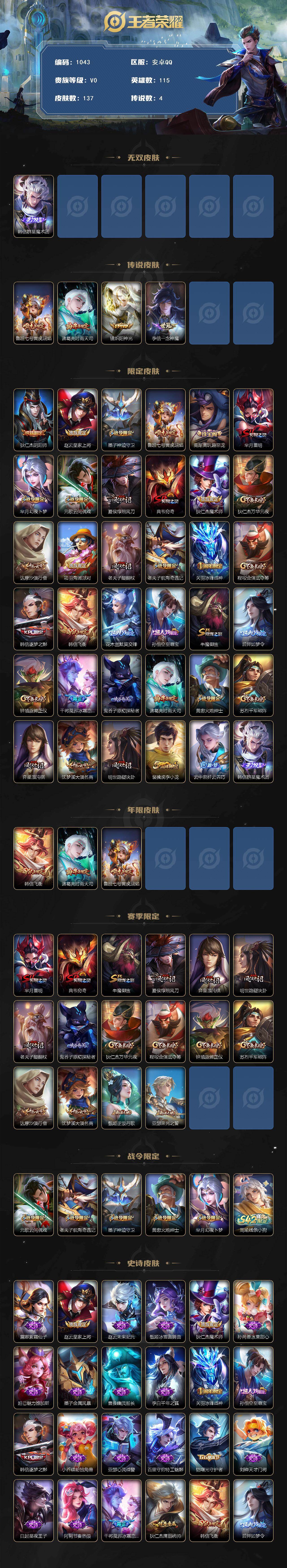 2157984 王者荣耀账号 安卓q-v0-永恒钻石v段位-115英雄-137皮肤-1无双-4传说-33史诗 【无双皮肤】:韩信群星魔术团 【传说皮肤】:鲁班七号寅虎瑞焰,诸葛亮时雨天司,镜炽阳神光,李信一念神魔 【限定皮肤】:狄仁杰阴阳师,赵云皇家上将,墨子神迹守卫,鲁班七号寅虎瑞焰,高渐离玩趣恶龙,芈月重明,芈月幻夜卜梦,元歌云间偶戏,夏侯惇朔风刀,典韦穷奇,狄仁杰魔术师,狄仁杰万华元夜,达摩沙漠行僧,项羽海滩派对,老夫子醍醐杖,老夫子航海奇遇记,关羽冰锋战神,程咬金演武夺筹,韩信逐梦之影,韩信飞衡,花木兰默契交锋,孙悟空至尊宝,牛魔御旌,后羿如梦令,钟馗驱傩正仪,干将莫邪冰霜恋舞曲,鬼谷子原初探秘者,诸葛亮时雨天司,黄忠火炮绅士,苏烈千军破阵,弈星混沌棋,沈梦溪大漠名商,明世隐疑决卦,裴擒虎李小龙,云中君纤云弄巧,韩信群星魔术团 【年限皮肤】:韩信飞衡,诸葛亮时雨天司,鲁班七号寅虎瑞焰 【赛季限定】:芈月重明,典韦穷奇,牛魔御旌,夏侯惇朔风刀,弈星混沌棋,明世隐疑决卦,老夫子醍醐杖,鬼谷子原初探秘者,狄仁杰万华元夜,程咬金演武夺筹,钟馗驱傩正仪,苏烈千军破阵,达摩沙漠行僧,沈梦溪大漠名商,甄姬逆浪荇歌,亚瑟荣光之誓 【战令限定】:元歌云间偶戏,老夫子航海奇遇记,墨子神迹守卫,黄忠火炮绅士,芈月幻夜卜梦,周瑜线条小狗 【史诗皮肤】:露娜紫霞仙子,赵云皇家上将,赵云未来纪元,甄姬冰雪圆舞曲,狄仁杰魔术师,孙尚香水果甜心,妲己魅力维加斯,墨子金属风暴,曹操幽灵船长,李白千年之狐,关羽冰锋战神,孙悟空至尊宝,韩信逐梦之影,小乔缤纷独角兽,亚瑟心灵战警,百里守约特工魅影,铠曙光守护者,刘禅天才门将,白起星夜王子,阿轲节奏热浪,干将莫邪冰霜恋舞曲,狄仁杰鹰眼统帅,韩信飞衡,后羿如梦令,不知火舞魅语,裴擒虎李小龙,云中君纤云弄巧,元歌云间偶戏,花木兰默契交锋,老夫子航海奇遇记,黄忠火炮绅士,哪吒雪上飞焰,黄忠百相守梦,周瑜线条小狗 【其他皮肤】:项羽海滩派对,韩信教廷特使,韩信街头霸王,露娜哥特玫瑰,达摩大发明家,赵云忍炎影,芈月红桃皇后,扁鹊化身博士,扁鹊救世之瞳,安琪拉玩偶对对碰,孙膑天使之翼,姜子牙时尚教父,妲己少女阿狸,典韦黄金武士,亚瑟死亡骑士,达摩拳王,张飞五福同心,刘备万事如意,狄仁杰阴阳师,刘备汉昭烈帝,关羽龙腾万里,墨子进击墨子号,钟无艳海滩丽影,宫本武藏霸王丸,芈月重明,狂铁命运角斗场,孙尚香沉稳之力,典韦穷奇,苏烈坚韧之力,项羽科学大爆炸,庄周奇妙博物学,牛魔御旌,小乔丁香结,吕布野性能量,高渐离玩趣恶龙,沈梦溪鲨炮海盗猫,姜子牙炽热元素使,夏侯惇朔风刀,弈星混沌棋,哪吒次元突破,鲁班七号黑桃队长,明世隐疑决卦,盾山圆桌骑士,老夫子醍醐杖,狂铁特工战影,鬼谷子原初探秘者,狄仁杰万华元夜,杨戬次元傲视,露娜瓷语鉴心,程咬金演武夺筹,张良缤纷绘卷,钟馗驱傩正仪,墨子神迹守卫,鲁班大师乓乓大师,苏烈千军破阵,达摩沙漠行僧,芈月幻夜卜梦,沈梦溪大漠名商,甄姬逆浪荇歌,亚瑟荣光之誓,鲁班七号木偶奇遇记,露娜绯红之刃,花木兰剑舞者,狄仁杰锦衣卫,曹操死神来了,小乔万圣前夜,孙膑未来旅行,孙悟空西部大镖客,周瑜海军大将,后羿精灵王,刘禅英喵野望,兰陵王隐刃,李白范海辛,虞姬加勒比小姐,夏侯惇战争骑士,马可波罗激情绿茵,苍维京掠夺者,杨戬埃及法老,诸葛亮星航指挥官,黄忠芝加哥教父,干将莫邪第七人偶,鬼谷子阿摩司公爵,铠龙域领主,百里守约绝影神呛,苏烈爱与和平,梦奇美梦成真,公孙离花间舞,裴擒虎街头旋风,元歌午夜歌剧院,司马懿魇语军师,李信灼热之刃,上官婉儿修竹墨客,猪八戒年年有余,盘古创世神祝,曜归虚梦演,马超幸存者,镜冰刃幻境,蒙恬秩序猎龙将 【内测皮肤】:高渐离玩趣恶龙,狂铁特工战影 【