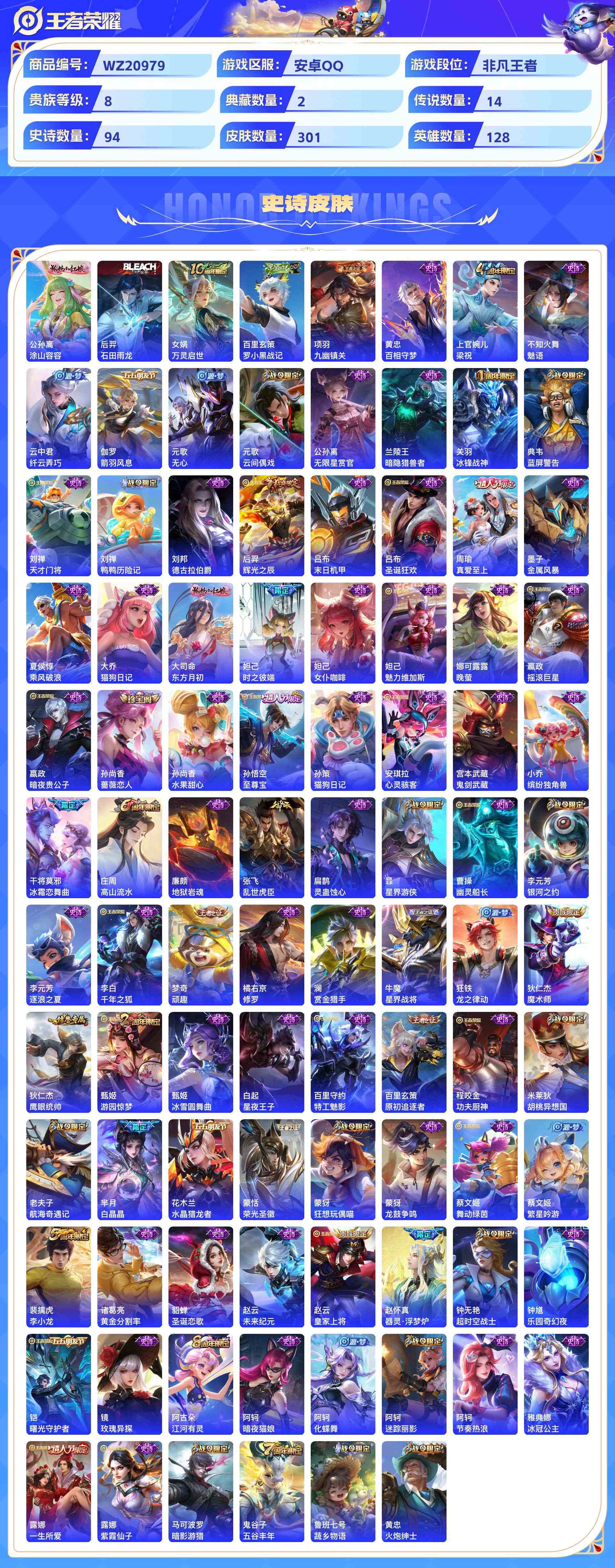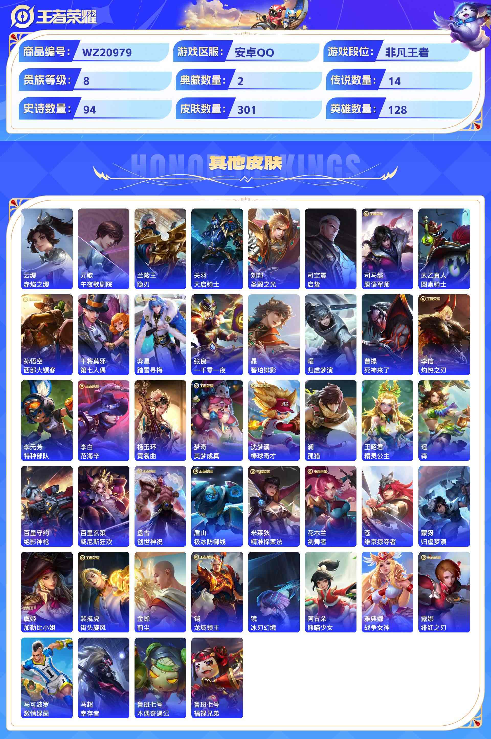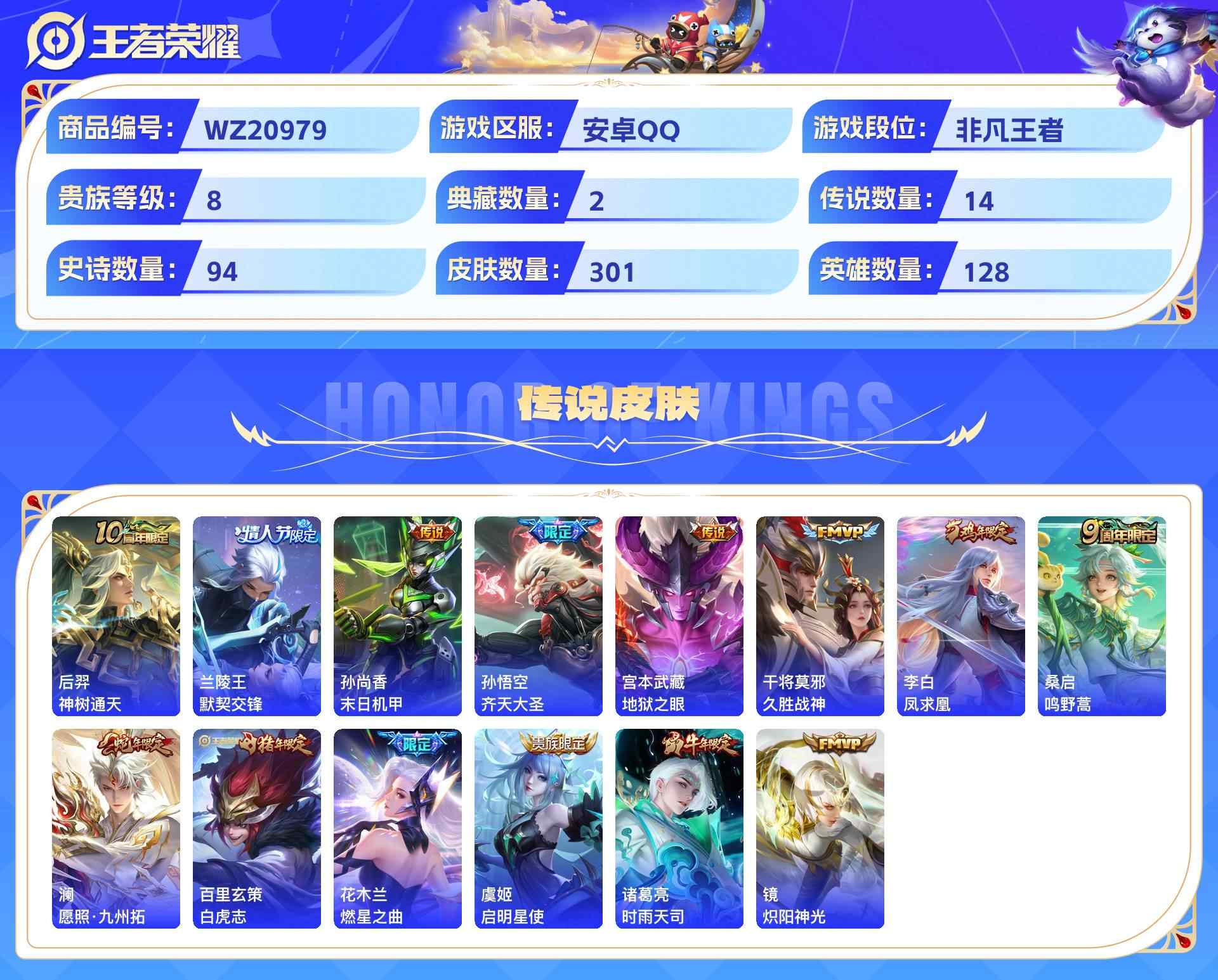 wz20979|精品小号安卓qq301皮贵族8级2典藏(全息碎影弑呛猎影)14传说(凤求凰 白虎志 时雨天司 原照 九州拓)94史诗(至尊宝 蓝屏警告)2星传说9个性按键