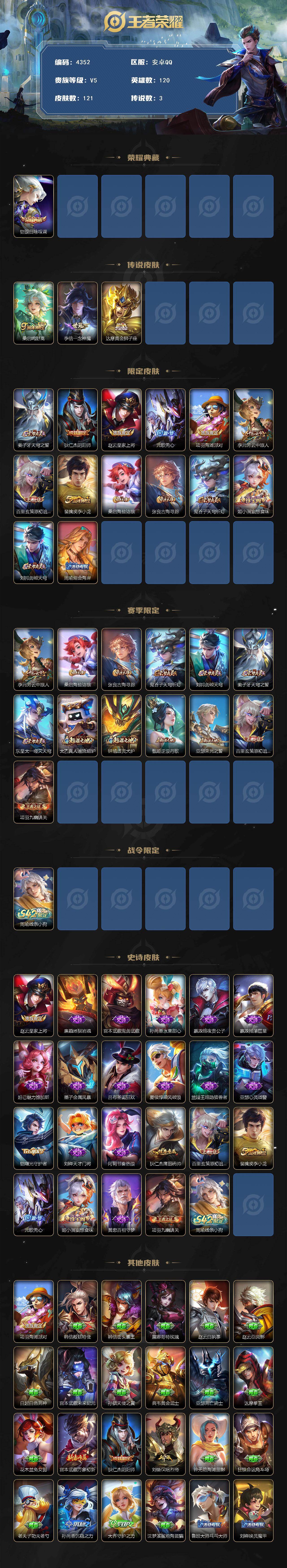安卓q-v5-最强王者段位-120英雄-121皮肤-1典藏皮肤-3传说-22史诗 【英雄全皮】:孙权全皮 【荣耀典藏】:铠银白咏叹调 【传说皮肤】:桑启鸣野蒿,李信一念神魔,达摩黄金狮子座 【限定皮肤】:姜子牙天穹之誓,狄仁杰阴阳师,赵云皇家上将,元歌无心,项羽海滩派对,李元芳云中旅人,百里玄策原初追逐者,裴擒虎李小龙,桑启海盐诗旅,张良古海寻踪,鬼谷子天穹祈灯,姬小满妄想食味,刘邦剑破天穹,周瑜熔金海岸 【赛季限定】:李元芳云中旅人,桑启海盐诗旅,张良古海寻踪,鬼谷子天穹祈灯,刘邦剑破天穹,姜子牙天穹之誓,东皇太一噬灭天穹,太乙真人谧流熔炉,钟馗虚灵犬护,甄姬逆浪荇歌,亚瑟荣光之誓,百里玄策原初追逐者,项羽九幽镇关 【战令限定】:周瑜线条小狗 【史诗皮肤】:赵云皇家上将,廉颇地狱岩魂,宫本武藏鬼剑武藏,孙尚香水果甜心,嬴政暗夜贵公子,嬴政摇滚巨星,妲己魅力维加斯,墨子金属风暴,吕布圣诞狂欢,夏侯惇乘风破浪,兰陵王暗隐猎兽者,亚瑟心灵战警,铠曙光守护者,刘禅天才门将,阿轲节奏热浪,狄仁杰鹰眼统帅,百里玄策原初追逐者,裴擒虎李小龙,元歌无心,姬小满妄想食味,黄忠百相守梦,项羽九幽镇关,周瑜线条小狗 【其他皮肤】:项羽海滩派对,韩信教廷特使,韩信街头霸王,露娜哥特玫瑰,赵云白执事,赵云忍炎影,白起白色死神,宫本武藏未来纪元,孙膑天使之翼,典韦黄金武士,亚瑟死亡骑士,达摩拳王,花木兰兔女郎,宫本武藏万象初新,狄仁杰阴阳师,刘备汉昭烈帝,钟无艳海滩丽影,狂铁命运角斗场,老夫子功夫老勺,孙尚香沉稳之力,大乔守护之力,沈梦溪鲨炮海盗猫,鲁班大师乓乓大师,刘禅唤灵魔甲,蒙恬蔚蓝守将,李元芳云中旅人,桑启海盐诗旅,猪八戒潮玩探月行,张良古海寻踪,鬼谷子天穹祈灯,廉颇功夫炙烤,刘邦剑破天穹,姜子牙天穹之誓,周瑜熔金海岸,东皇太一噬灭天穹,干将莫邪雾都夜雨,苍苍林狼骑,太乙真人谧流熔炉,典韦铁骨偃魂,西施雪境奇遇,明世隐景韶洛都,戈娅玫蓝誓约,刘备浪漫序章,钟馗虚灵犬护,张良灵野札记,阿古朵布丁狗之约,露娜命运加冕,姬小满小满鸭,白起死霸装,甄姬逆浪荇歌,庄周锦麟游梦,莱西奥踏浪烽翎,鬼谷子克喵,哪吒罗小黑战记,亚瑟荣光之誓,孙权径山谋武,艾琳鹤鸣心笺,蚩奼极光幻客,虞姬溯影追猎,露娜绯红之刃,老夫子潮流仙人,王昭君精灵公主,狄仁杰锦衣卫,孙悟空西部大镖客,刘禅英喵野望,钟馗地府判官,李元芳特种部队,虞姬加勒比小姐,关羽天启骑士,夏侯惇战争骑士,雅典娜战争女神,马可波罗激情绿茵,杨戬埃及法老,诸葛亮星航指挥官,黄忠芝加哥教父,干将莫邪第七人偶,鬼谷子阿摩司公爵,百里守约绝影神呛,百里玄策威尼斯狂欢,苏烈爱与和平,明世隐占星师,杨玉环霓裳曲,裴擒虎街头旋风,弈星踏雪寻梅,元歌午夜歌剧院,司马懿魇语军师,沈梦溪棒球奇才,李信灼热之刃,嫦娥露花倒影,盘古创世神祝,澜孤猎,司空震启蛰,云缨赤焰之缨,暃碧珀绯影 【营地id】:1675126406