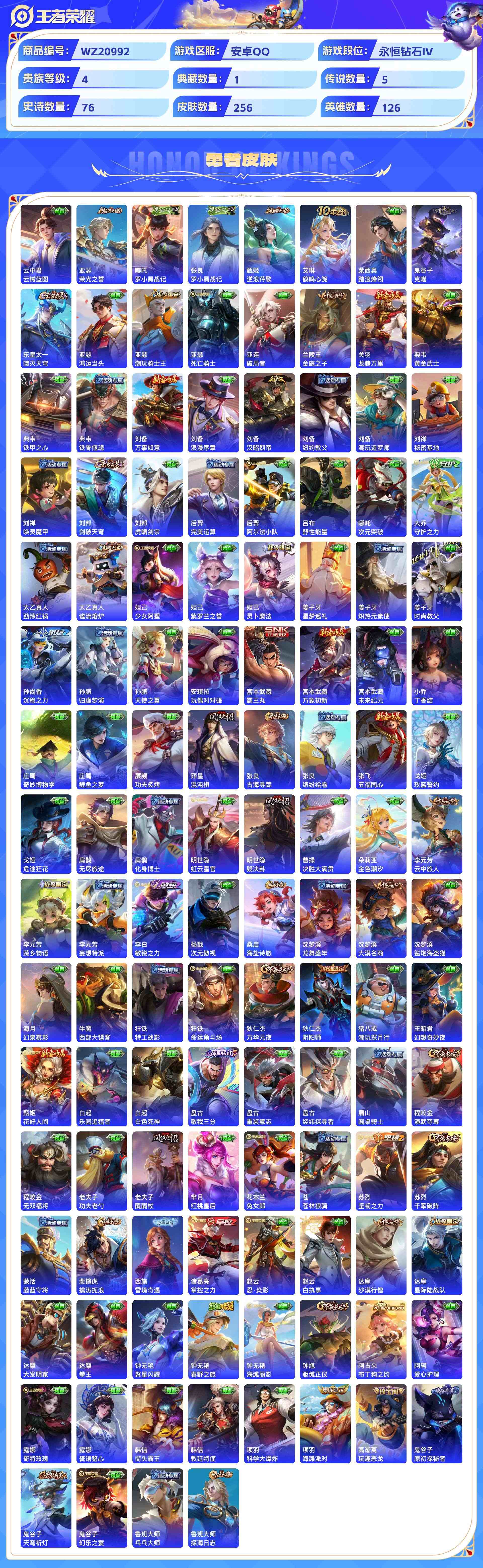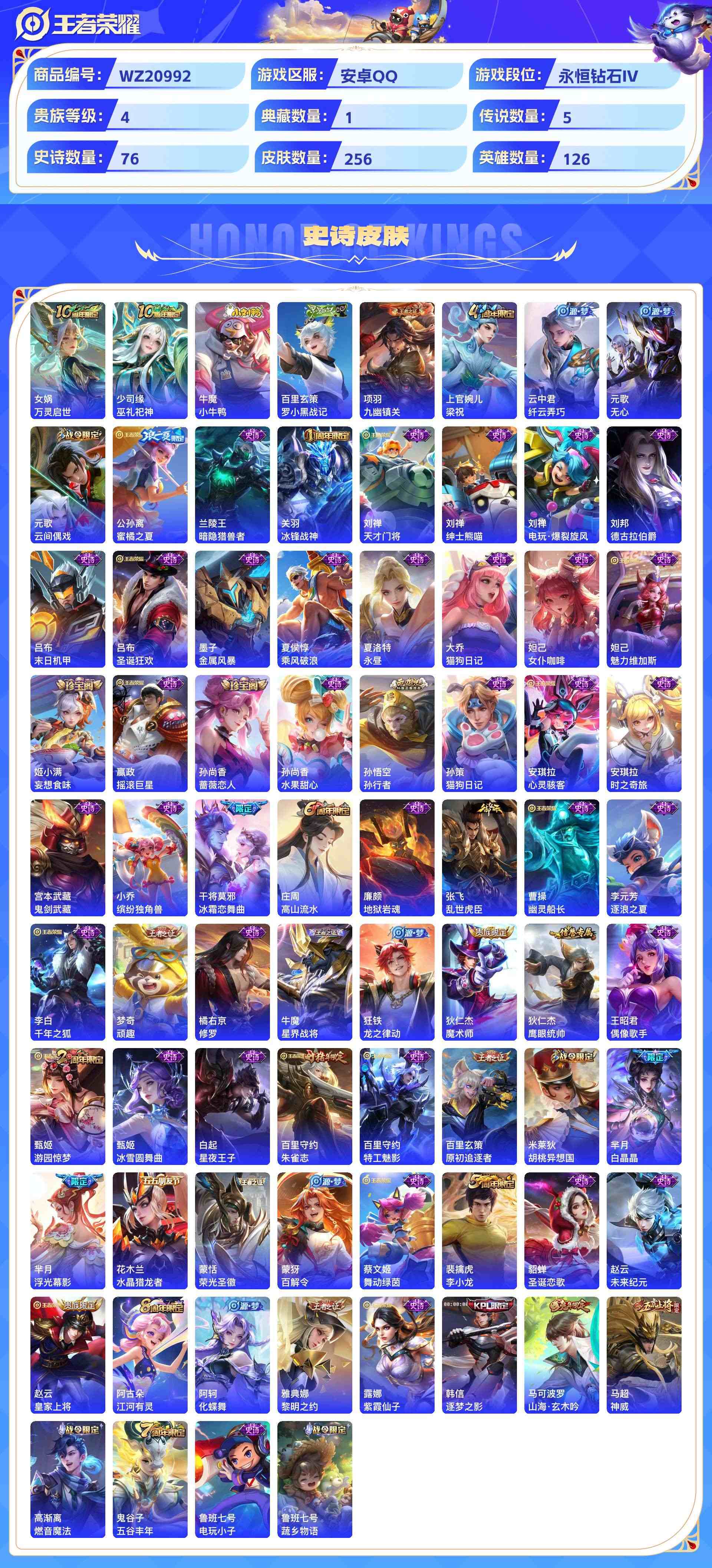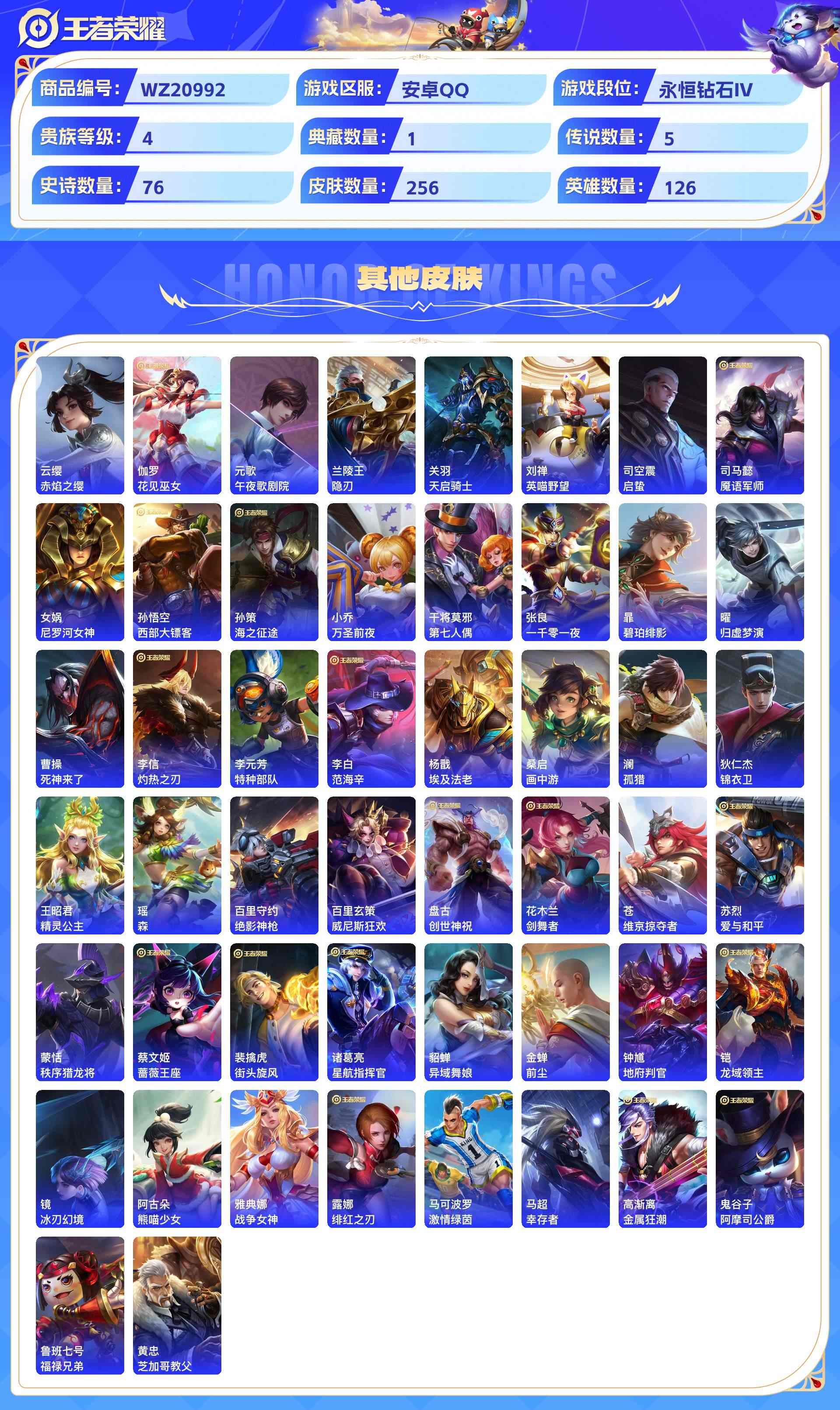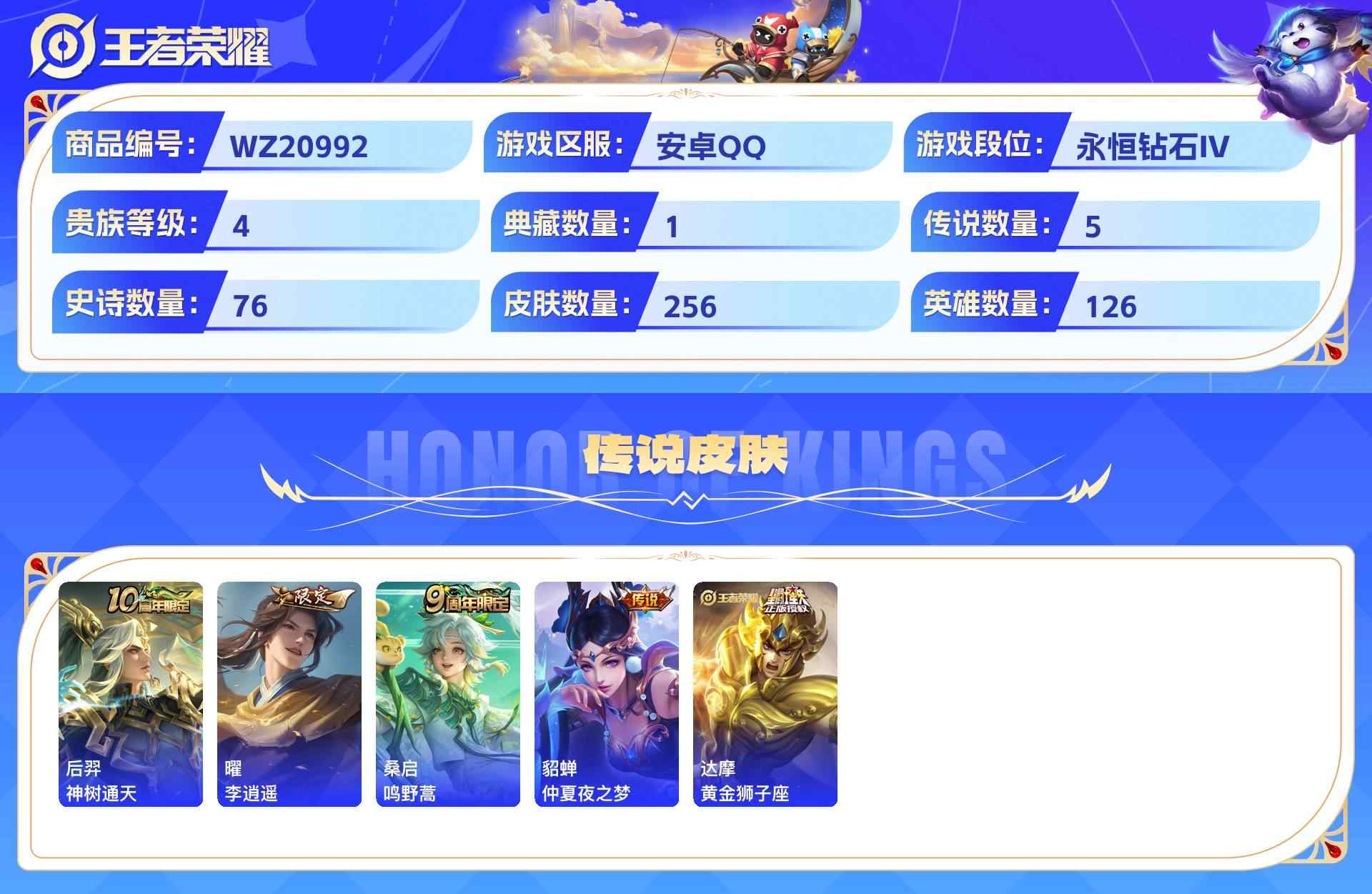 wz20992|可二次入坑号安卓qq256皮贵族4级1典藏5传说76史诗【荣耀典藏】鸣剑·曳影【传说皮肤】神树通天李 鸣野蒿仲夏夜之梦黄金狮子座【史诗皮肤】万灵启世巫礼祀神小牛鸭罗小黑战记九幽镇关1星传说5个性按键