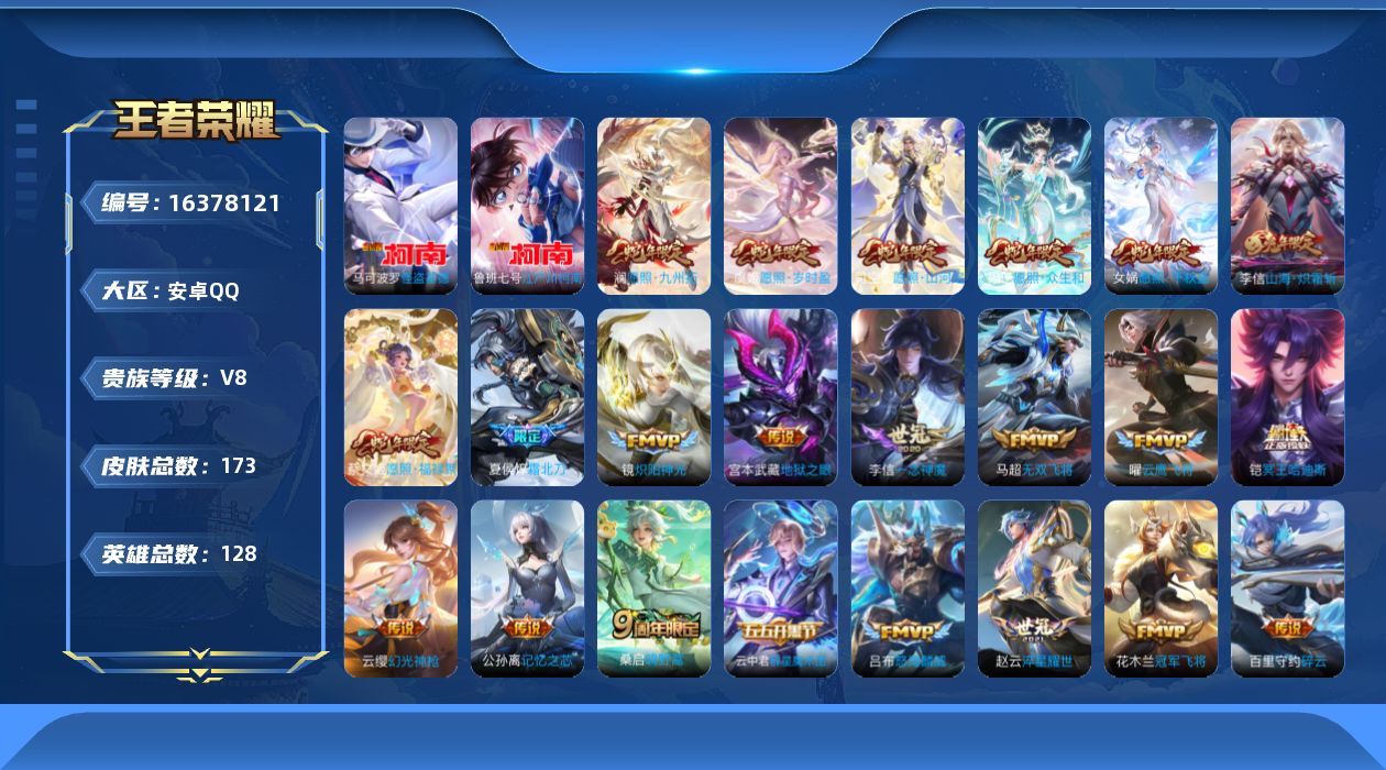 [16378121]v8-173皮肤-2珍品传说-24传说-53史诗 ll5832 【英雄全皮】:李信全皮,影全皮 【珍品传说】:马可波罗怪盗基德,鲁班七号江户川柯南 【传说皮肤】:司空震愿照山河定,女娲愿照千秋盛,妲己愿照众生和,澜愿照九州拓,蔡文姬愿照福禄聚,虞姬愿照岁时盈,云缨幻光神呛,桑启鸣野蒿,夏侯惇霜北刀,铠冥王哈迪斯,云中君群星魔术团,澜电玩雷克斯,公孙离记忆之芯,李信山海炽霜斩,吕布怒海麟威,百里守约碎云,马超无双飞将,赵云淬星耀世,镜炽阳神光,虞姬启明星使,曜云鹰飞将,李信一念神魔,花木兰冠军飞将,宫本武藏地狱之眼 【限定皮肤】:夏侯惇霜北刀,铠冥王哈迪斯,暃埋骨钱,蔡文姬夏日便利店,大乔绒语心约,虞姬夏日便利店,姜子牙天穹之誓,李白谪仙醉月,狄仁杰阴阳师,赵云皇家上将,元歌无心,马可波罗山海玄木吟,狄仁杰魔术师,狄仁杰万华元夜,项羽海滩派对,老夫子醍醐杖,兰陵王金庭之子,花木兰默契交锋,刘备百相守梦,李元芳云中旅人,虞姬启明星使,钟馗驱傩正仪,鬼谷子五谷丰年,百里玄策原初追逐者,沈梦溪大漠名商,沈梦溪匿光破解者,裴擒虎擒涛扼浪,李信山海炽霜斩,鲁班大师探海日志,桑启海盐诗旅,艾琳女武神,艾琳流音漫舞,张良古海寻踪,鬼谷子天穹祈灯,姬小满妄想食味,沈梦溪龙舞盛年,刘邦剑破天穹,云中君群星魔术团,海诺心动手记,周瑜熔金海岸 【年限皮肤】:李信山海炽霜斩,马可波罗山海玄木吟,司空震愿照山河定,女娲愿照千秋盛,妲己愿照众生和,澜愿照九州拓,蔡文姬愿照福禄聚,虞姬愿照岁时盈 【赛季限定】:老夫子醍醐杖,狄仁杰万华元夜,钟馗驱傩正仪,兰陵王金庭之子,沈梦溪大漠名商,李元芳云中旅人,桑启海盐诗旅,裴擒虎擒涛扼浪,鲁班大师探海日志,张良古海寻踪,鬼谷子天穹祈灯,刘邦剑破天穹,姜子牙天穹之誓,东皇太一噬灭天穹,太乙真人谧流熔炉,钟馗虚灵犬护,百里玄策原初追逐者,牛魔星界战将 【战令限定】:艾琳流音漫舞,蔡文姬夏日便利店,虞姬夏日便利店,亚连破空之剑,孙悟空神迹守卫,百里守约百相守梦,老夫子百相守梦,孙膑茶境仙,马超访茗客,莱西奥光弋星穹,明世隐往忆晖光,周瑜线条小狗 【史诗皮肤】:露娜紫霞仙子,赵云皇家上将,赵云未来纪元,貂蝉圣诞恋歌,甄姬冰雪圆舞曲,狄仁杰魔术师,宫本武藏鬼剑武藏,孙尚香水果甜心,嬴政摇滚巨星,吕布末日机甲,张飞乱世虎臣,花木兰水晶猎龙者,刘邦德古拉伯爵,兰陵王暗