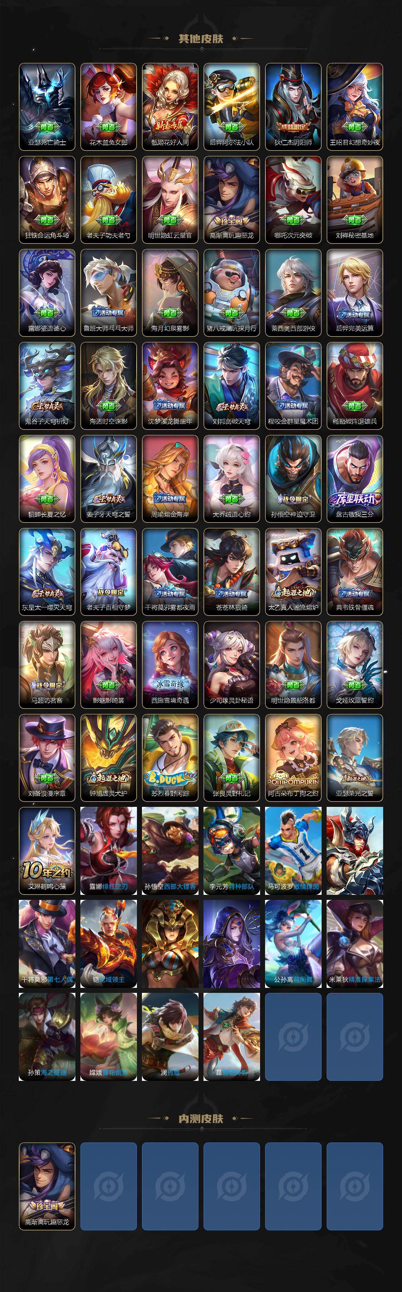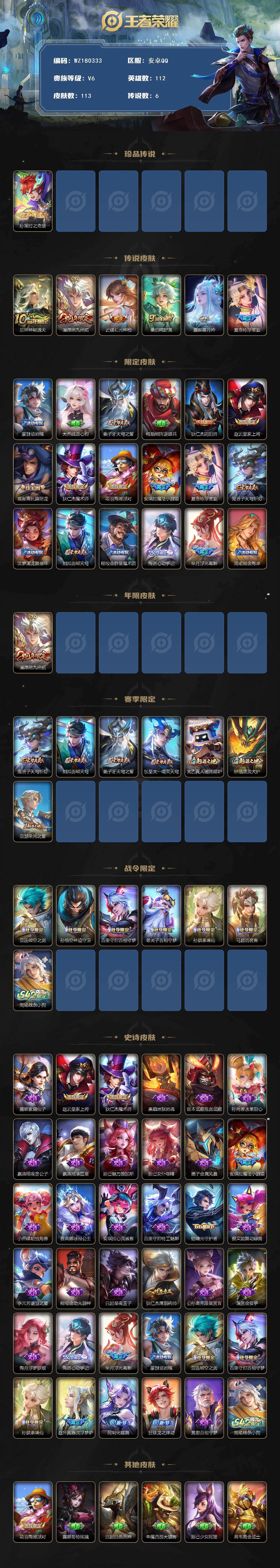 【wz180333】113皮肤-1珍品传说-6传说-35史诗 【珍品传说】:孙策时之奇旅 【传说皮肤】:后羿神树通天,澜愿照九州拓,云缨幻光神呛,桑启鸣野蒿,露娜霜月吟,夏洛特浮生妄 【限定皮肤】:蒙犽顽岩魄,大乔绒语心约,姜子牙天穹之誓,杨戬破阵退雄兵,狄仁杰阴阳师,赵云皇家上将,高渐离玩趣恶龙,狄仁杰魔术师,项羽海滩派对,安琪拉魔法小厨娘,夏洛特浮生妄,鬼谷子天穹祈灯,沈梦溪龙舞盛年,刘邦剑破天穹,程咬金群星魔术团,海诺心动手记,芈月浮光幕影,周瑜熔金海岸 【年限皮肤】:澜愿照九州拓 【赛季限定】:鬼谷子天穹祈灯,刘邦剑破天穹,姜子牙天穹之誓,东皇太一噬灭天穹,太乙真人谧流熔炉,钟馗虚灵犬护,亚瑟荣光之誓 【战令限定】:亚连破空之剑,孙悟空神迹守卫,百里守约百相守梦,老夫子百相守梦,孙膑茶境仙,马超访茗客,周瑜线条小狗 【史诗皮肤】:露娜紫霞仙子,赵云皇家上将,狄仁杰魔术师,廉颇地狱岩魂,宫本武藏鬼剑武藏,孙尚香水果甜心,嬴政暗夜贵公子,嬴政摇滚巨星,妲己魅力维加斯,妲己女仆咖啡,墨子金属风暴,安琪拉魔法小厨娘,小乔缤纷独角兽,雅典娜冰冠公主,安琪拉心灵骇客,百里守约特工魅影,铠曙光守护者,蔡文姬舞动绿茵,李元芳逐浪之夏,程咬金功夫厨神,白起星夜王子,狄仁杰鹰眼统帅,公孙离无限星赏官,澜赏金猎手,海月浮梦罗烟,海诺心动手记,芈月浮光幕影,蒙犽顽岩魄,亚连破空之剑,百里守约百相守梦,孙膑茶境仙,赵怀真器灵浮梦炉,阿轲化蝶舞,狂铁龙之律动,黄忠百相守梦,周瑜线条小狗 【其他皮肤】:项羽海滩派对,露娜哥特玫瑰,白起白色死神,牛魔西部大镖客,妲己少女阿狸,典韦黄金武士,亚瑟死亡骑士,花木兰兔女郎,甄姬花好人间,后羿阿尔法小队,狄仁杰阴阳师,王昭君幻想奇妙夜,狂铁命运角斗场,老夫子功夫老勺,明世隐虹云星官,高渐离玩趣恶龙,哪吒次元突破,刘禅秘密基地,露娜瓷语鉴心,鲁班大师乓乓大师,海月幻泉雾影,猪八戒潮玩探月行,莱西奥西部游侠,后羿完美运算,鬼谷子天穹祈灯,海诺时空谍影,沈梦溪龙舞盛年,刘邦剑破天穹,程咬金群星魔术团,杨戬破阵退雄兵,貂蝉长夏之忆,姜子牙天穹之誓,周瑜熔金海岸,大乔绒语心约,孙悟空神迹守卫,盘古敬我三分,东皇太一噬灭天穹,老夫子百相守梦,干将莫邪雾都夜雨,苍苍林狼骑,太乙真人谧流熔炉,典韦铁骨偃魂,马超访茗客,影魅影绮裳,西施雪境奇遇,少司缘灵卦秘语,明世隐景韶洛都,戈娅玫蓝誓约,刘备浪漫序章,钟馗虚灵犬护,苏烈春野闲踪,张良灵野札记,阿古朵布丁狗之约,亚瑟荣光之誓,艾琳鹤鸣心笺,露娜绯红之刃,孙悟空西部大镖客,李元芳特种部队,马可波罗激情绿茵,苍维京掠夺者,干将莫邪第七人偶,铠龙域领主,女娲尼罗河女神,明世隐占星师,公孙离花间舞,米莱狄精准探案法,孙策海之征途,嫦娥露花倒影,澜孤猎,暃碧珀绯影 【内测皮肤】:高渐离玩趣恶龙 【