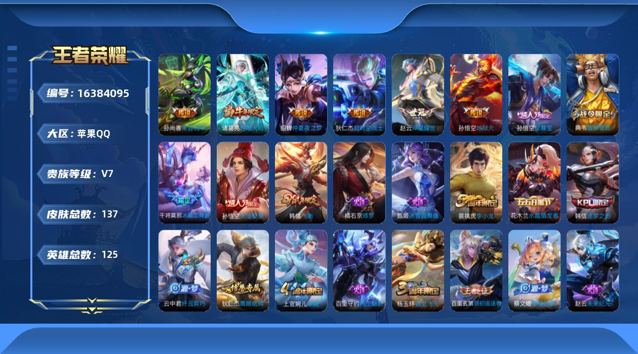 [16384095]v7 6传说 125英雄 137皮肤 可修改实名 男号 【稀有英雄】大司命嬴政始皇帝韩信韩跳跳夏洛特夏师傅艾琳橘右京橘子娜可露露鸟人不知火舞赵云戈娅 【传说皮】地狱火仲夏夜之梦大飞蛾末日机甲-孙尚香绿蚂蚱淬星耀世超时空战士-狄仁杰 【赛季/战令皮】天穹祈灯s34凯尔特女王s7狰s8饕餮s9烛龙s10重明s11穷奇s12御狮s13御霄s14御旌s15御銮s16朔风刀s17混沌棋s18疑决卦s19醍醐杖s20原初探秘者s21万华元夜s22演武夺筹s23驱傩正仪s24猎兽之王白昼王子朔望之晖蓝屏警告 【史诗皮】特工魅影修罗水果甜心天才门将功夫厨神德古拉伯爵暗隐猎兽者纤云弄巧繁星吟游呼啦呼啦水晶猎龙者箭羽风息原初追逐者鹰眼统帅魅力维加斯未来纪元-赵云 【限定皮】至尊宝时雨天司水龙头飞衡韩信年限遇见飞天梁祝李小龙逐梦之影大圣娶亲冰霜恋舞曲乒乒小将 【普通皮】鬼谷子天穹祈灯s34威尼斯狂欢万事如意五福同心龙腾万里花好人间归虚梦演-蒙犽归虚梦演-曜海滩丽影海滩派对皇家上将魔术师掌控之力守护之力坚韧之力霸王丸化身博士炽热元素使缤纷绘卷纽约教父圆桌骑士(盾山)乓乓大师万象初新次元突破大发明家天使之翼功夫老勺鲨炮海盗猫教廷特使进击墨子号阴阳师汉昭烈帝兔女郎死亡骑士少女阿狸忍·炎影黑桃队长奇妙博物学秘密基地爱心护理野性能量冰雪圆舞曲拳王科学大爆炸玩偶对对碰幻想奇妙夜阿尔法小队次元傲视幻乐之宴虹云星官露花倒影修竹墨客灼热之刃荷鲁斯之眼花见巫女三太子龙域领主地府判官埃及法老生化警戒福禄兄弟异域舞娘星航指挥官战争女神激情绿茵加勒比小姐赤焰之缨美梦成真秩序猎龙将创世神祝魇语军师午夜歌剧院街头旋风花间舞绝影神呛天启骑士致命风华特种部队隐刃绯红之刃西部大镖客-孙悟空锦衣卫一千零一夜华尔街大亨潮玩探月行