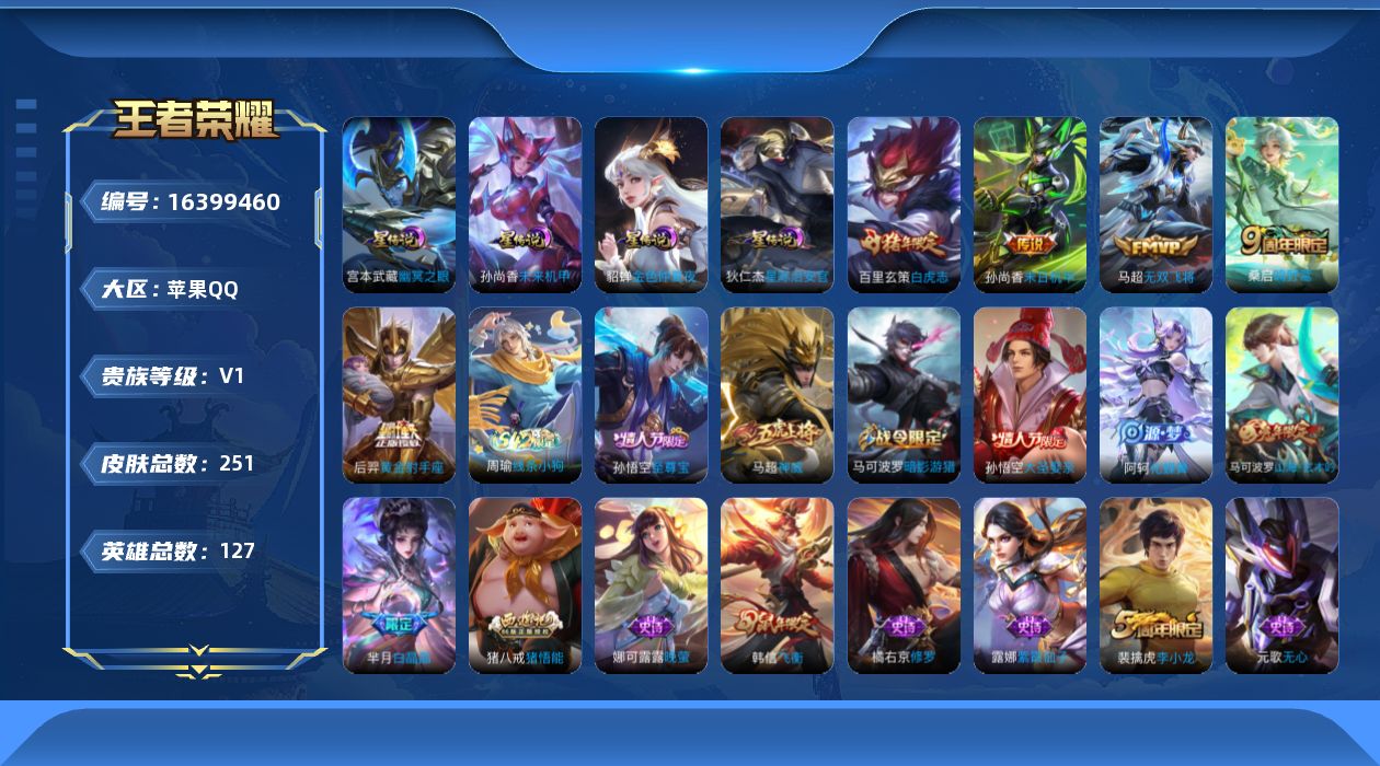 [16399460]【特价出售/店主推荐/2省标/8市标/37段发育路/33段打野】:苹果q-v6-永恒钻石iv段位-127英雄-251皮肤-4星元-5传说-62史诗 【英雄全皮】:猪八戒全皮 【传说皮肤】:桑启鸣野蒿,马超无双飞将,百里玄策白虎志,后羿黄金射手座,孙尚香末日机甲 【限定皮肤】:白起狰,大乔绒语心约,姜子牙天穹之誓,狄仁杰阴阳师,虞姬凯尔特女王,赵云皇家上将,嬴政优雅恋人,嬴政白昼王子,孙尚香蔷薇恋人,鲁班七号狮舞东方,庄周高山流水,高渐离死亡摇滚,高渐离玩趣恶龙,扁鹊炼金王,芈月重明,芈月白晶晶,吕布猎兽之王,元歌无心,夏侯惇朔风刀,甄姬游园惊梦,曹操烛龙,典韦穷奇,马可波罗暗影游猎,马可波罗山海玄木吟,狄仁杰魔术师,狄仁杰万华元夜,达摩沙漠行僧,项羽海滩派对,老夫子醍醐杖,程咬金演武夺筹,韩信逐梦之影,韩信飞衡,兰陵王金庭之子,孙悟空至尊宝,孙悟空大圣娶亲,牛魔御旌,李元芳云中旅人,钟馗神迹守卫,钟馗驱傩正仪,雅典娜单词大作战,雅典娜黎明之约,蔡文姬繁星吟游,太乙真人饕餮,太乙真人华丽摇滚,鬼谷子原初探秘者,鬼谷子五谷丰年,苏烈千军破阵,百里玄策白虎志,百里玄策原初追逐者,弈星混沌棋,梦奇顽趣,沈梦溪大漠名商,明世隐疑决卦,裴擒虎李小龙,裴擒虎擒涛扼浪,狂铁御狮,米莱狄御霄,云中君纤云弄巧,盾山御銮,猪八戒西部大镖客,猪八戒猪悟能,上官婉儿梁祝,嫦娥拒霜思,蒙犽狂想玩偶喵,鲁班大师探海日志,桑启海盐诗旅,艾琳女武神,张良古海寻踪,蒙恬荣光圣徽,鬼谷子天穹祈灯,刘邦剑破天穹,程咬金群星魔术团,周瑜熔金海岸 【年限皮肤】:百里玄策白虎志,韩信飞衡,马超神威,马可波罗山海玄木吟 【赛季限定】:扁鹊炼金王,白起狰,芈月重明,夏侯惇朔风刀,曹操烛龙,典韦穷奇,狄仁杰万华元夜,达摩沙漠行僧,老夫子醍醐杖,程咬金演武夺筹,兰陵王金庭之子,张良古海寻踪,牛魔御旌,李元芳云中旅人,虞姬凯尔特女王,钟馗驱傩正仪,雅典娜黎明之约,太乙真人饕餮,鬼谷子原初探秘者,苏烈千军破阵,百里玄策原初追逐者,弈星混沌棋,梦奇顽趣,沈梦溪大漠名商,明世隐疑决卦,裴擒虎擒涛扼浪,狂铁御狮,米莱狄御霄,盾山御銮,鲁班大师探海日志,桑启海盐诗旅,鬼谷子天穹祈灯,蒙恬荣光圣徽,刘邦剑破天穹,姜子牙天穹之誓 【战令限定】:嬴政白昼王子,鲁班七号狮舞东方,吕布猎兽之王,马可波罗暗影游猎,钟馗神迹守卫,雅典娜单词大